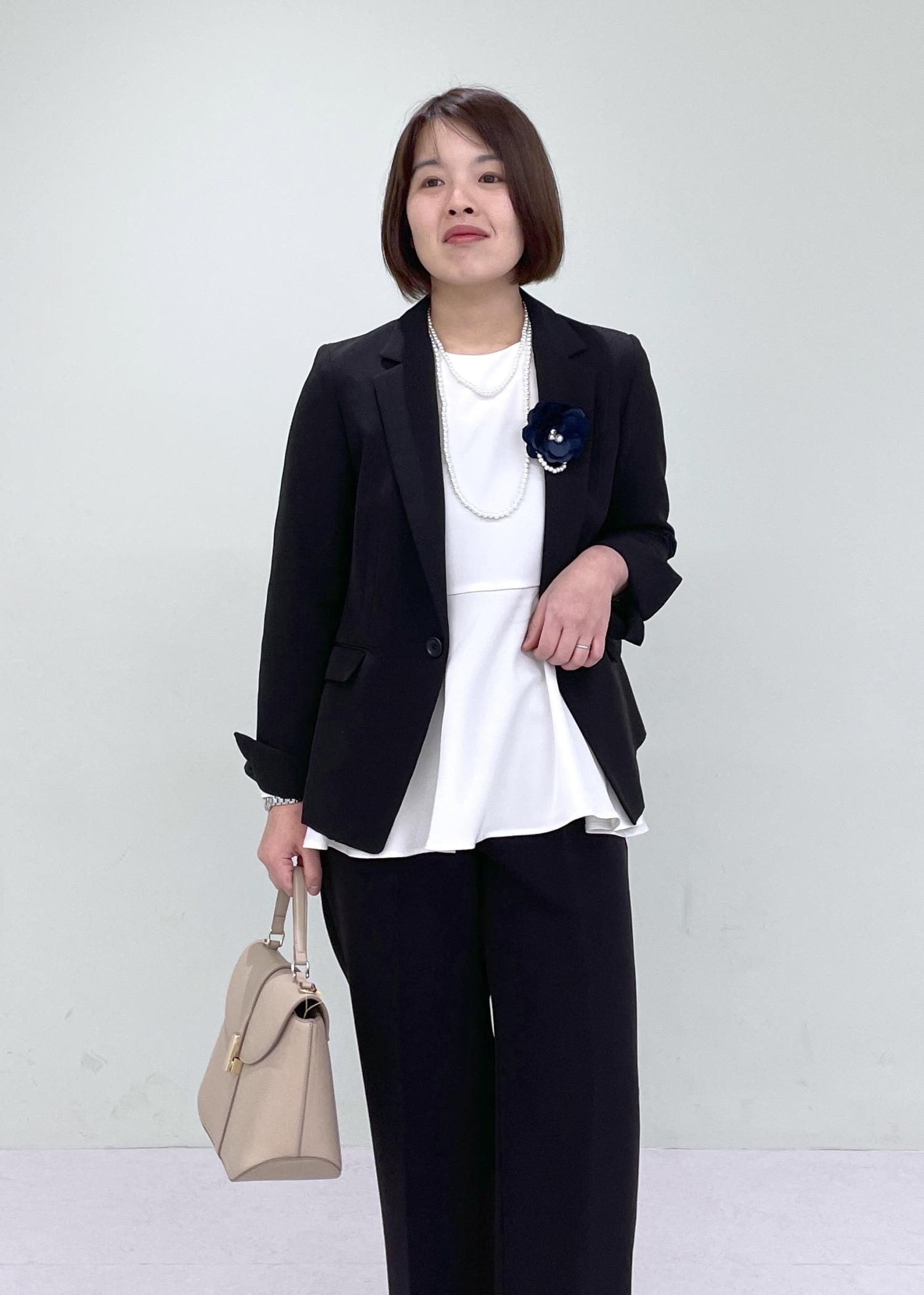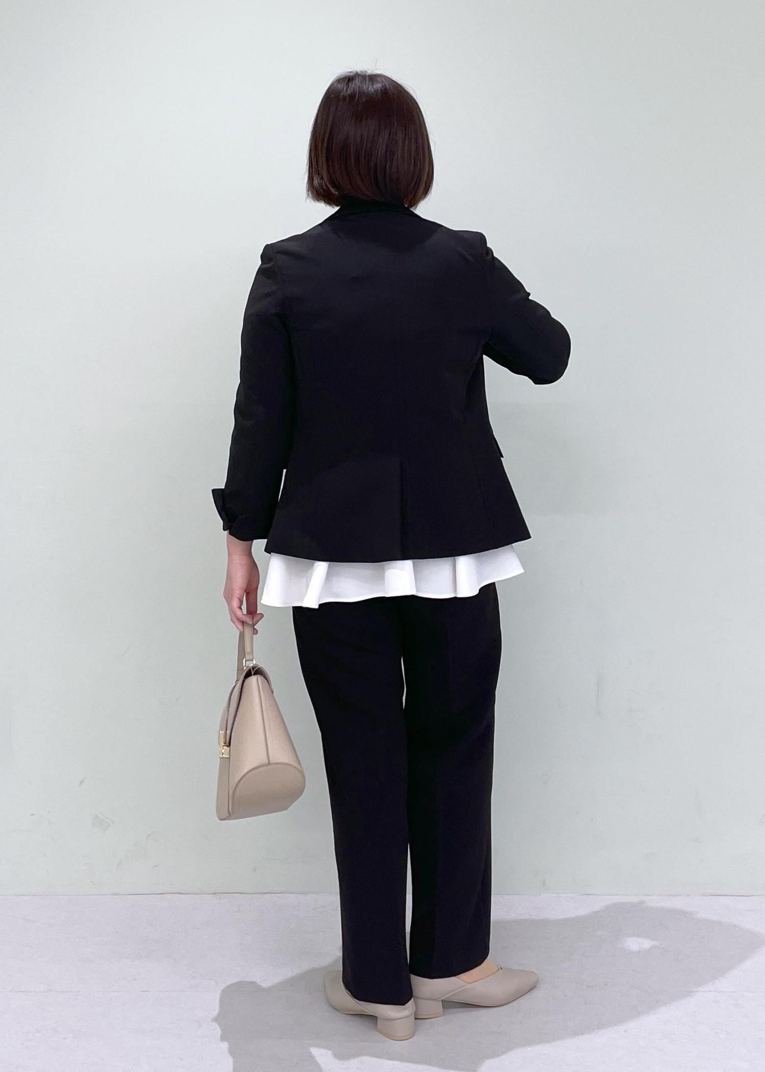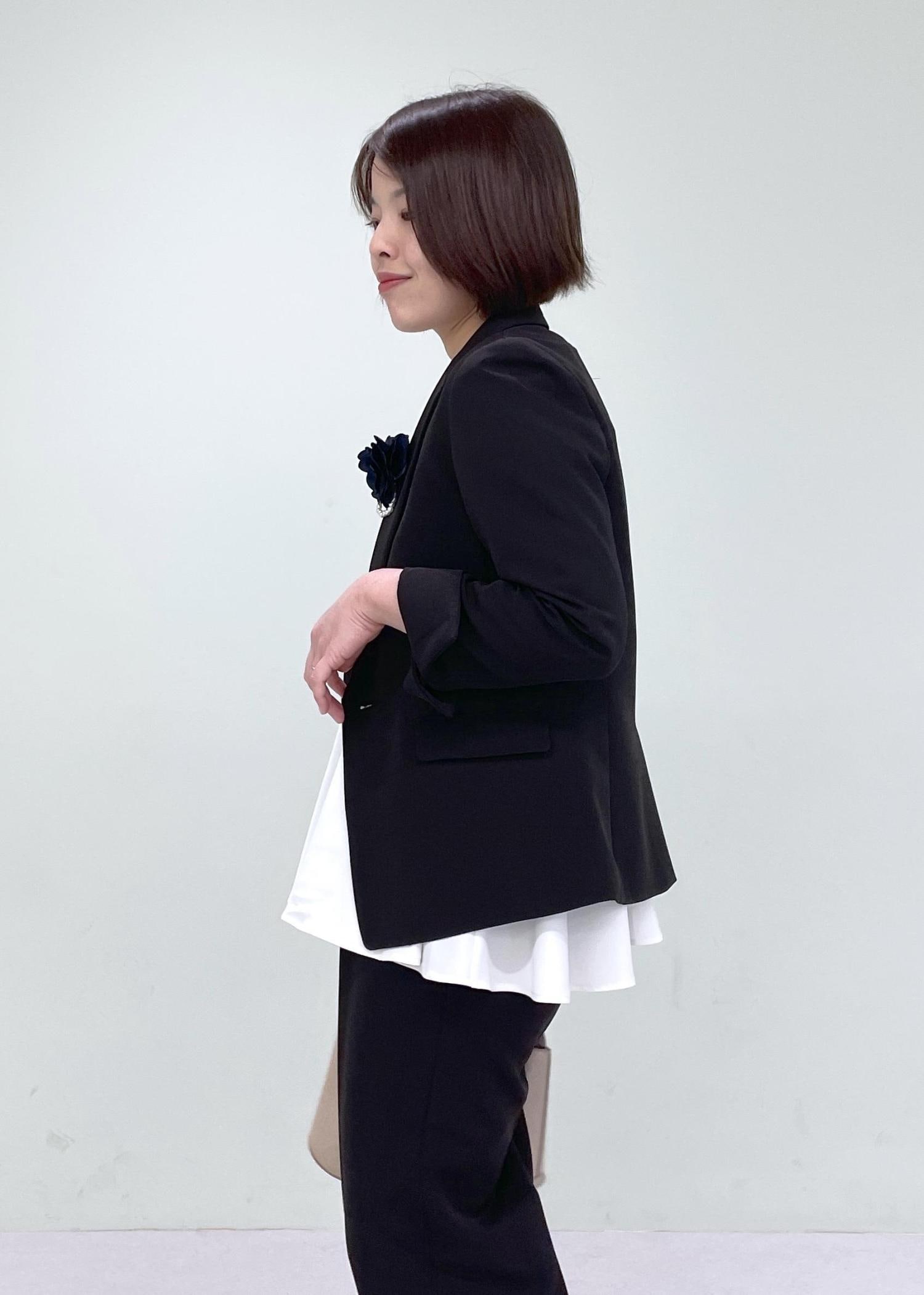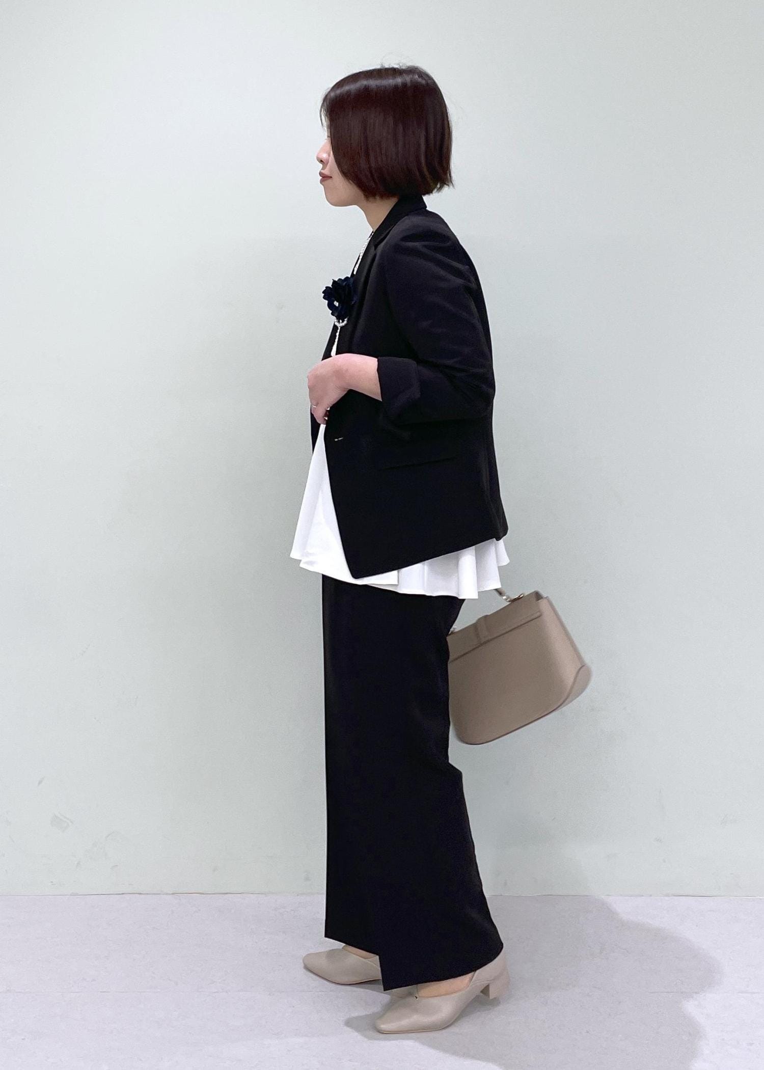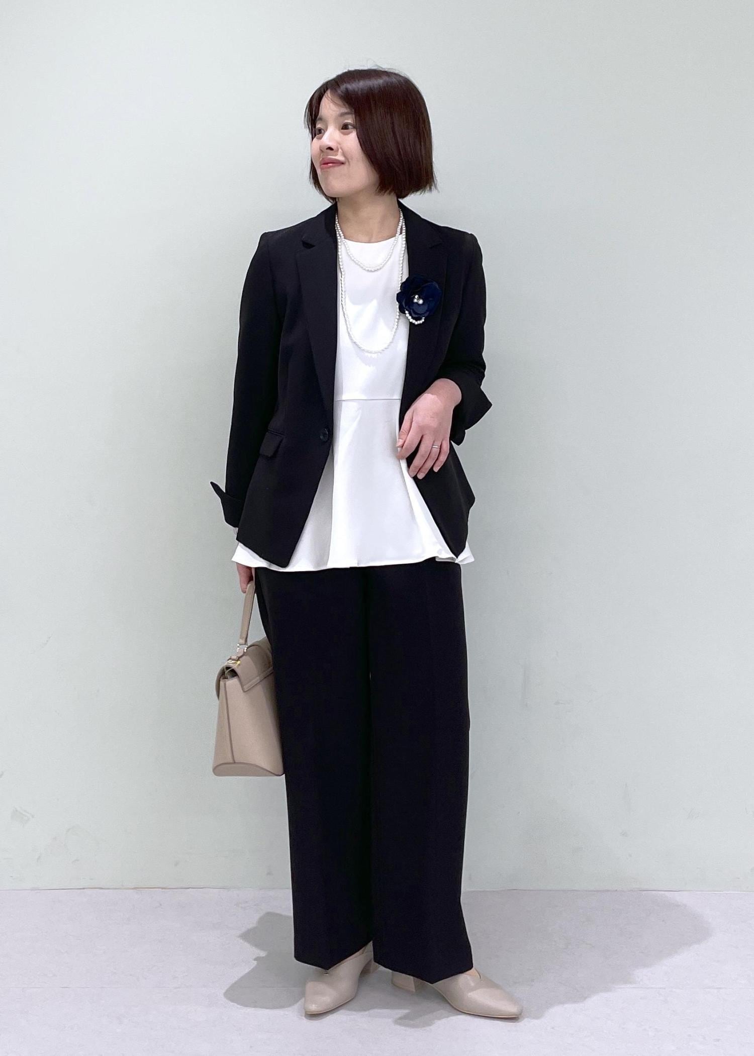 ブラックのテーラードジャケットとワイドパンツを使ったセレモニーコーデです!