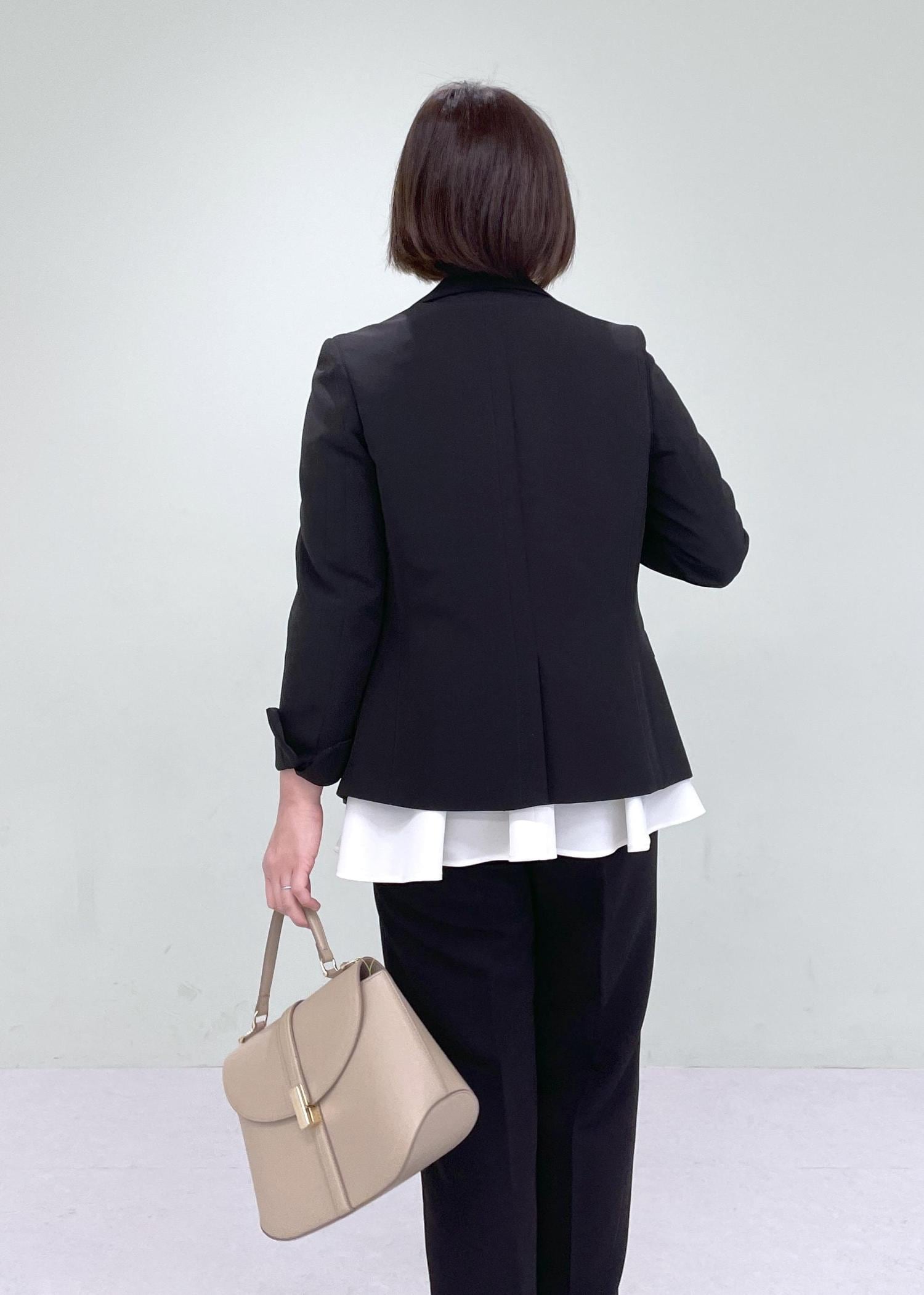 ジャケットのインナーにはフレアラインが女性らしい白のブラウスを合わせ、小物はベージュ系のアイテムでまとめることで柔らかな印象に◎