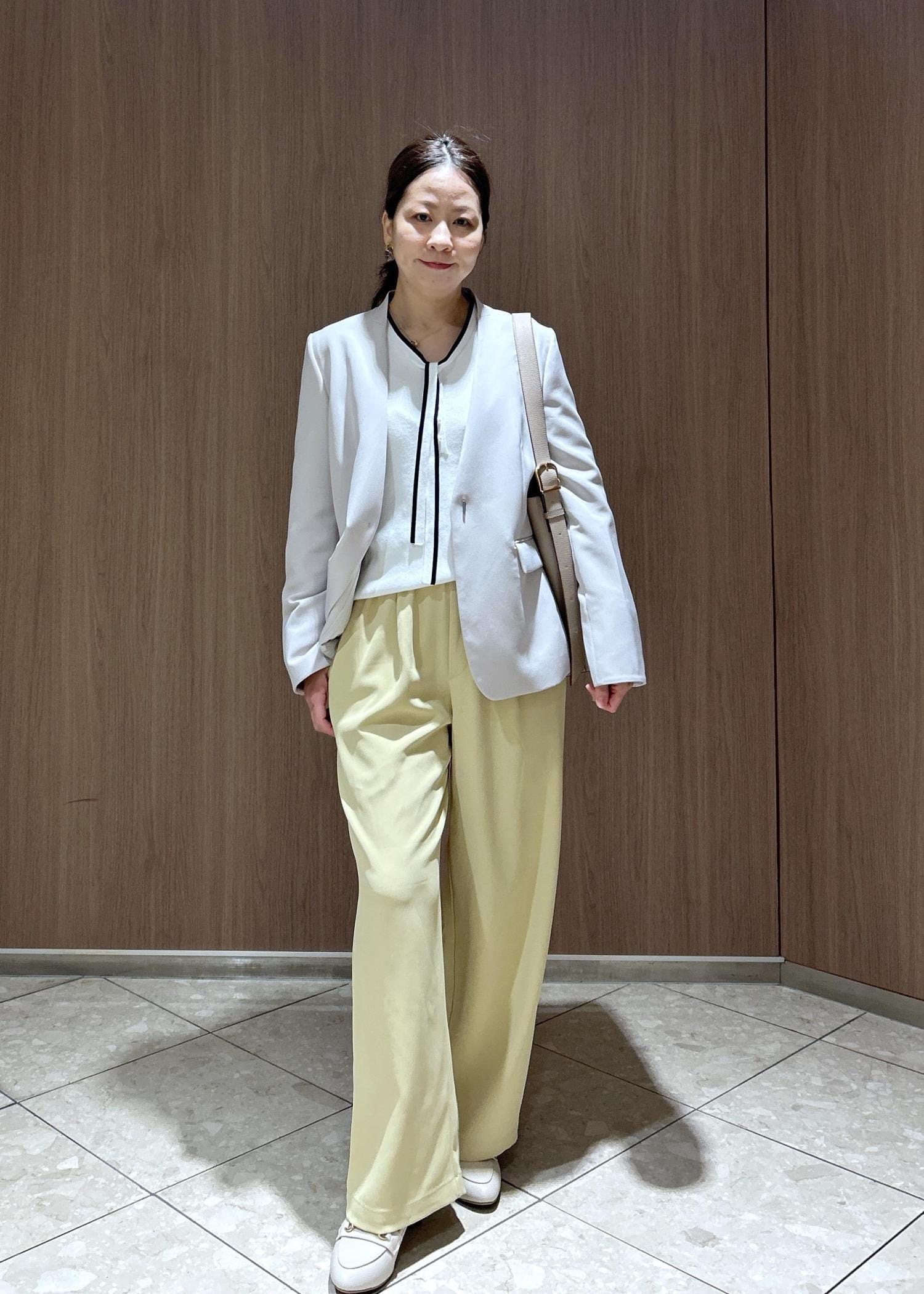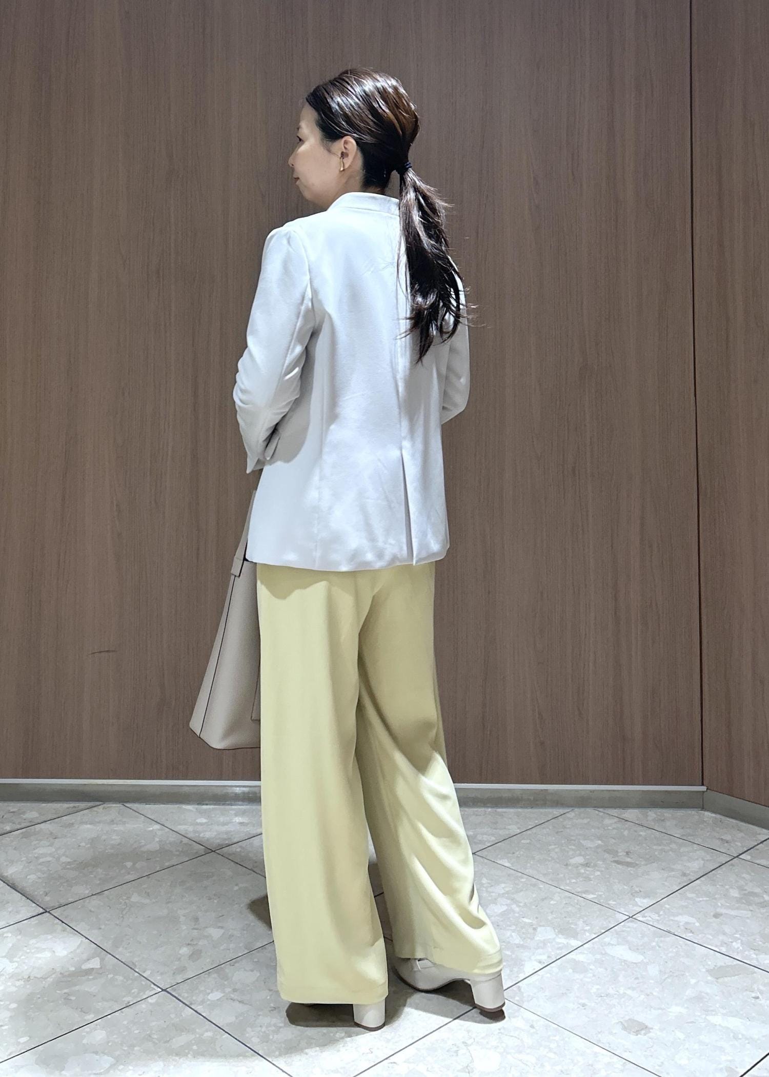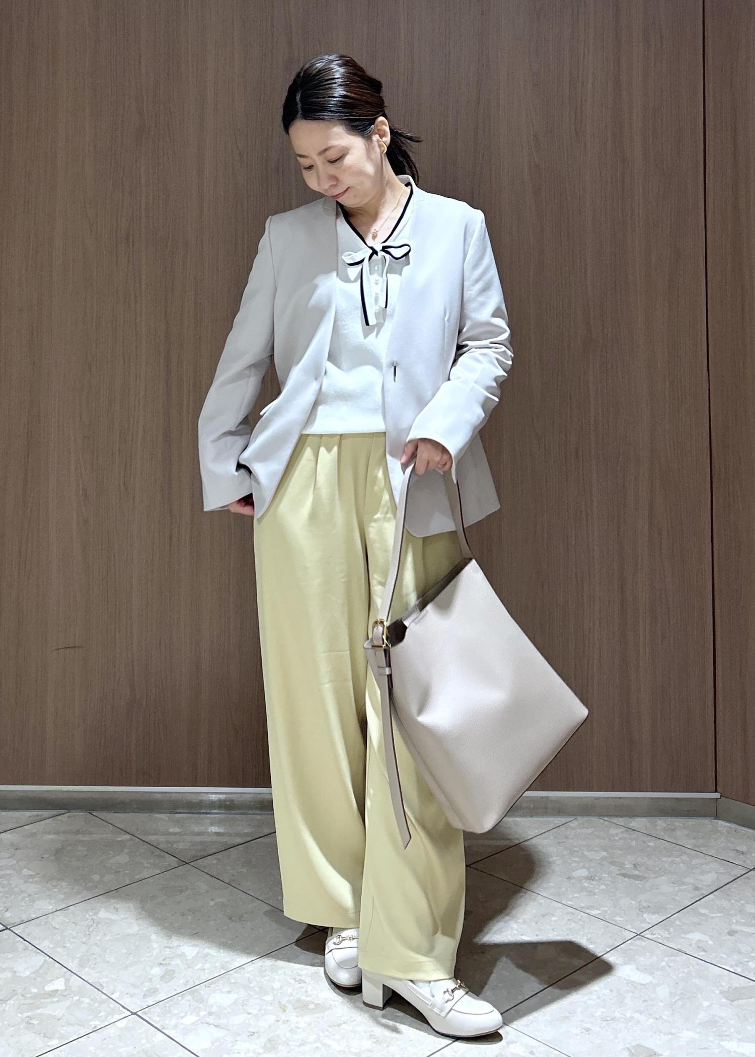 かっちりしたジャケットに合わせるのは春カラーパンツで柔らかさを出しました。まだまだ冷たい風がふくのでインナーはニットで寒さ対策。ジャケット脱いでも、華やかなニットトップスなのでお仕事帰りにご飯にも行きやすいスタイルです。