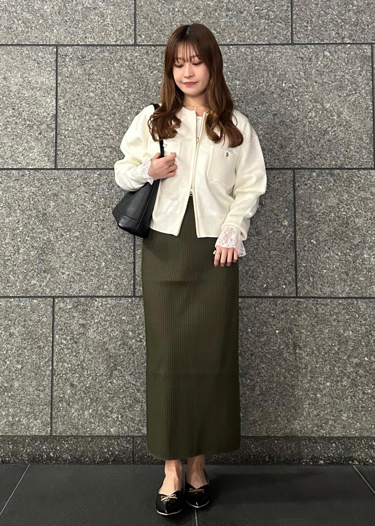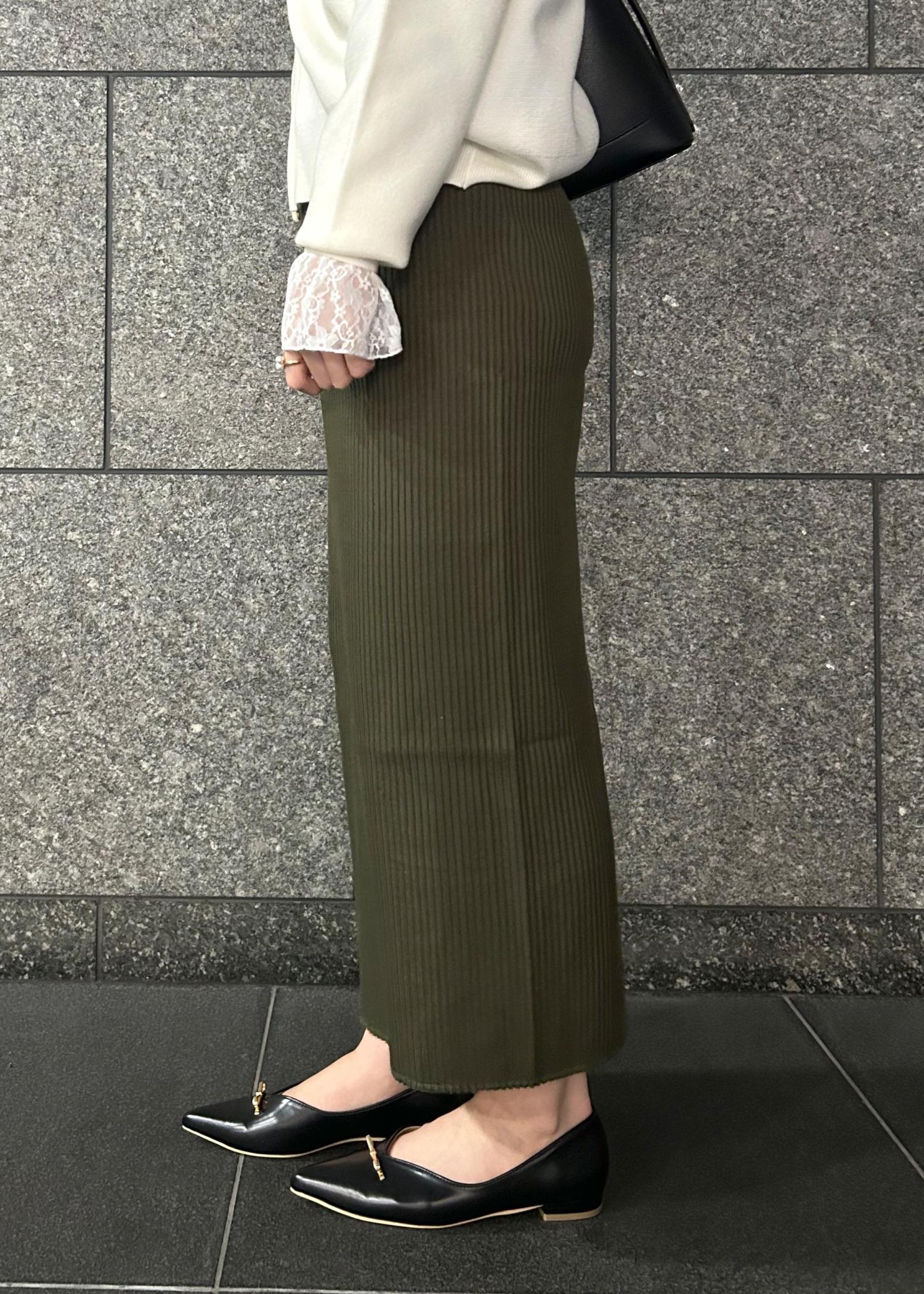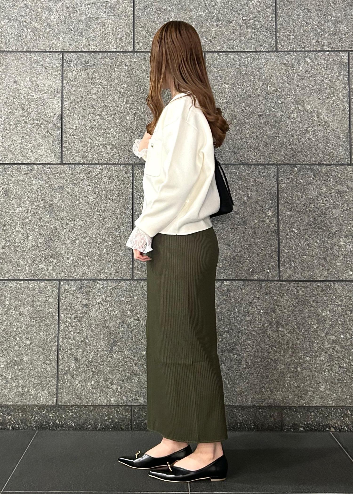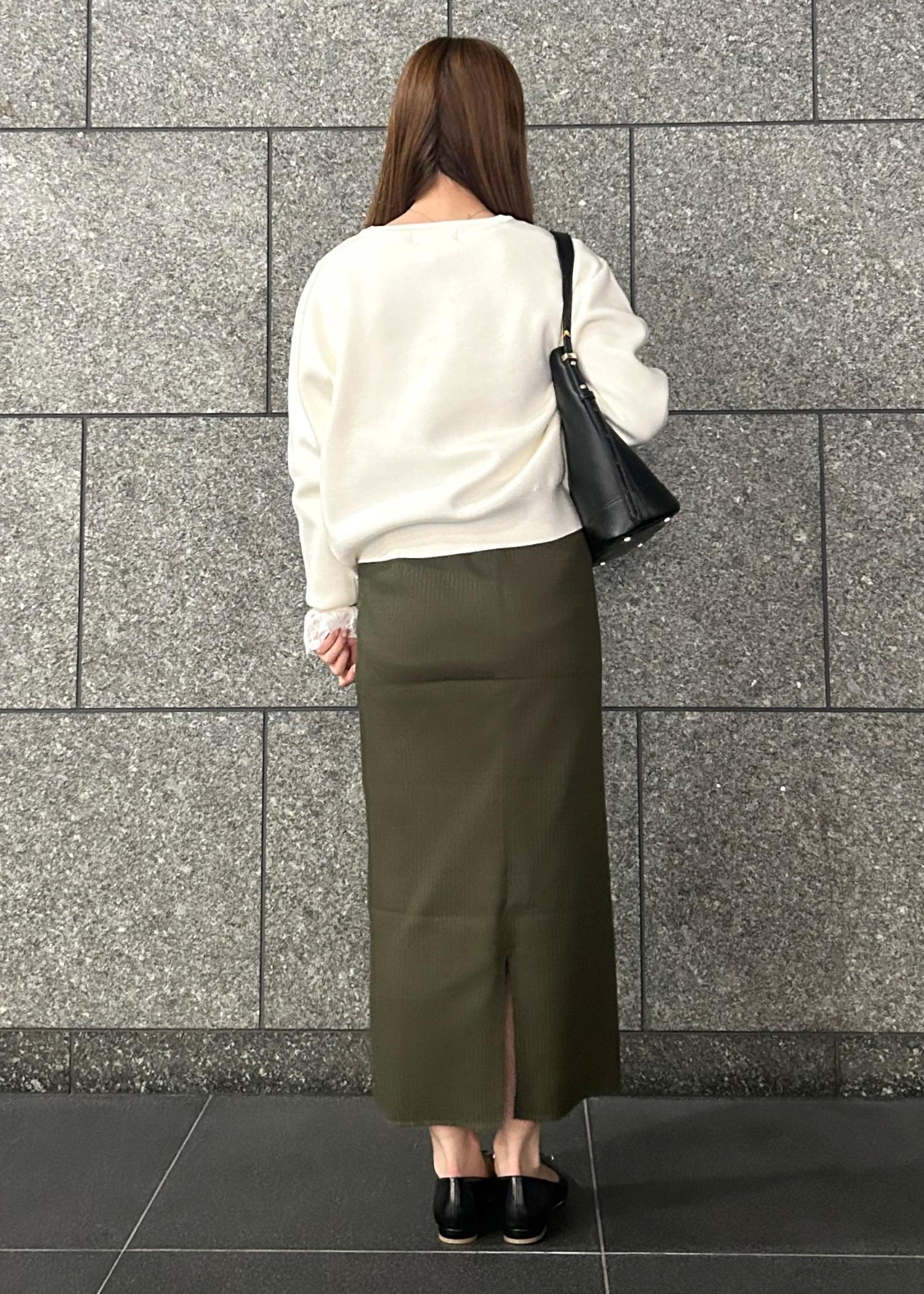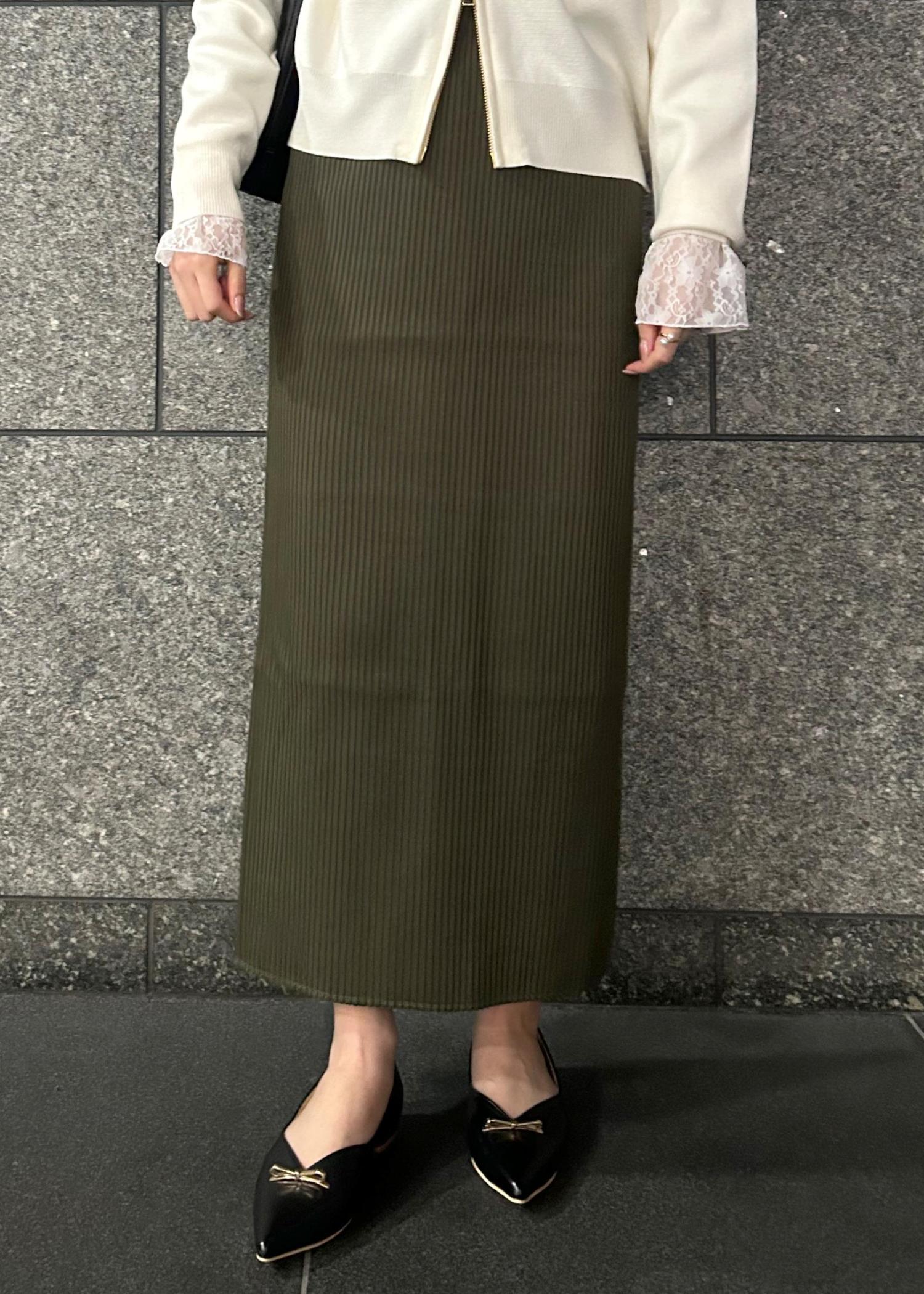 お出掛けにも着ていただけるようにニット素材のアイラインスカートでキレイめになりすぎないように仕上げました!