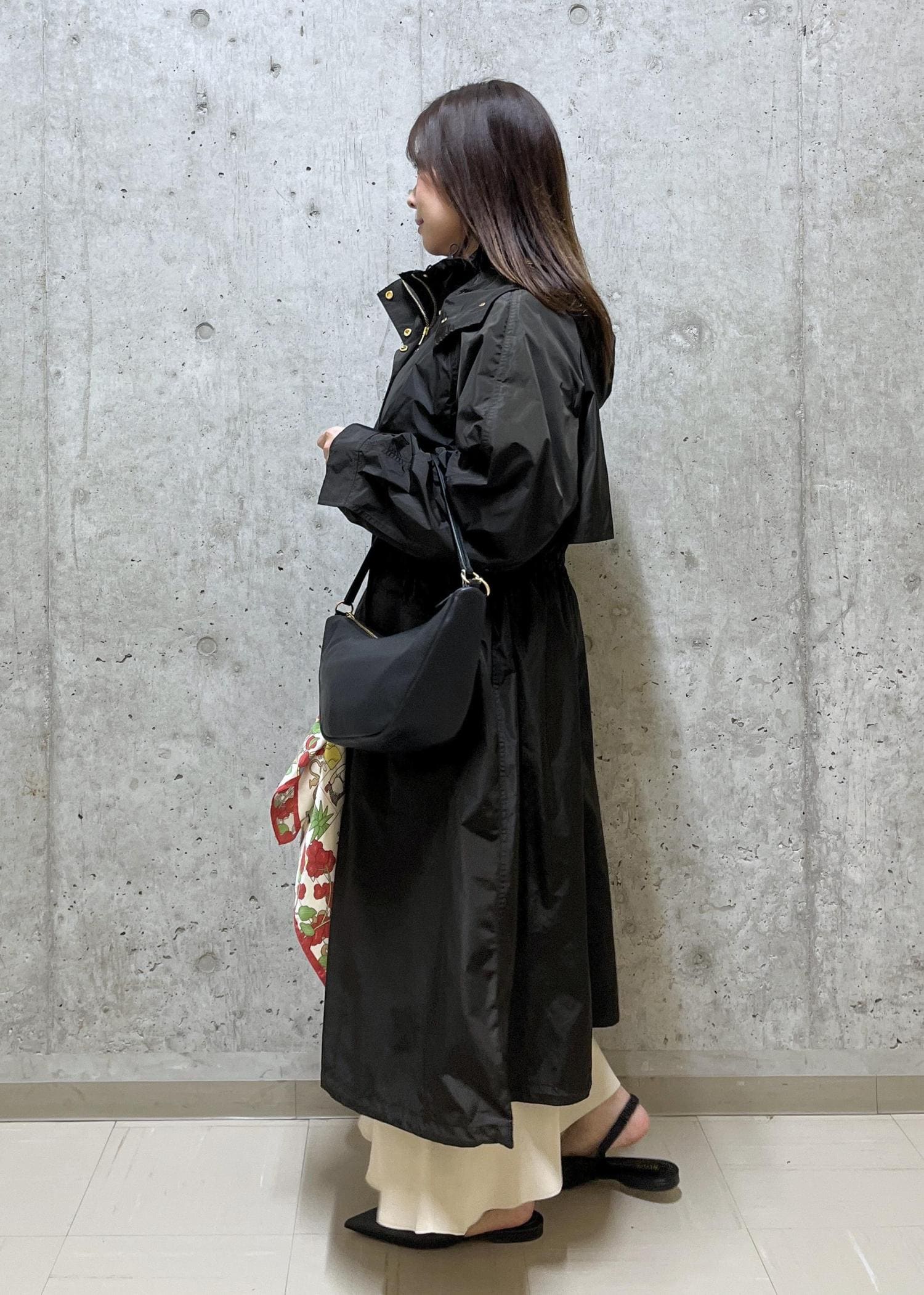 キレイめなスカートスタイルの上にカジュアル感のあるアウターを羽織り、普段でも使いやすいスタイルにしました。