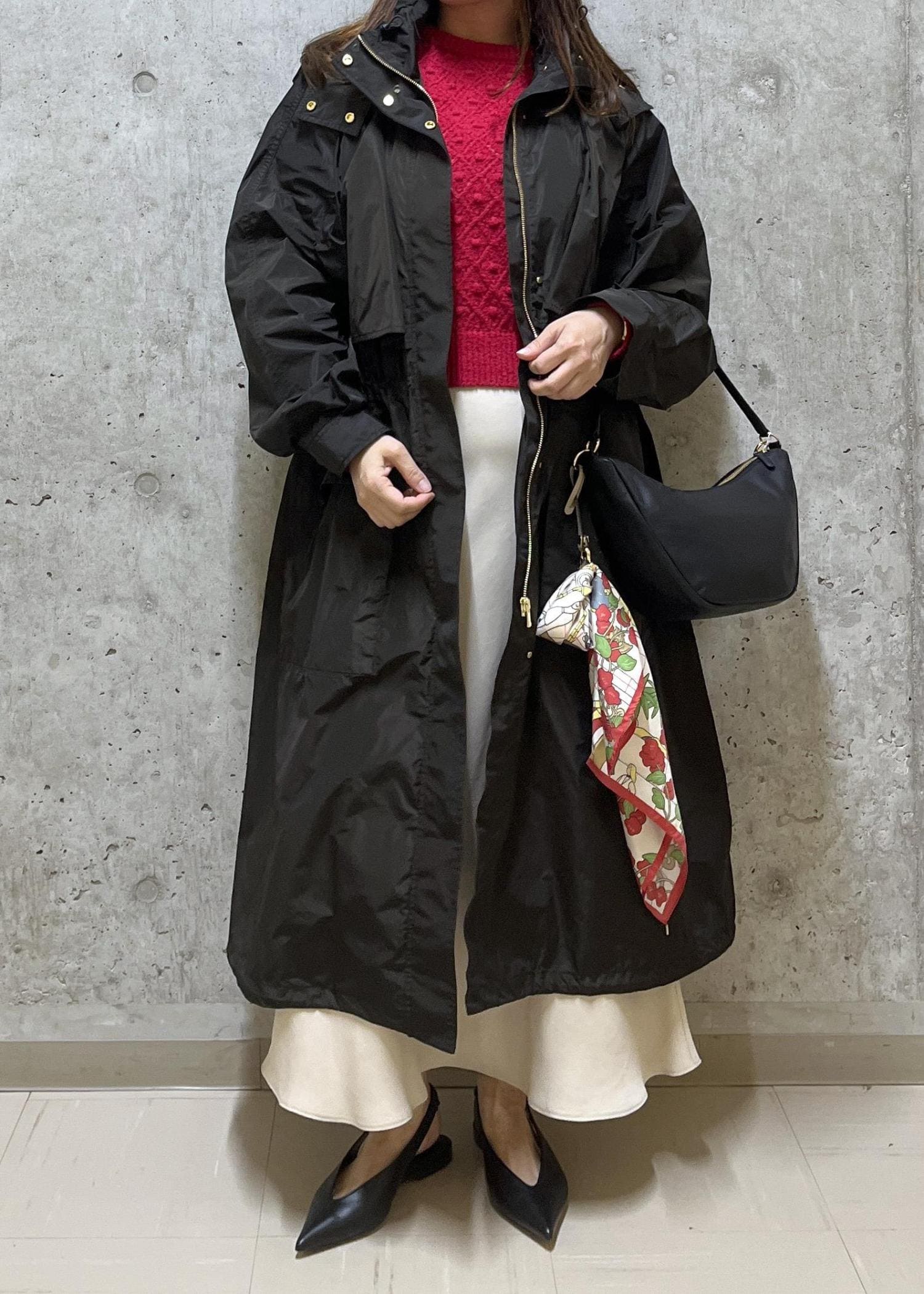 インナーとスカーフの赤がポイントのコーディネートです。