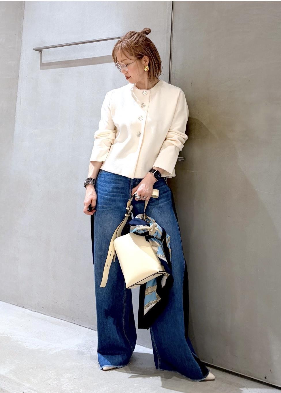 メタルボタンがポイントのカーディガンをバギーデニムに合わせて、大人カジュアルなスタイリングです。