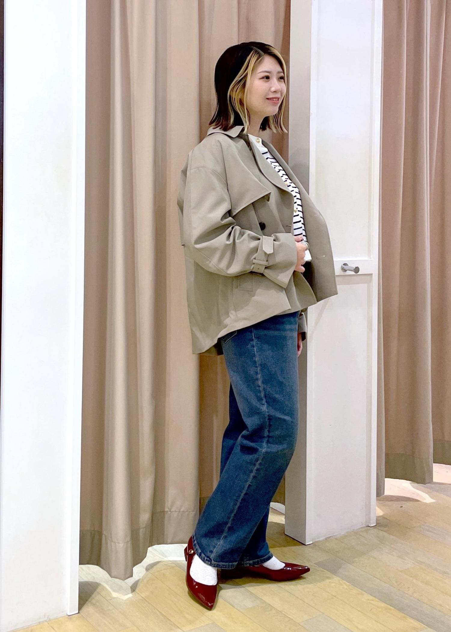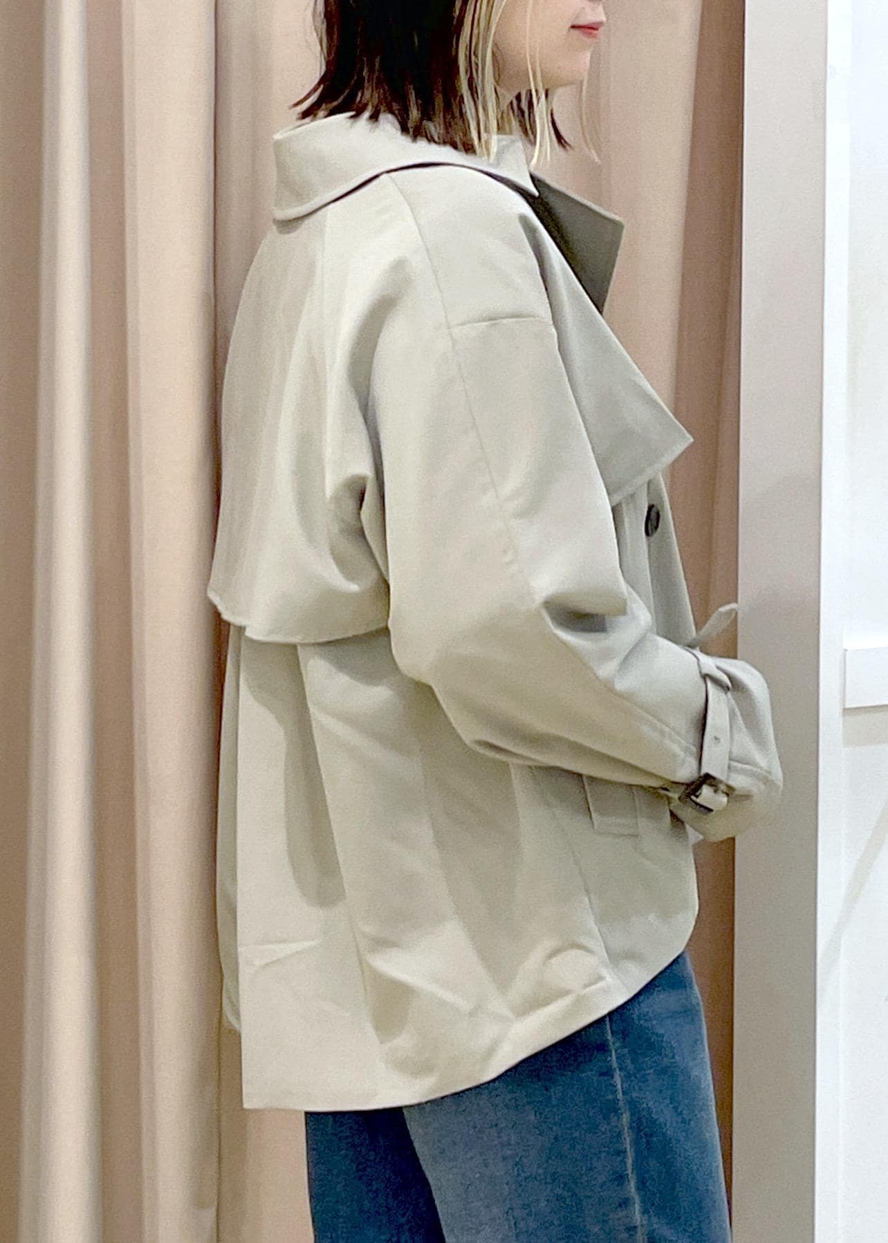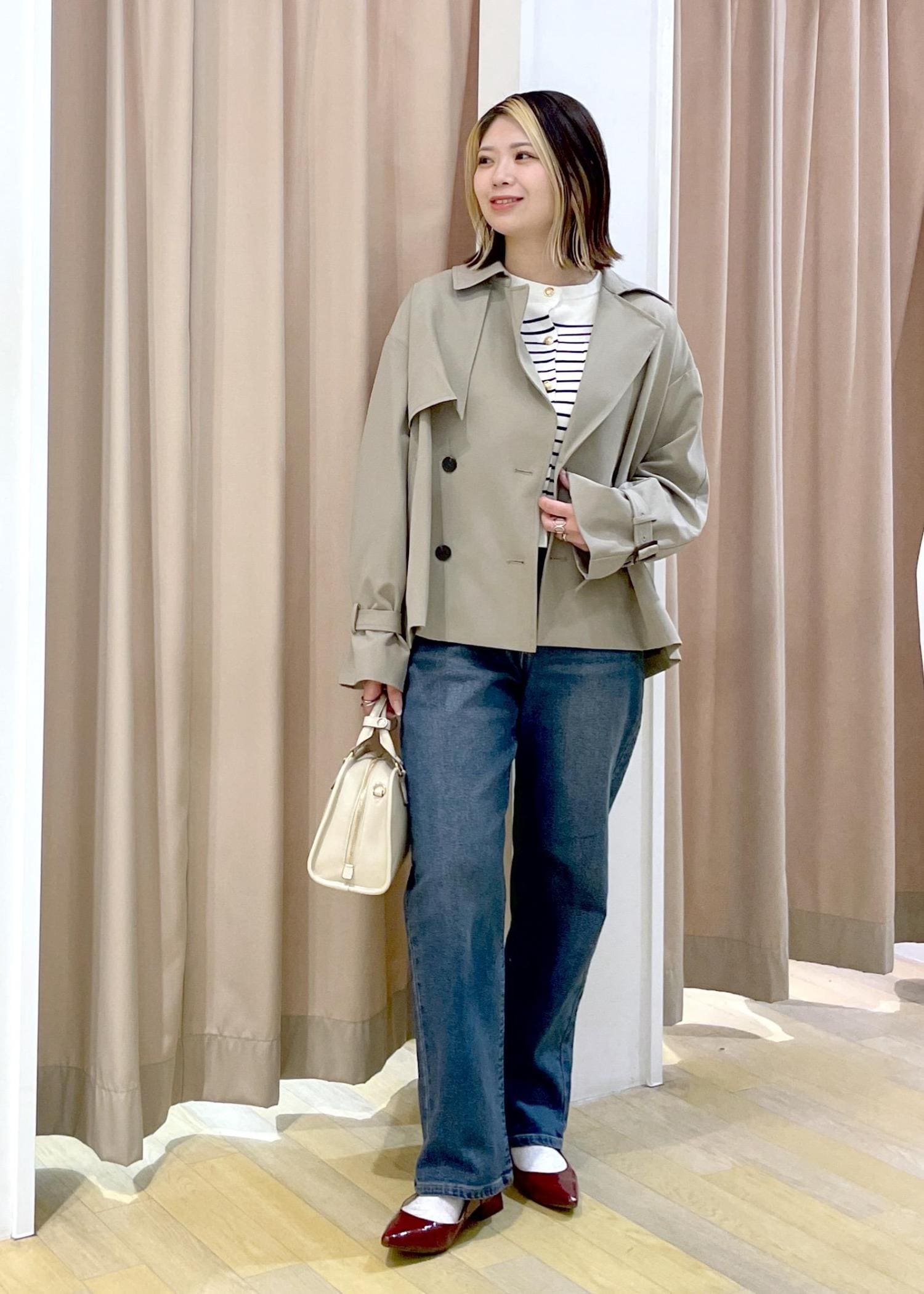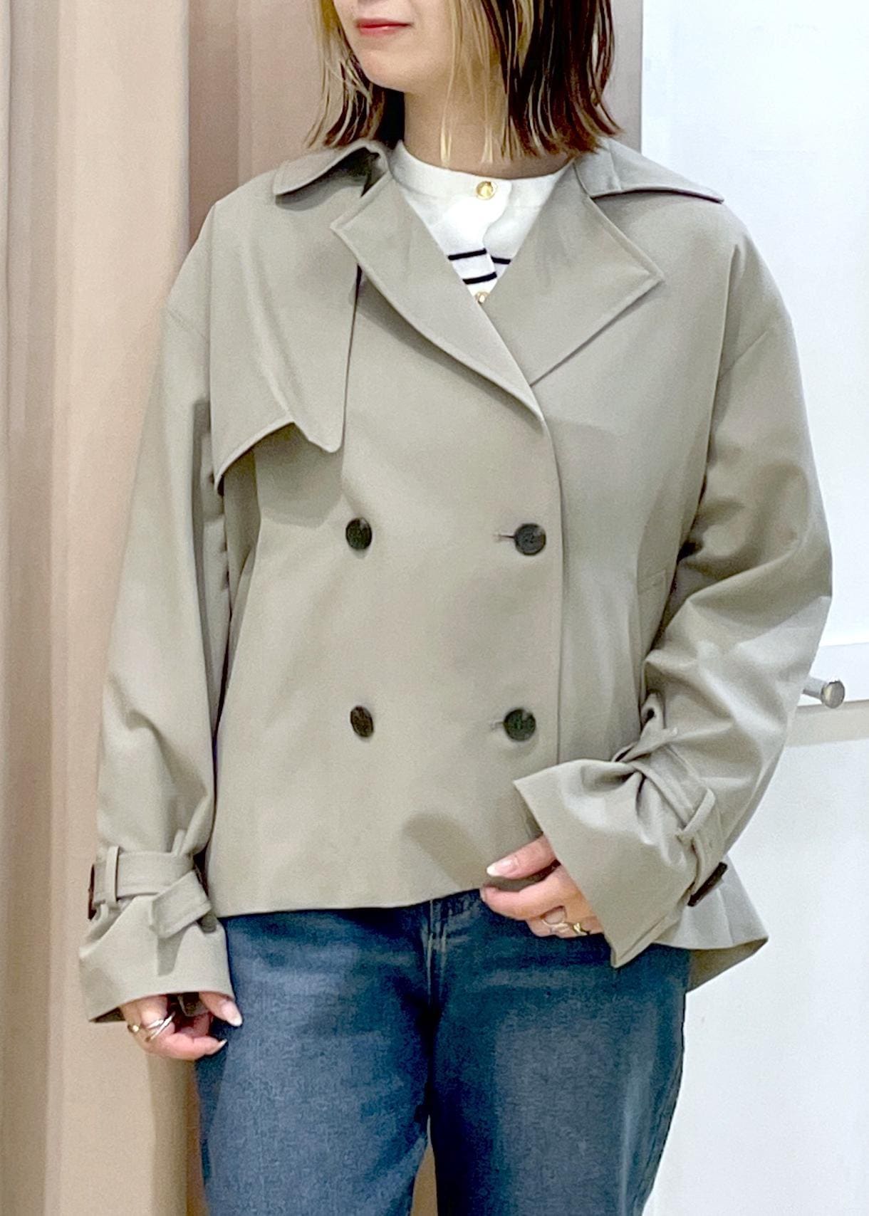 これから重宝するショートトレンチを使った春コーデです。