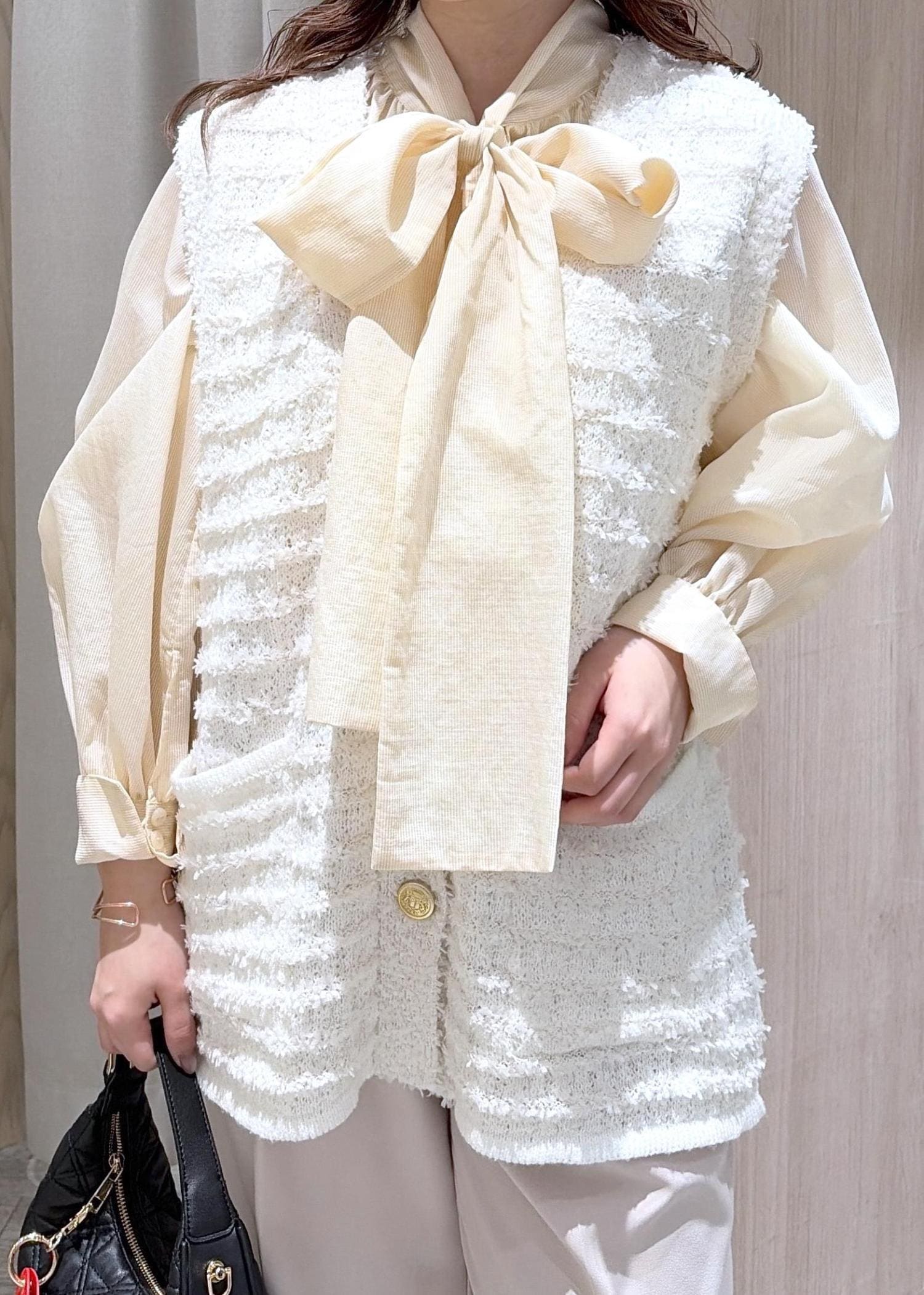 ボウタイブラウスとニットベストで春に楽しめるレイヤードスタイルです!