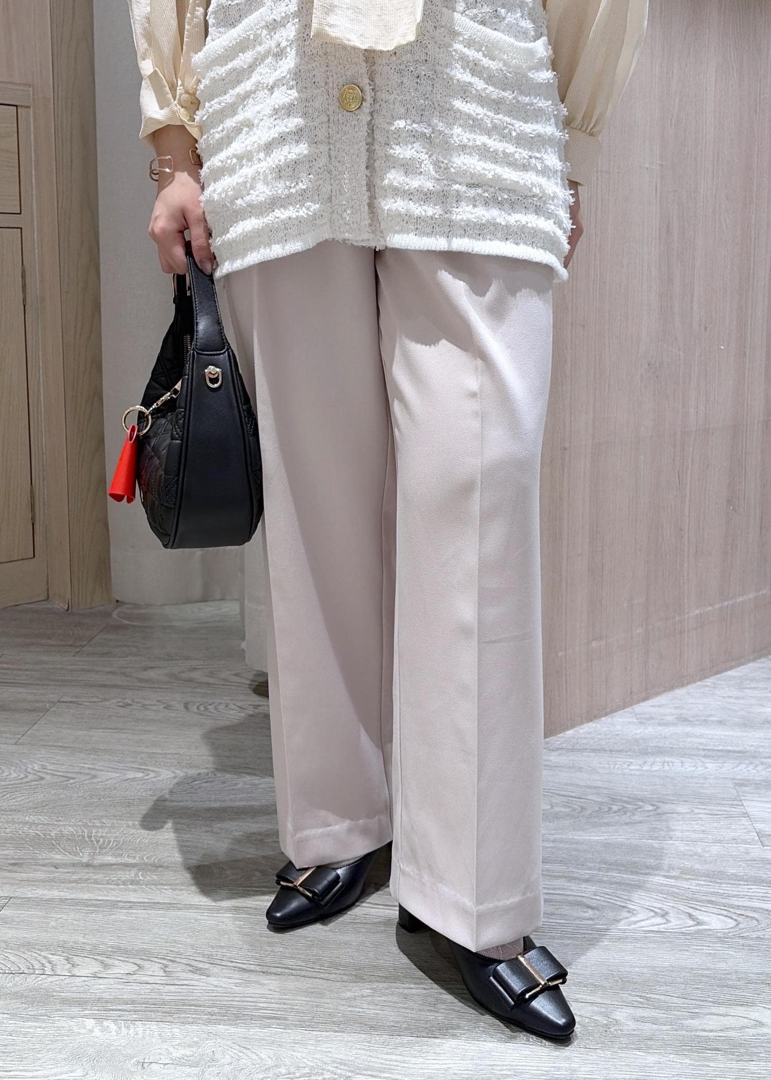 トップス、ボトムスと淡い色味になったので小物はブラックで引き締めました♪