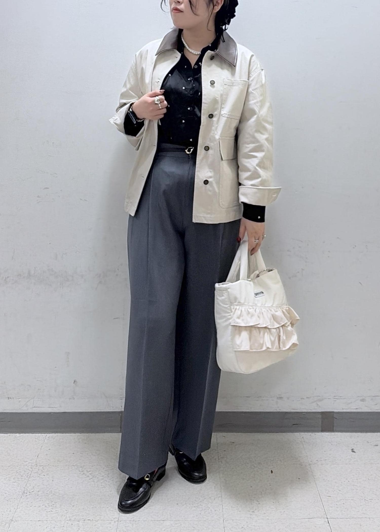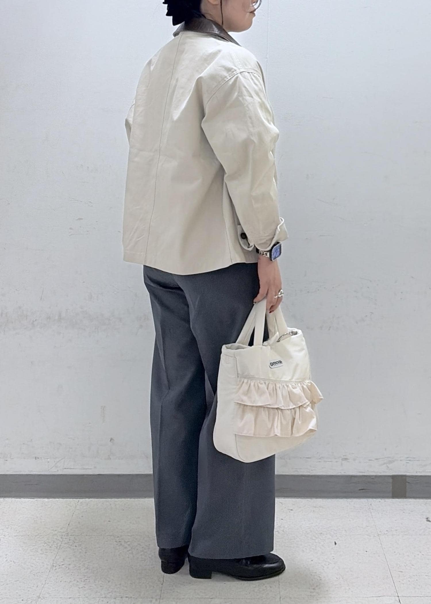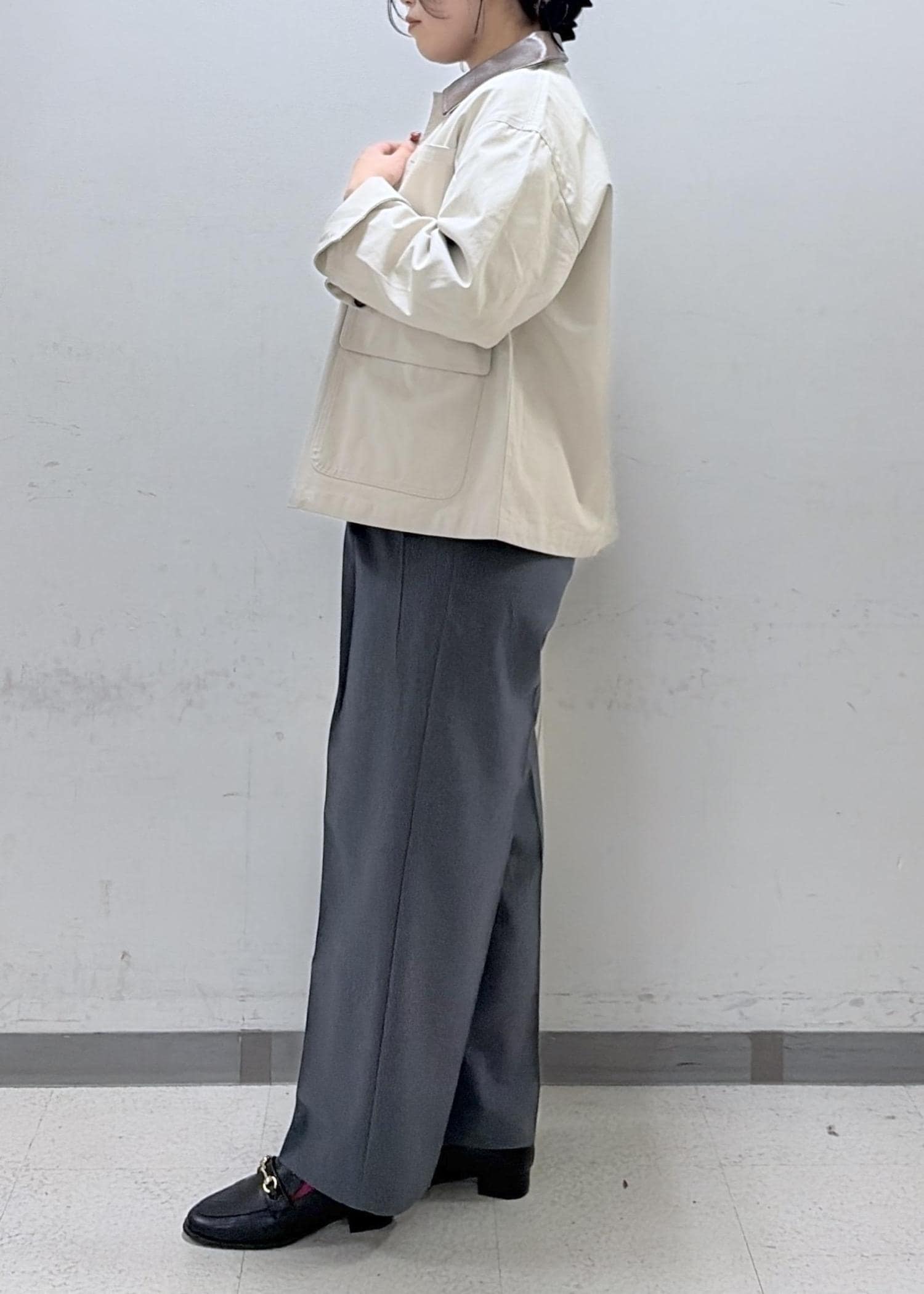 インスタイルをすると腰回りが気になるので、アウターは少し長めな丈を選びました。