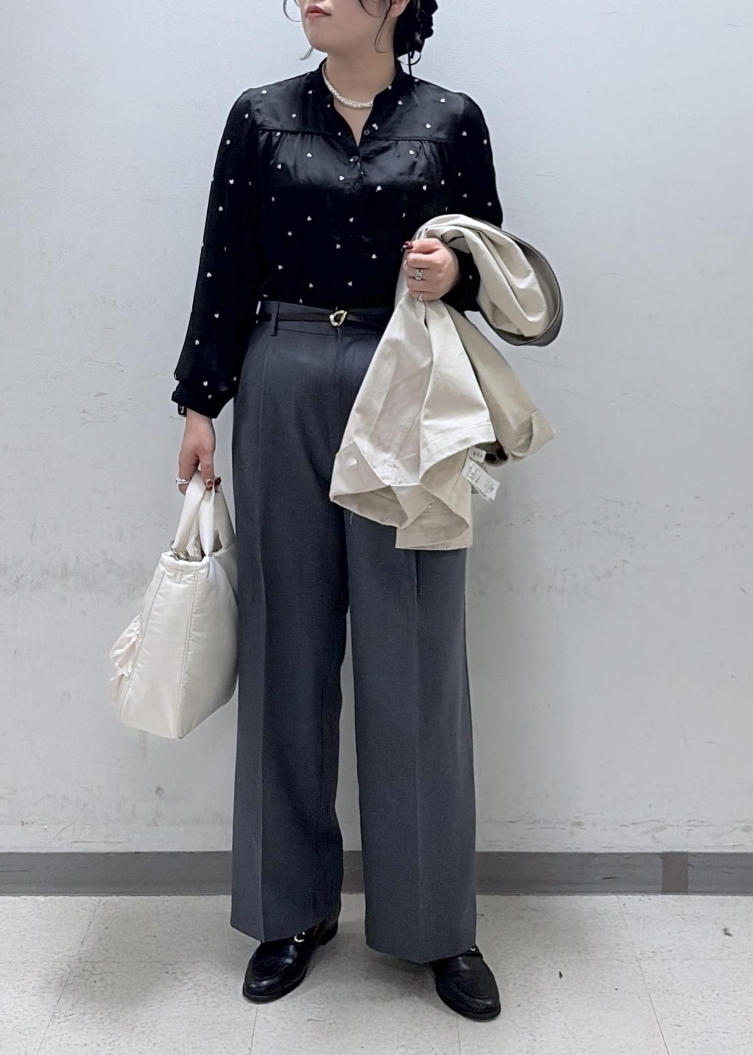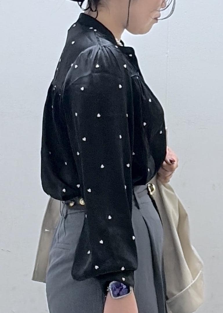 チラッと見えるハート柄のブラウスがポイントです❤︎