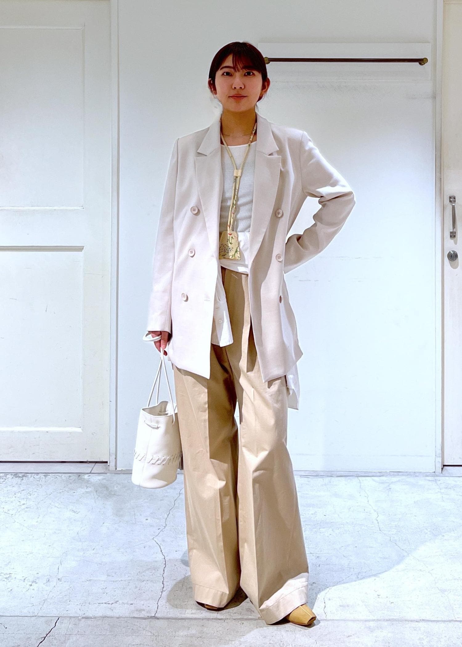 ジャケットの下に腰巻きにして、少しポイントになるようにバッグと色のトーンを合わせてみました。