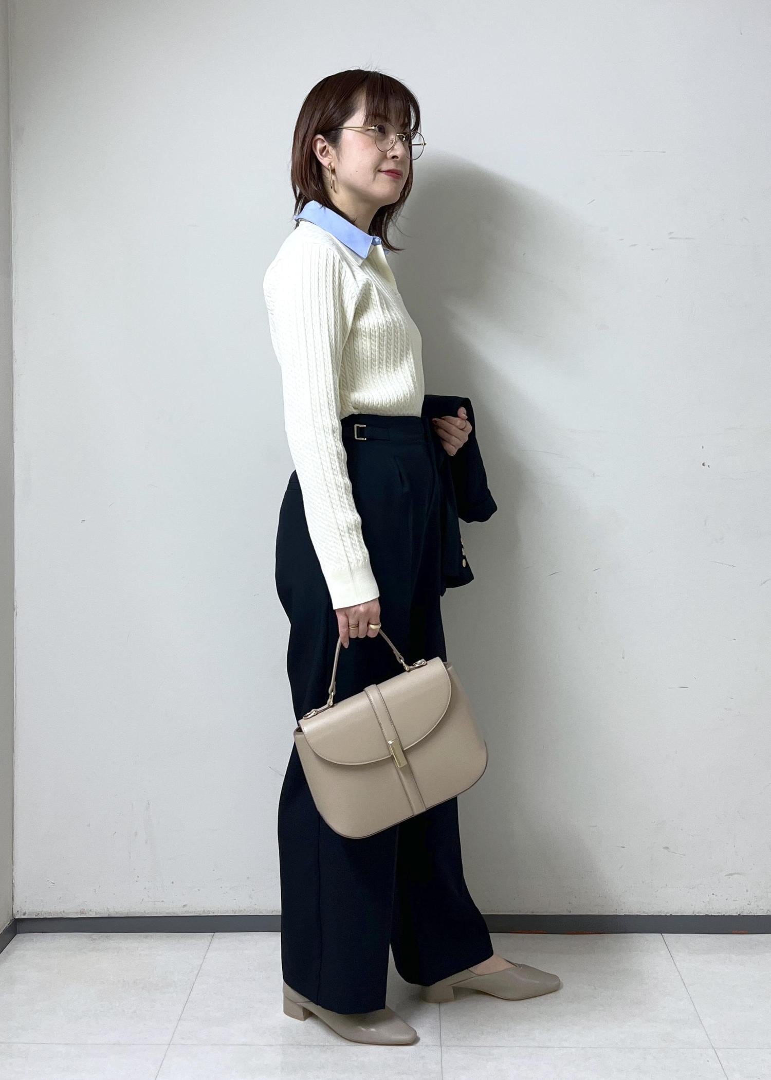 顔まわりが明るくなるように、インナーのニットを白にしたのがポイントです♪