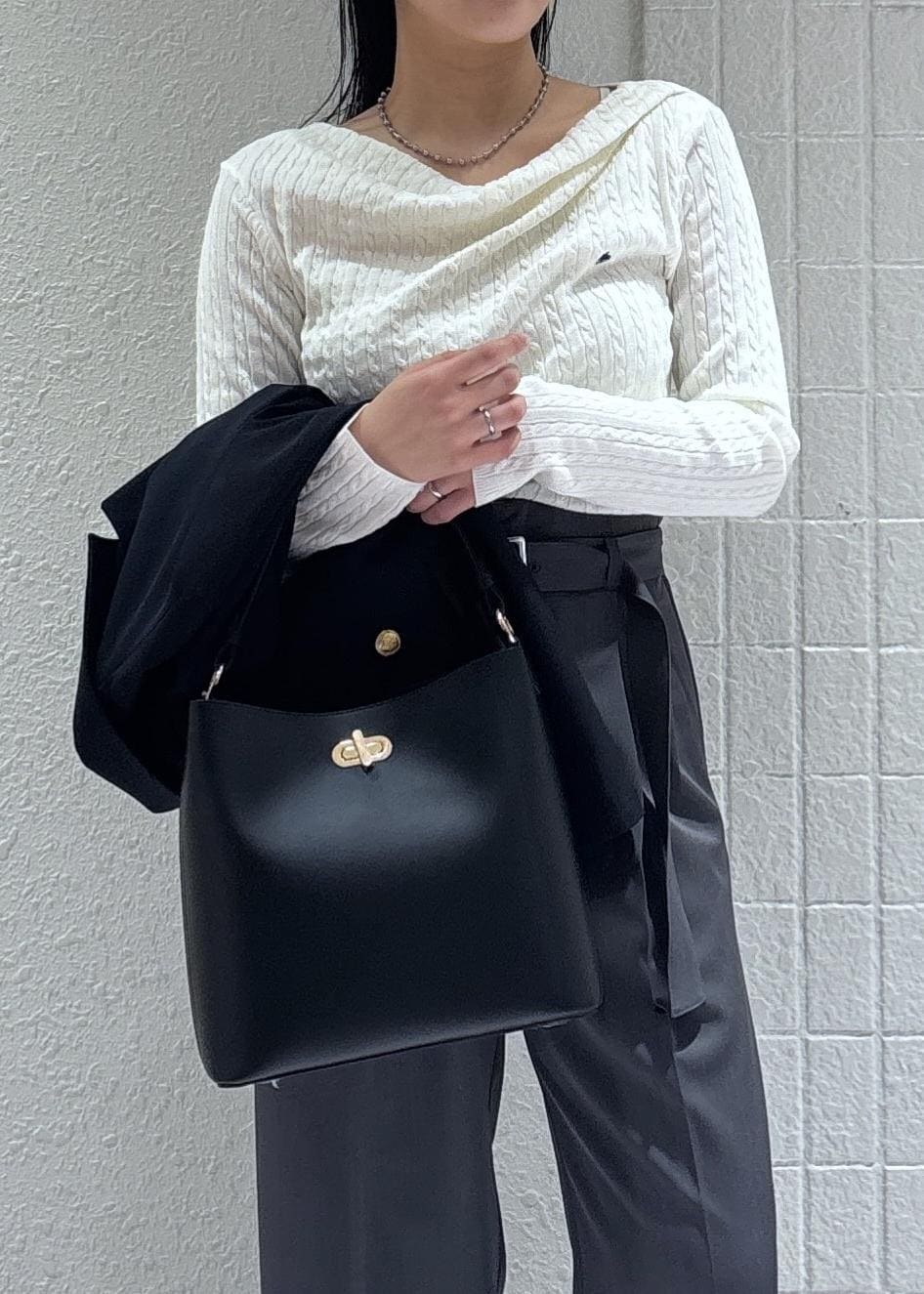 ひねり金具がポイントになる綺麗めバッグ。