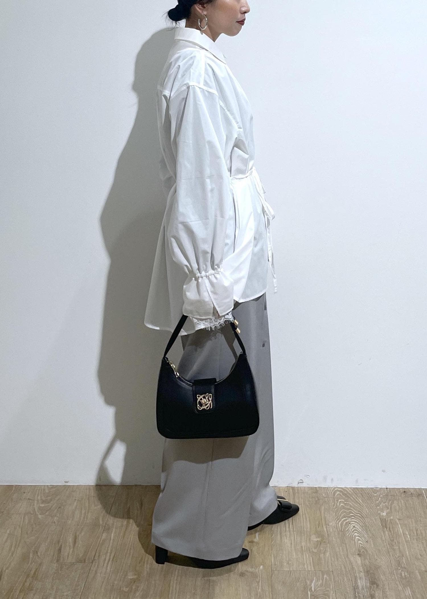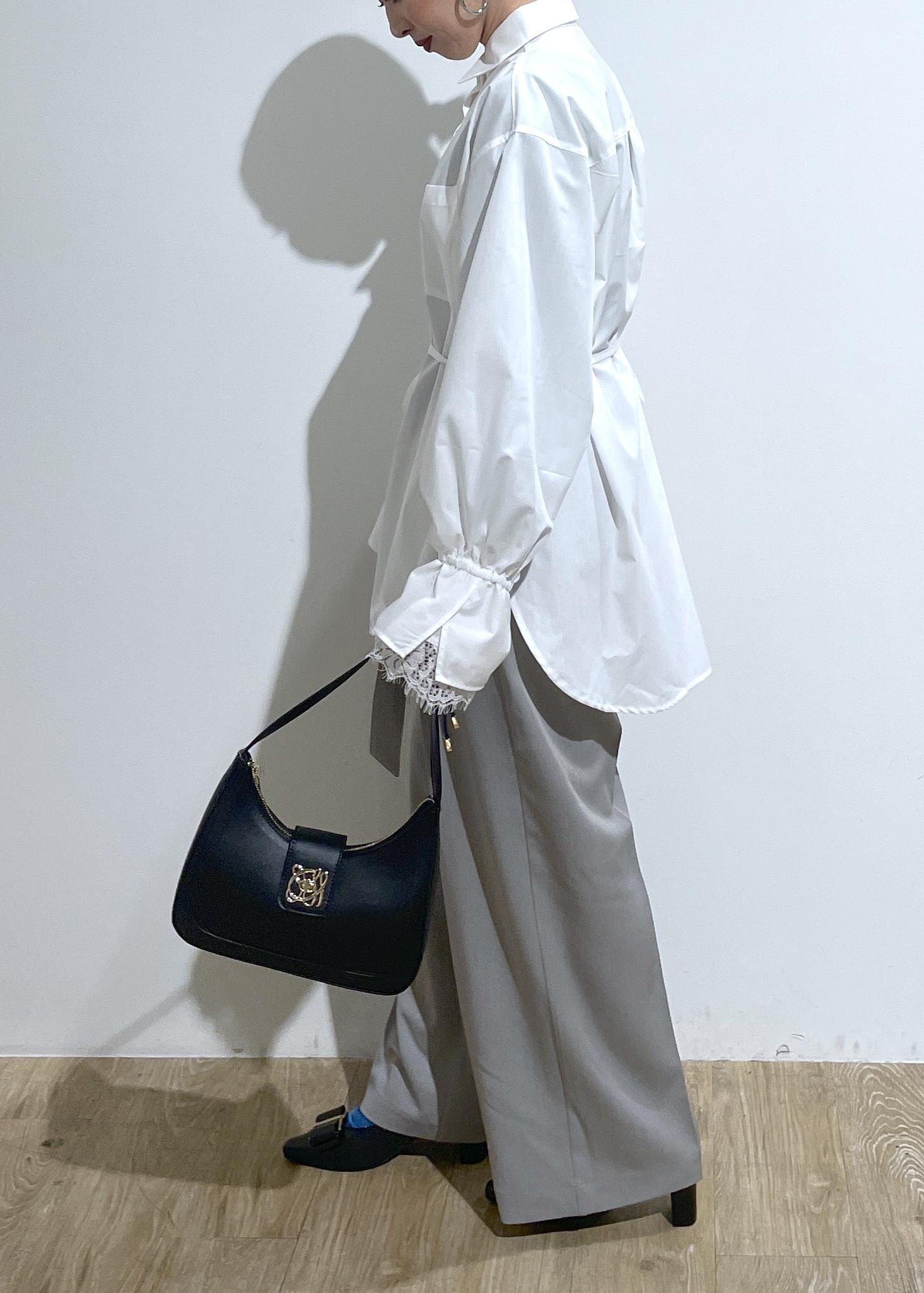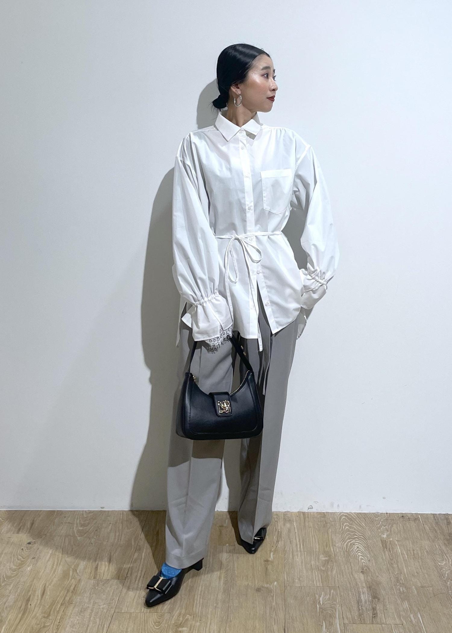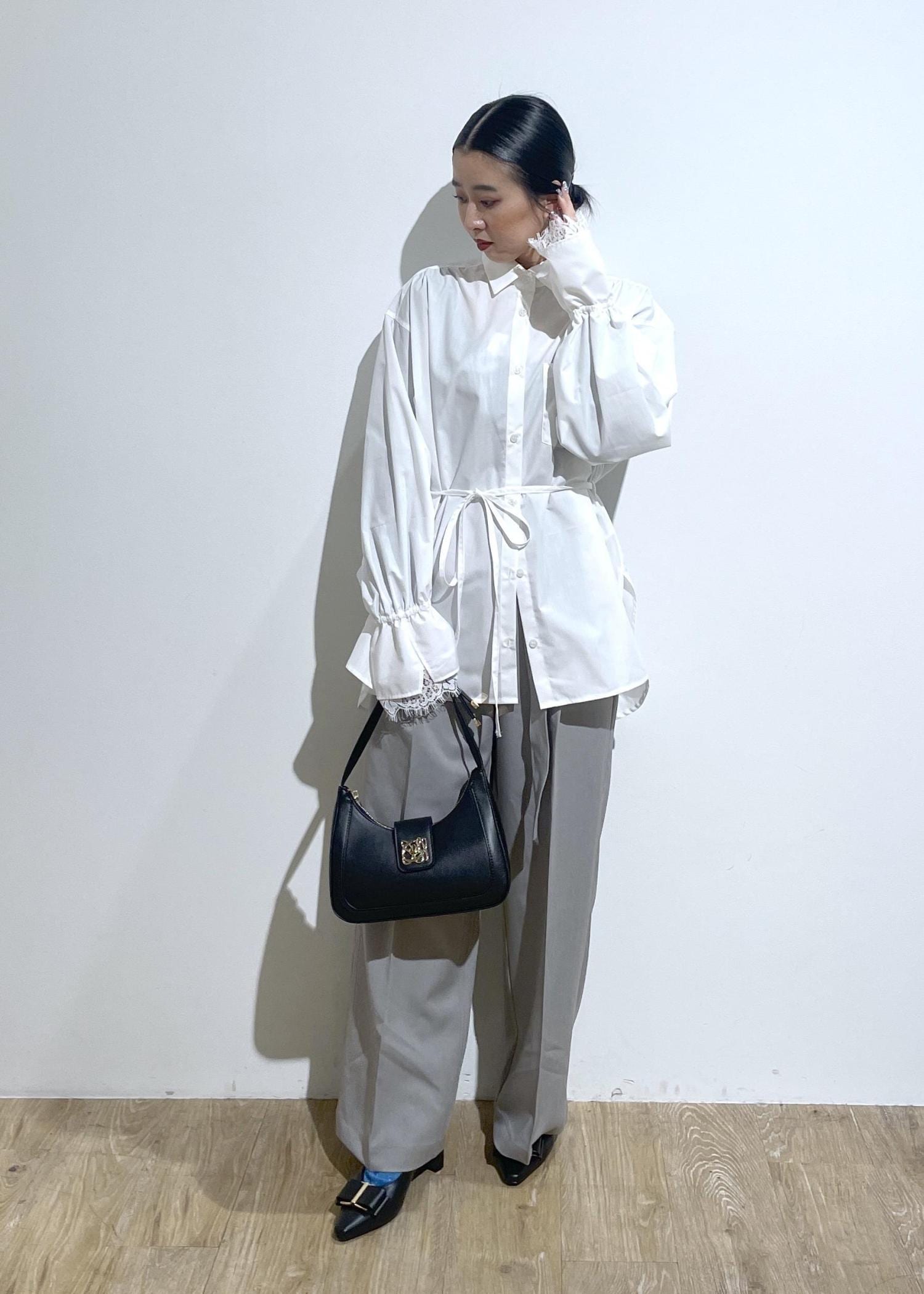 ブラウスとレースとパンプスのリボンで甘くなり過ぎないようにパンツは、グレーで大人っぽさをほんのり残してます。