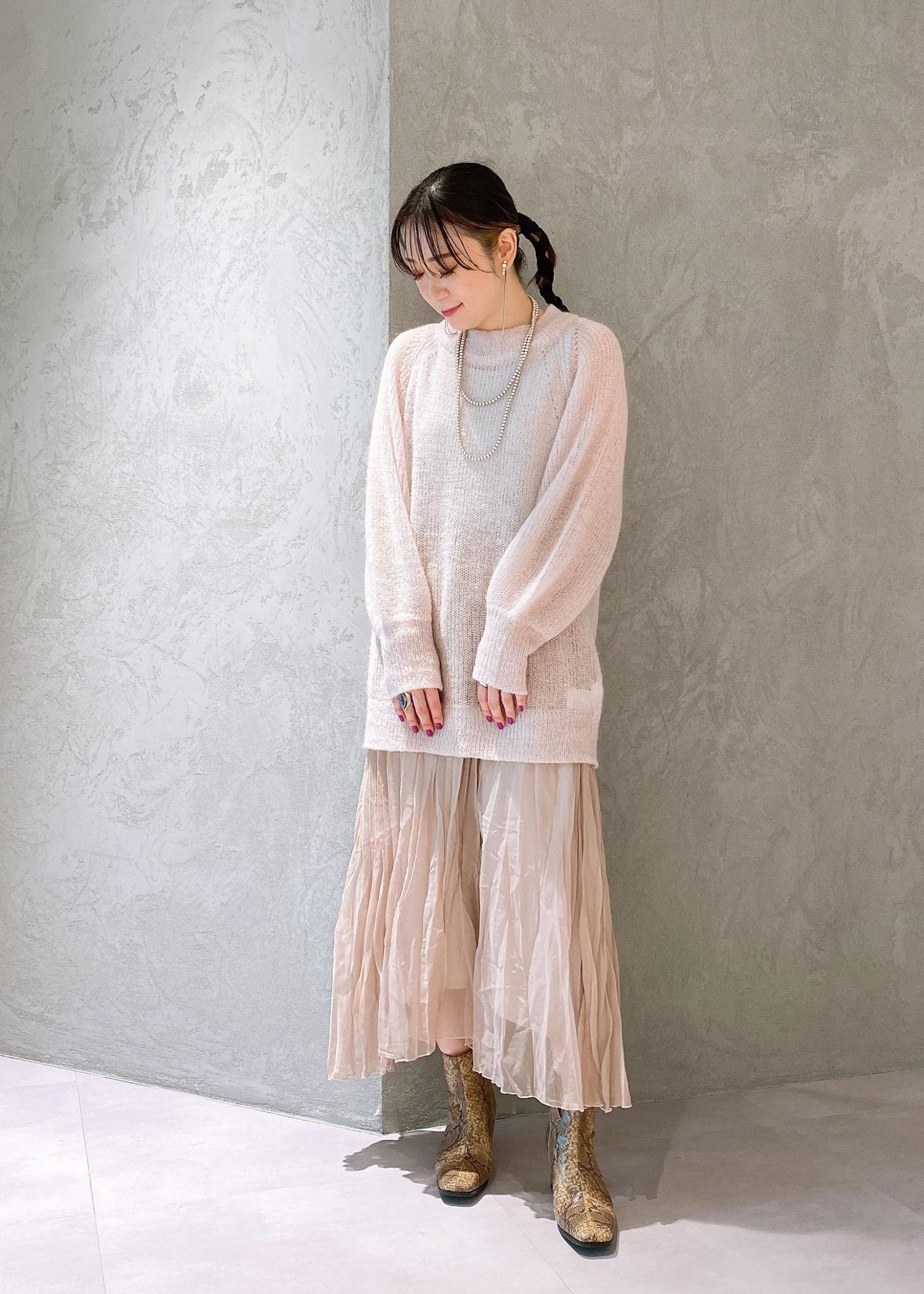モヘアニットは鍵あみ風で透け感があり今年らしい印象のトップスです。オーガンジーのワッシャースカートを合わせた事でフェミニンなコーデですが、足元のパイソンブーツで甘すぎないコーデにしてます。