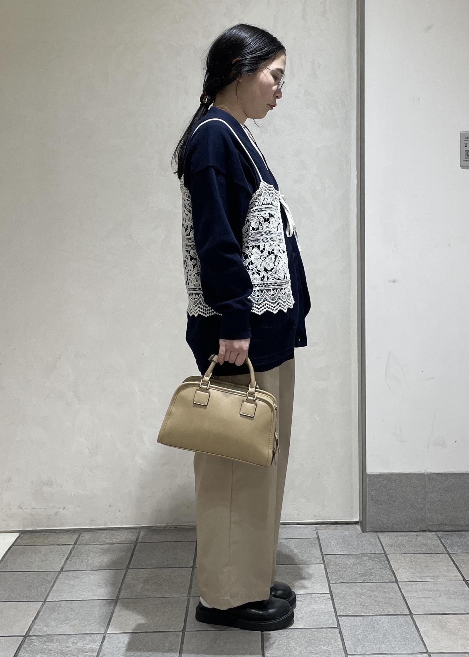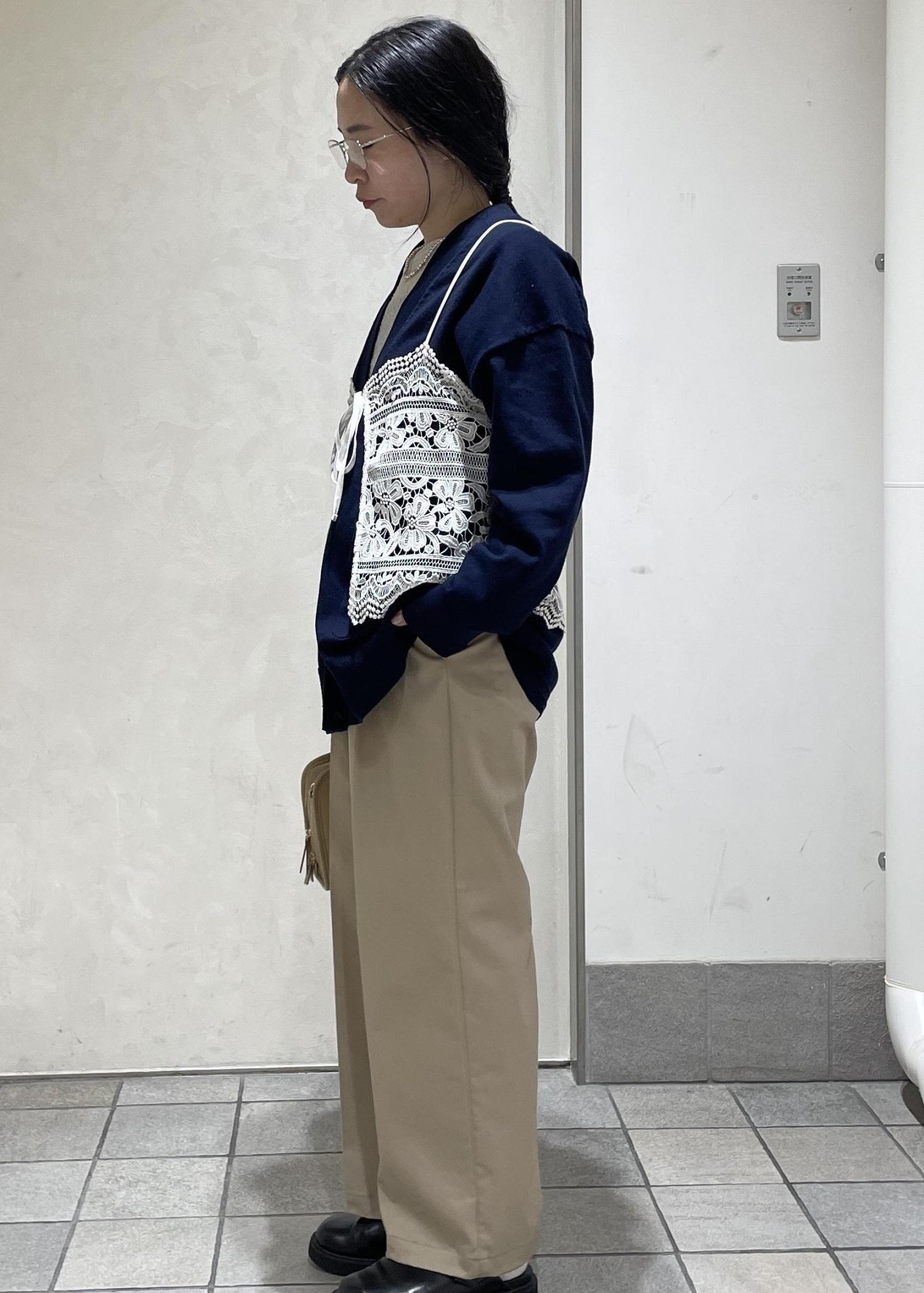 前後で着ていただけるので、シャツやニットとレイヤードしやすいです。 -