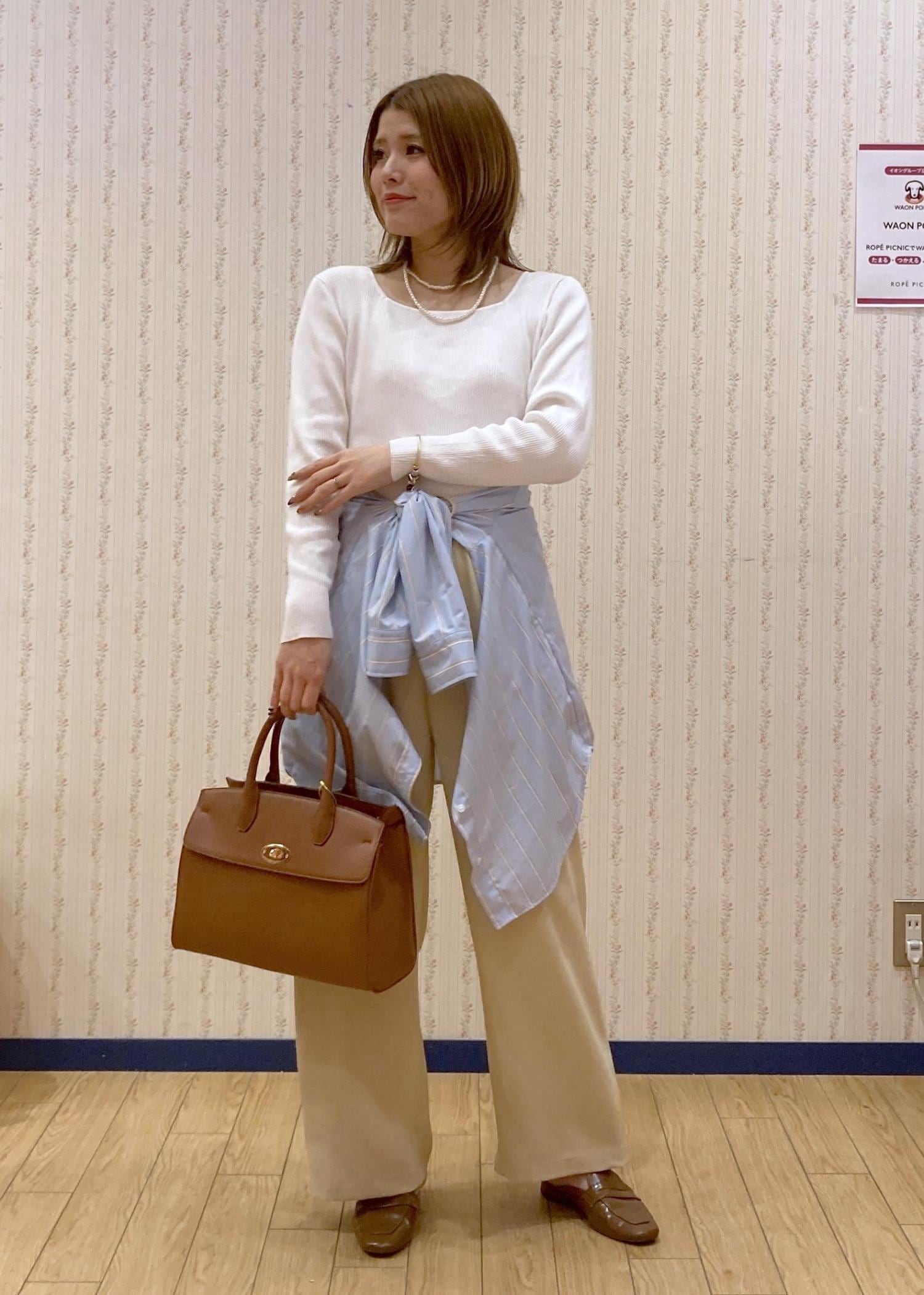 腰に巻いたブルーのシャツがコーディネートのポイントです!