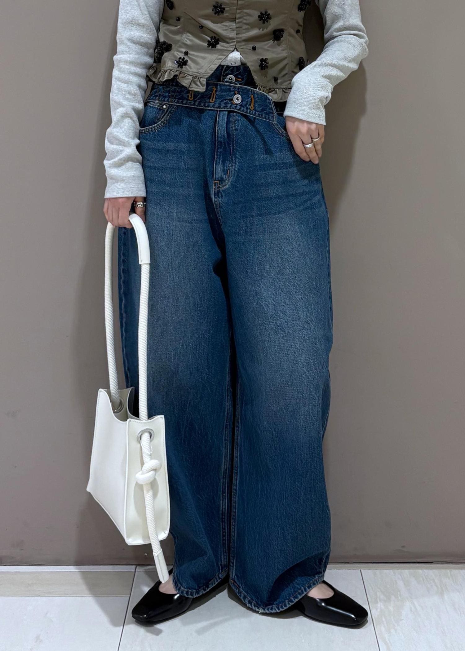 ベルトは前後で楽しめるので、トップスに合わせて着用できます。