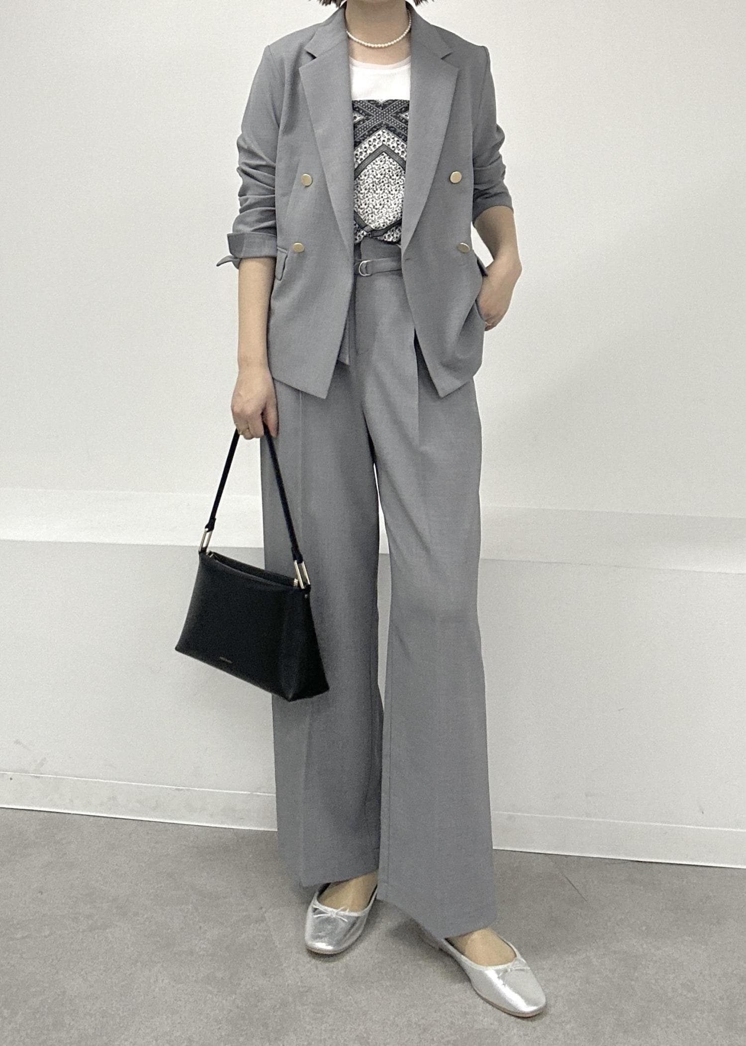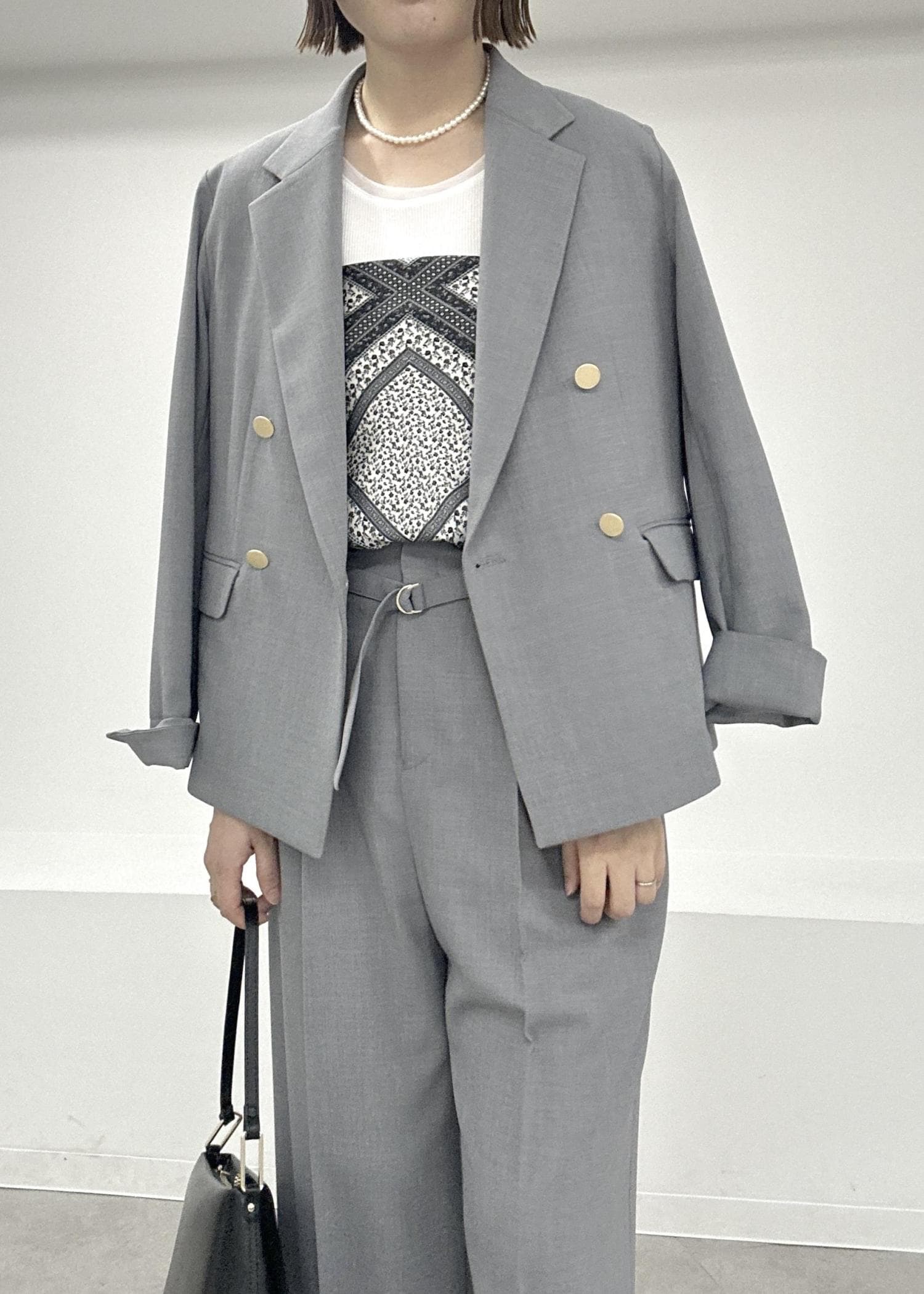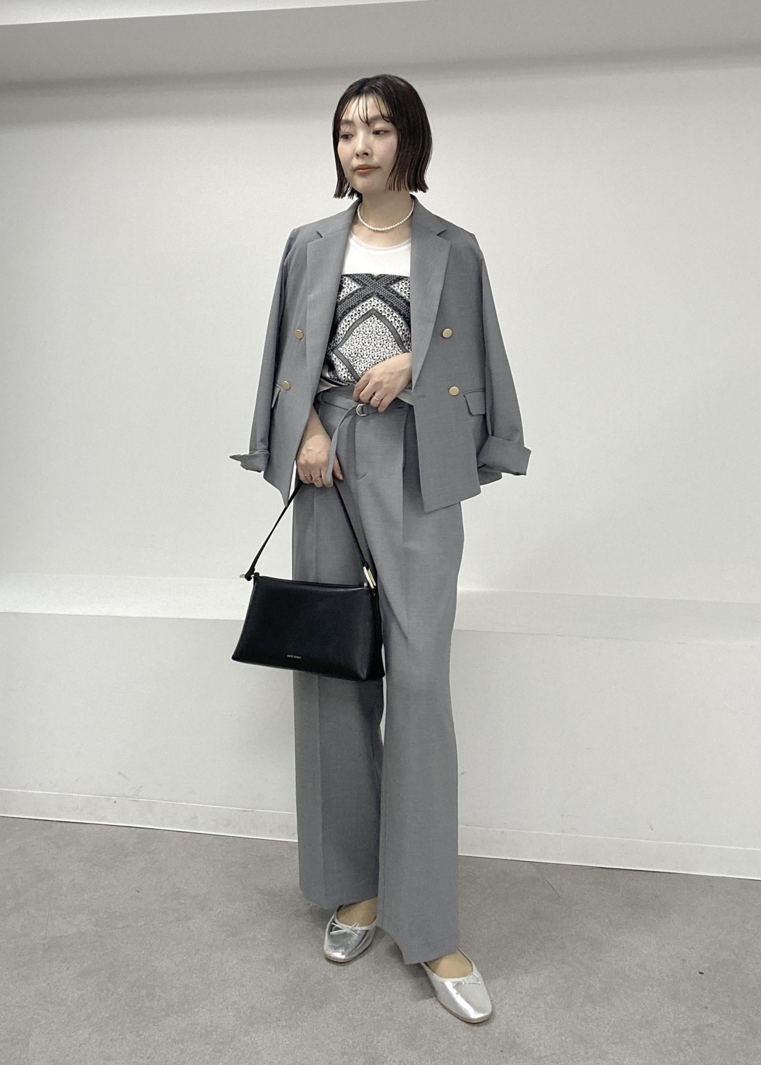 グレーのセットアップでインナーはタンクトップで軽快に春夏らしく♪パールやスカーフ、小ぶりなバッグを合わせて上品にまとめました。