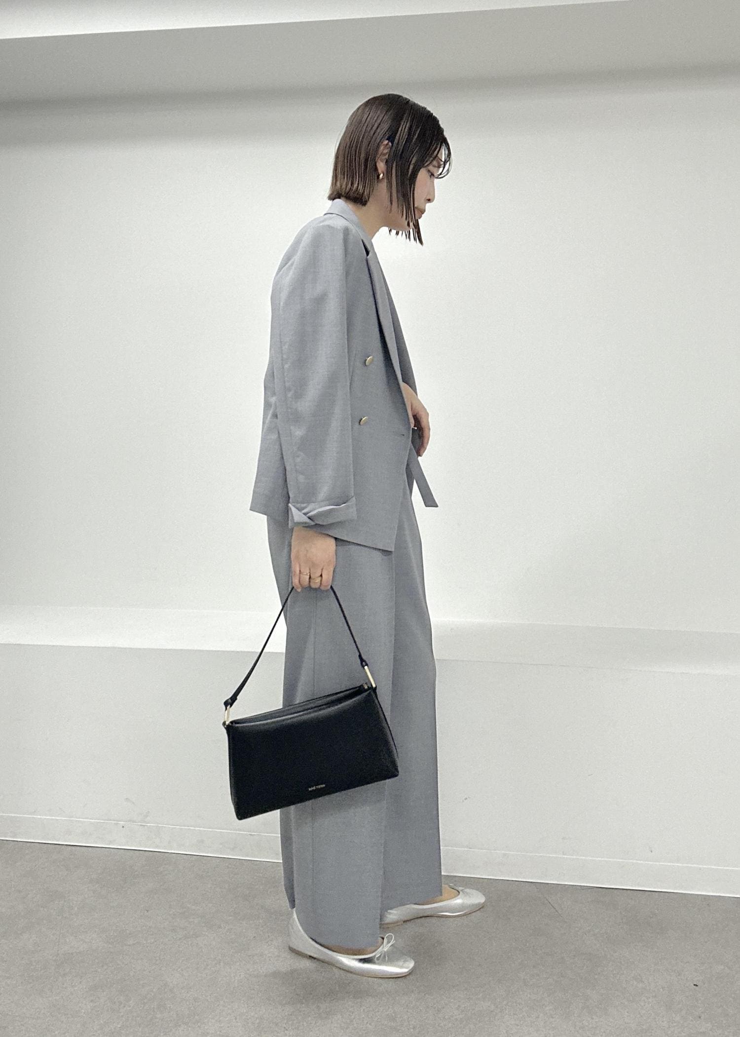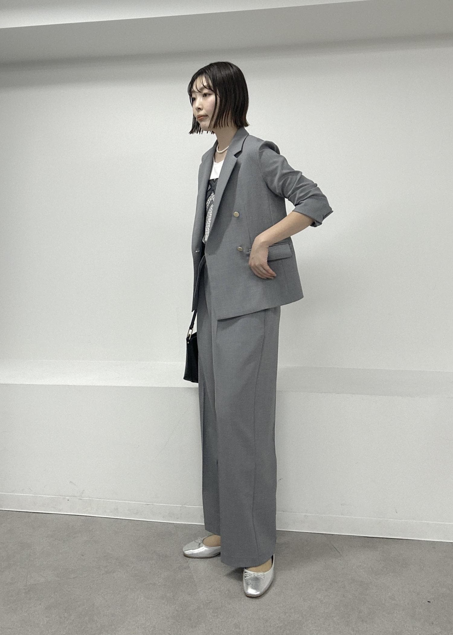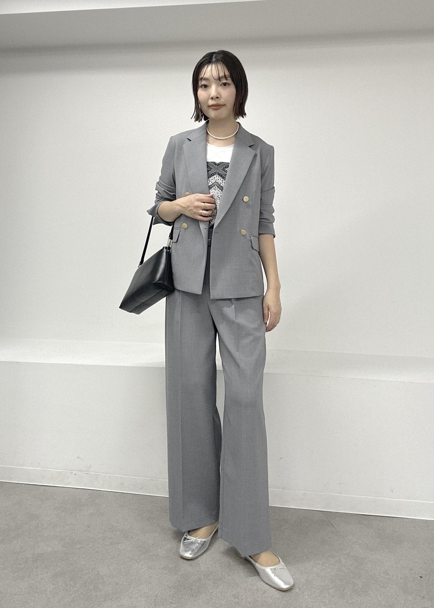 グレーのセットアップでインナーはタンクトップで軽快に春夏らしく♪パールやスカーフ、小ぶりなバッグを合わせて上品にまとめました。