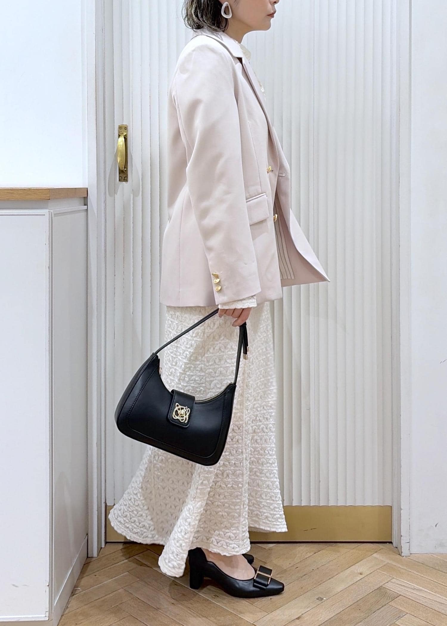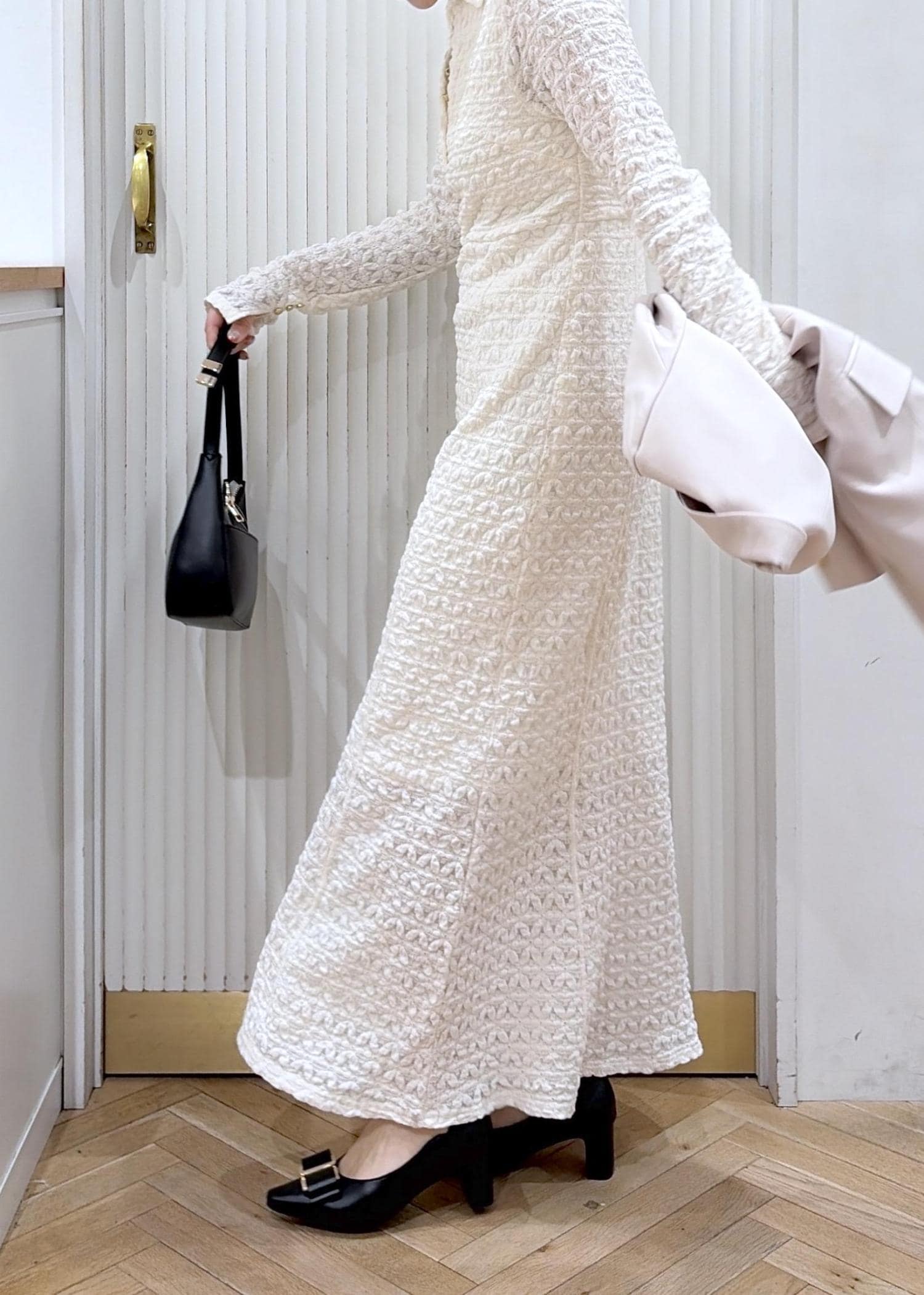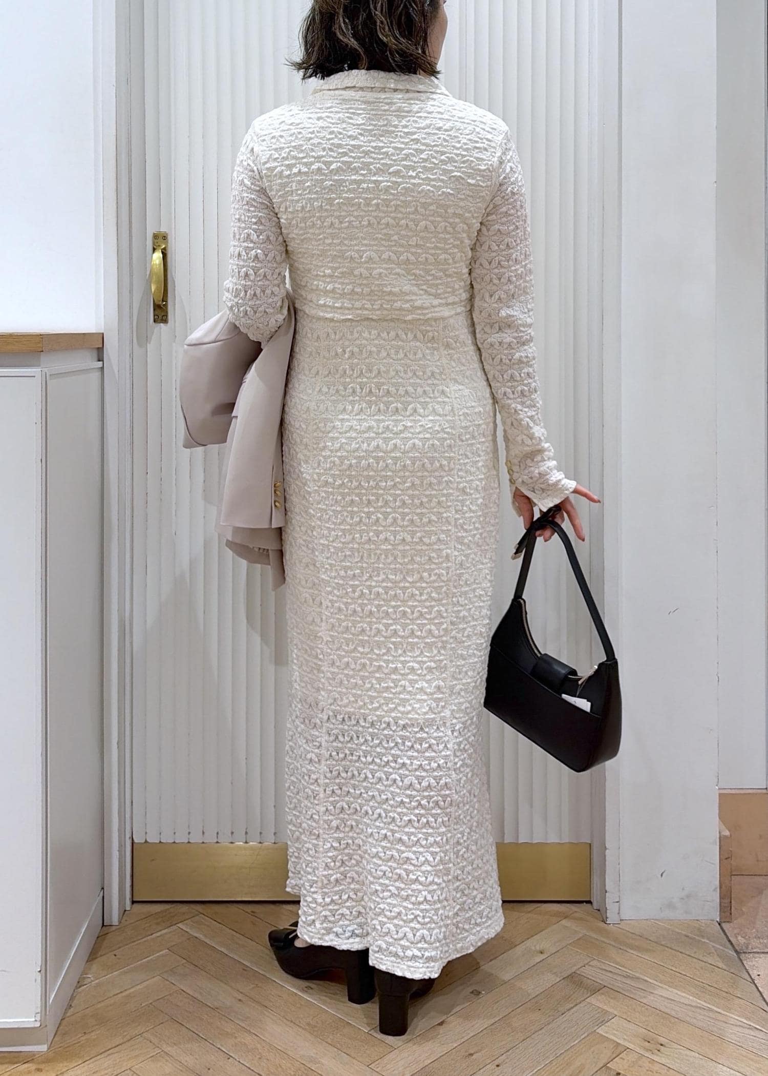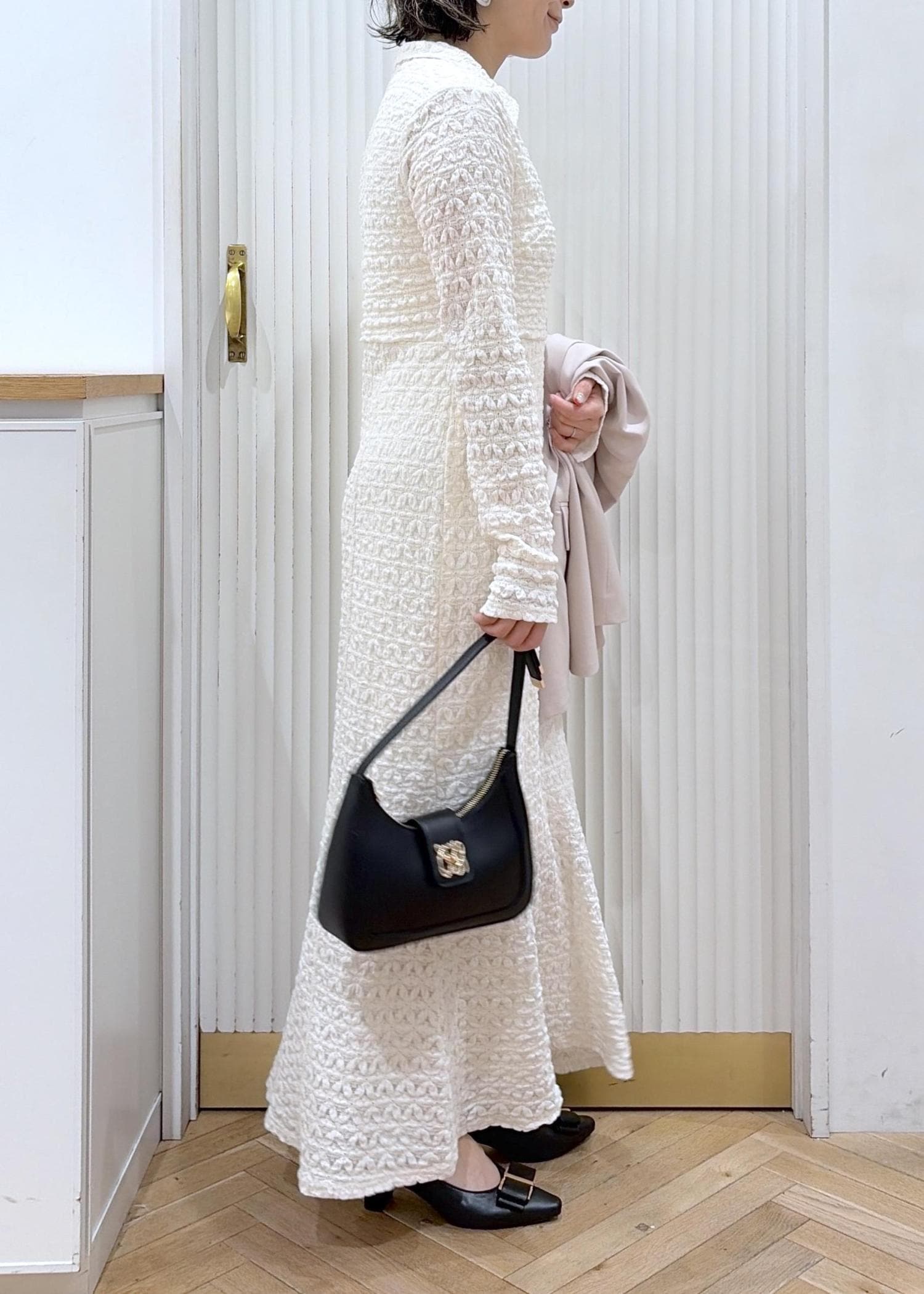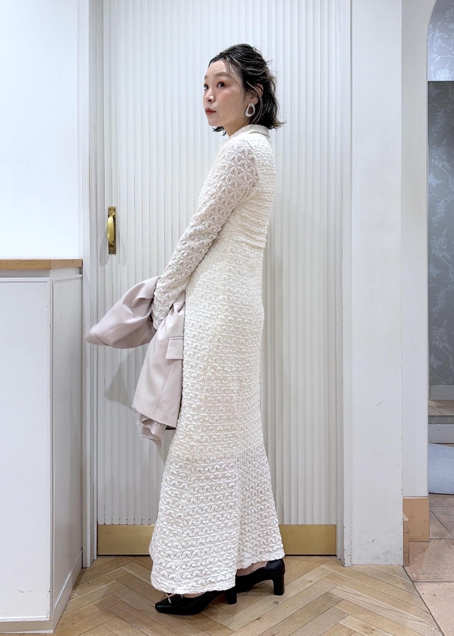 華やかなジャガードワンピースでオフィスでもトレンド感のあるキチンとコーデ。