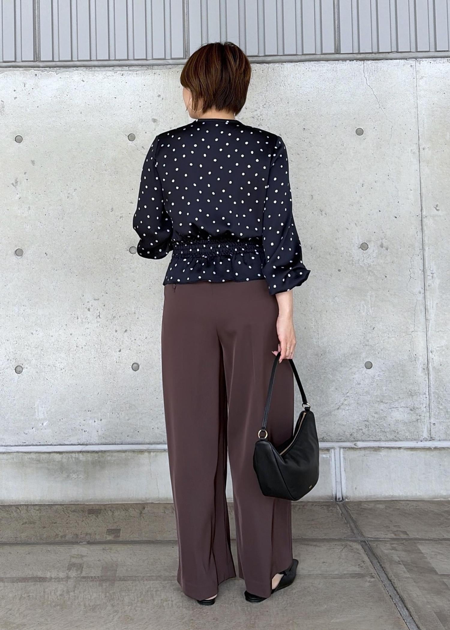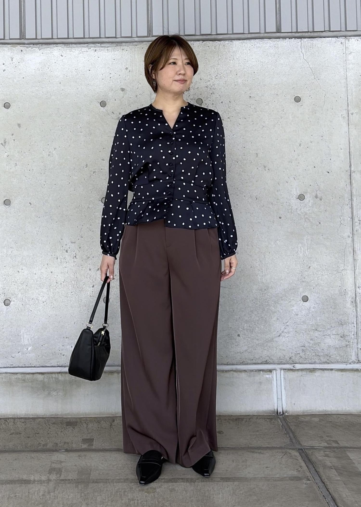大人のドット柄で普段使いしやすいペプラムブラウスです。