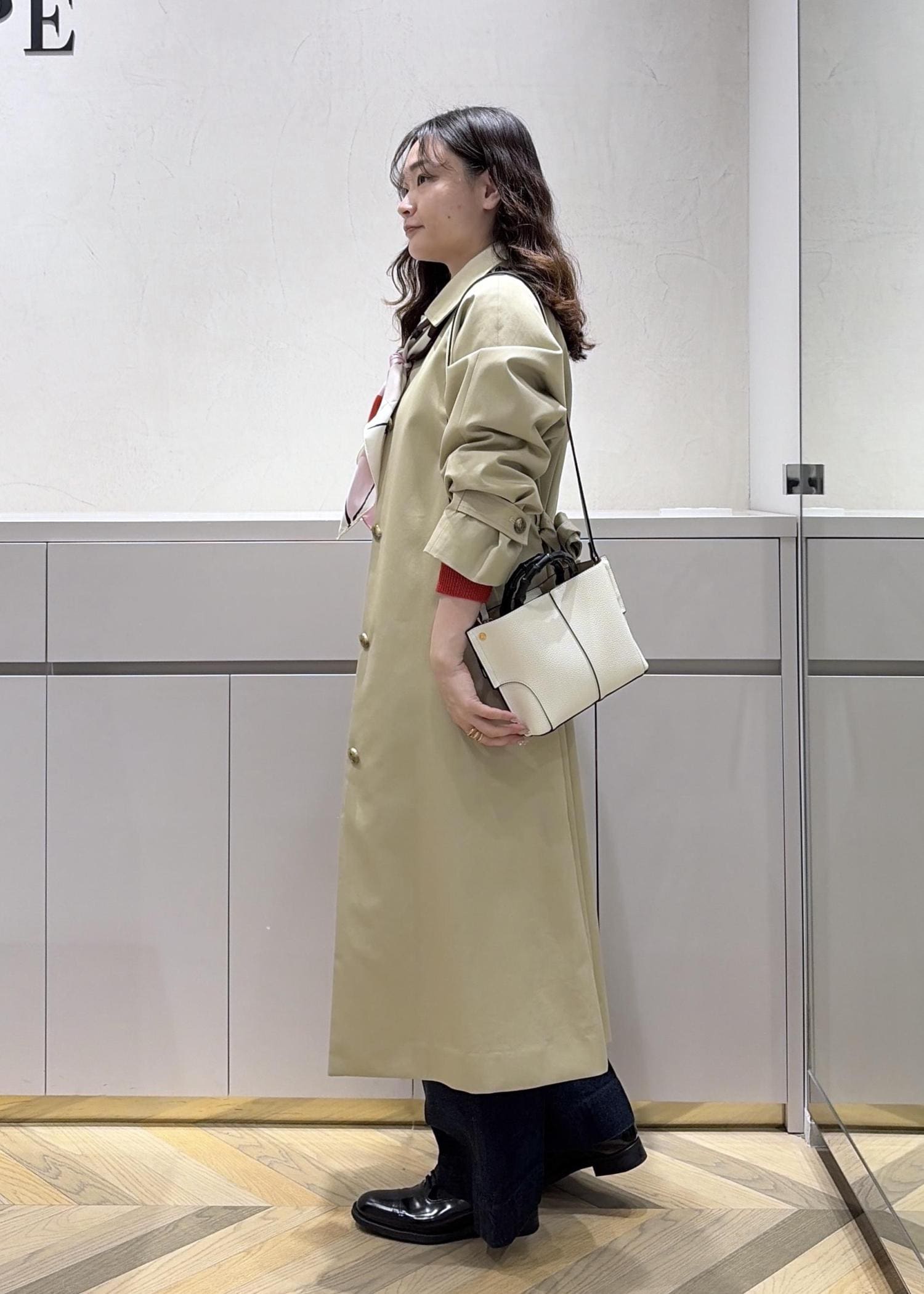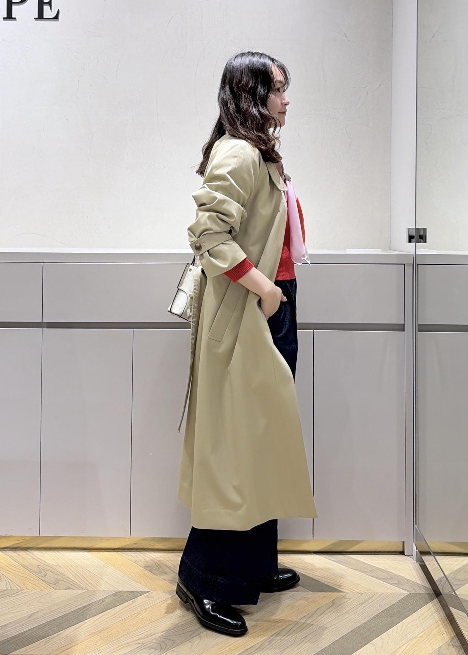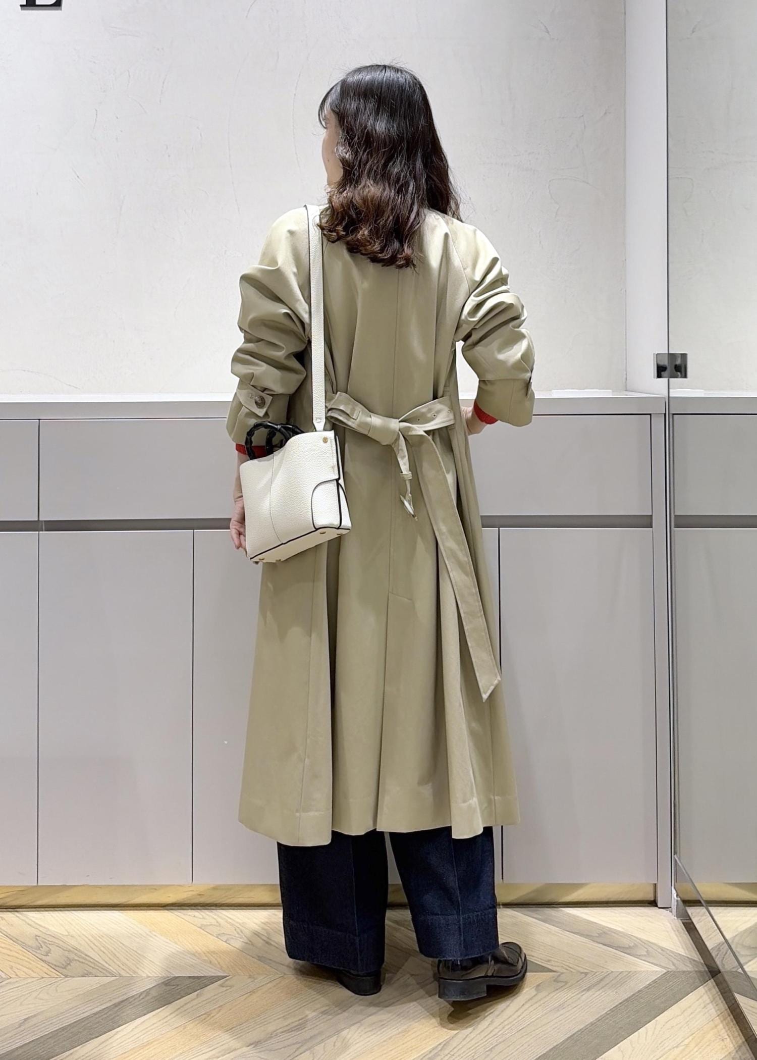 ステンカラーコートが綺麗めな印象なので、