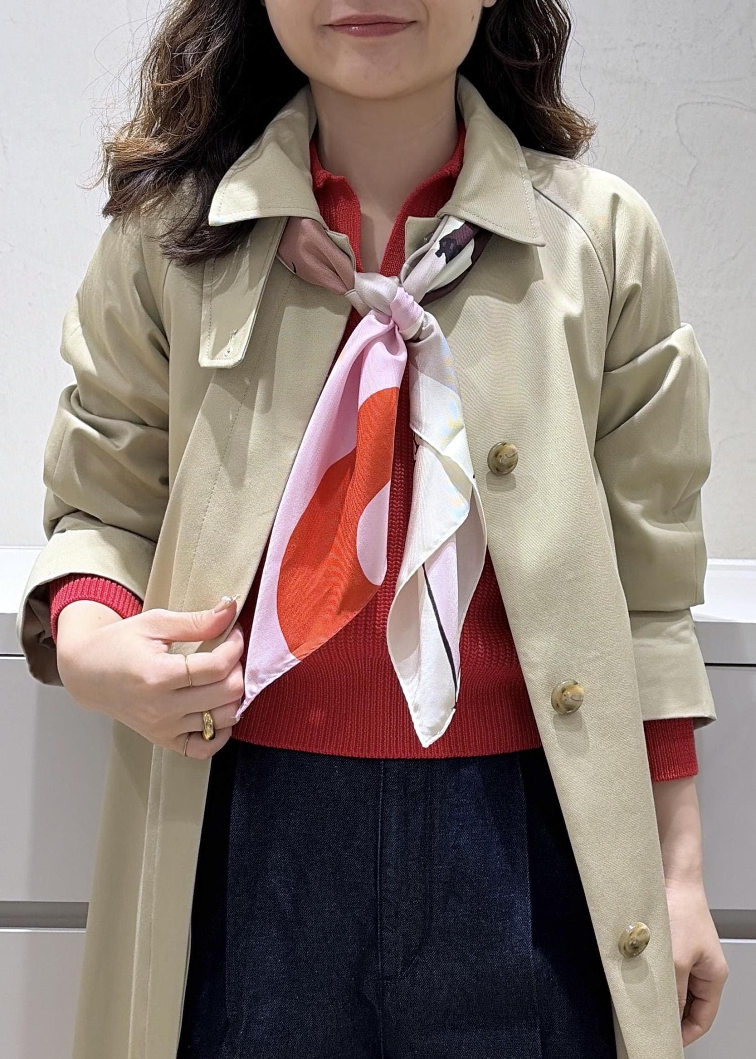 赤を差し色に。春のコートコーデ