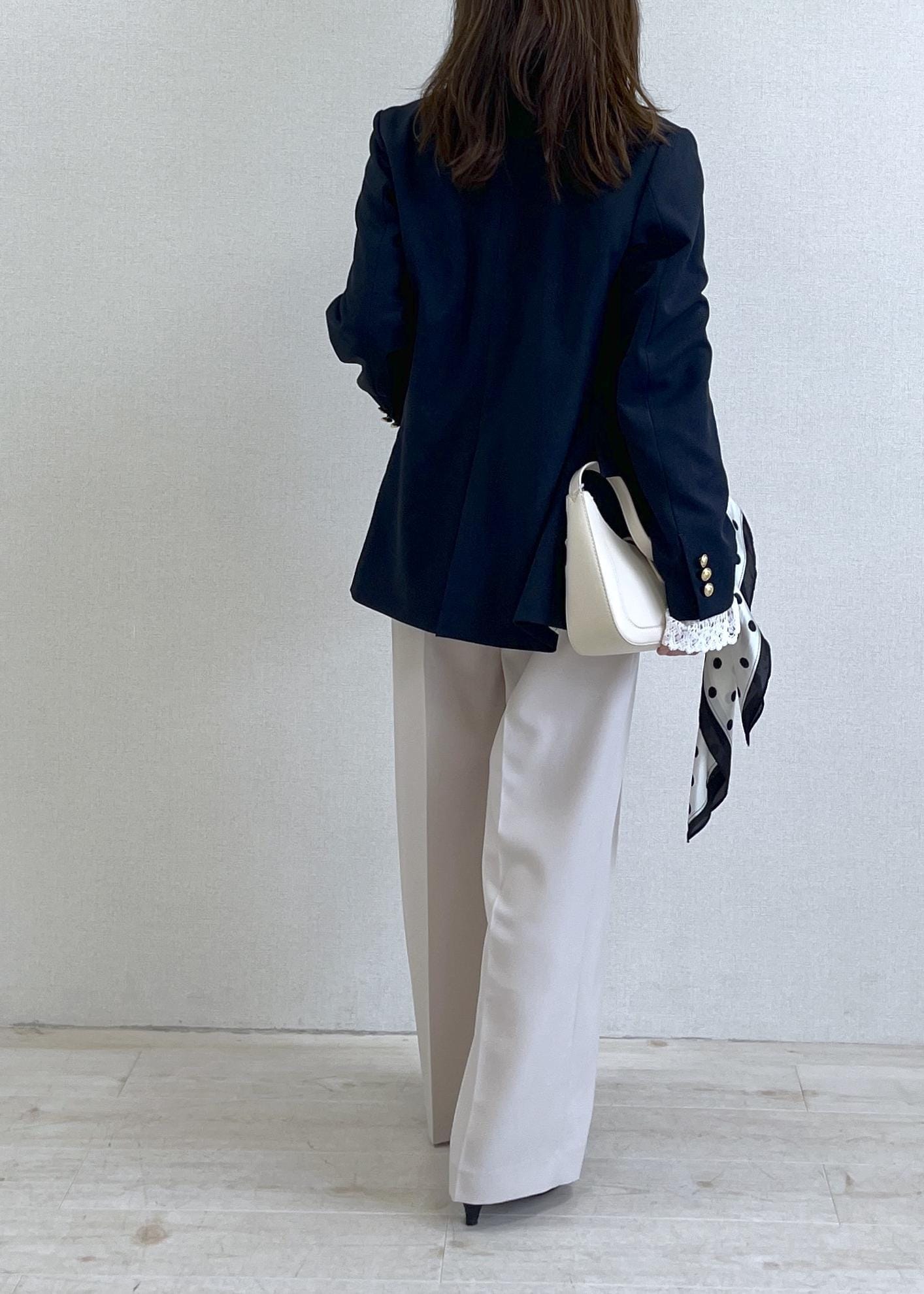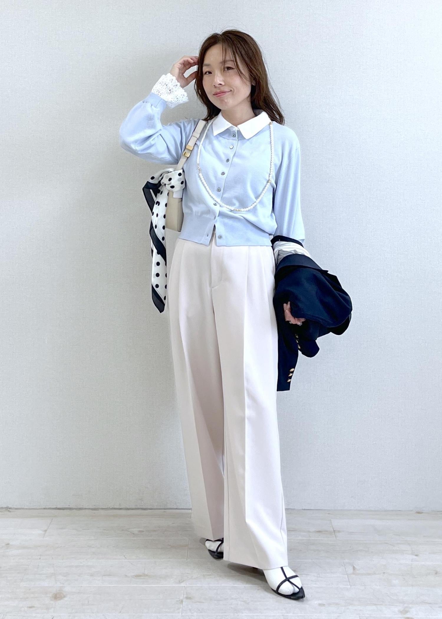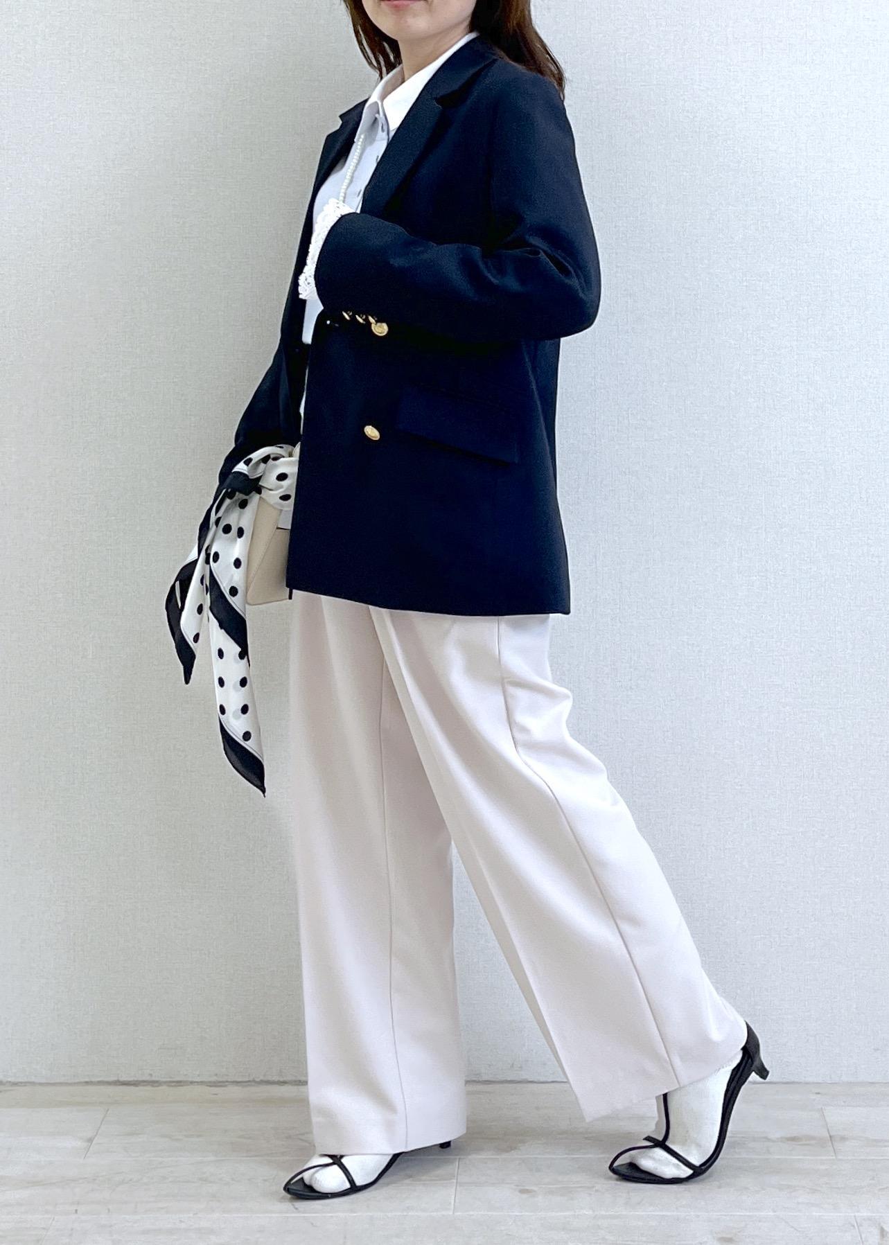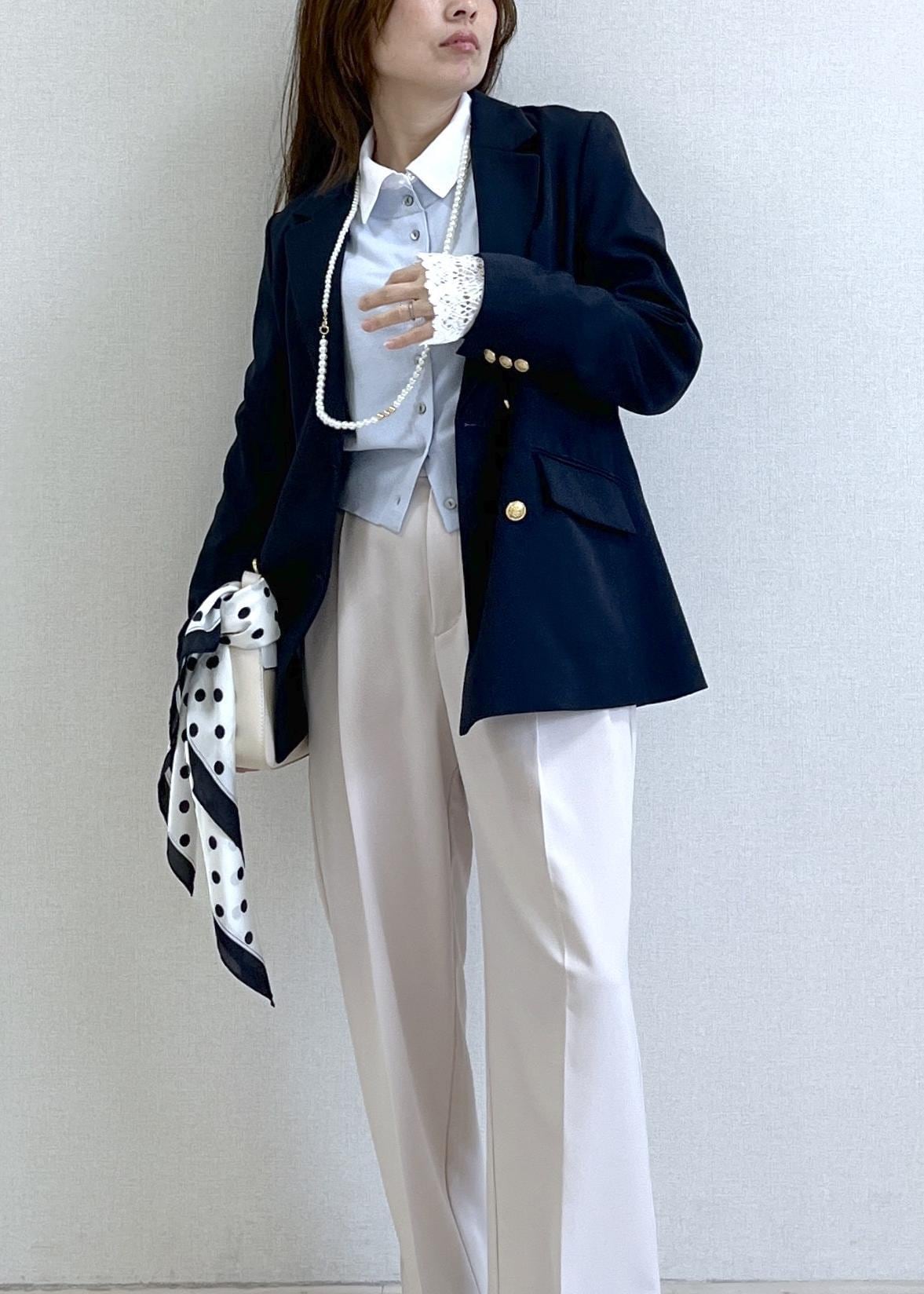 ネイビージャケットに爽やかなサックスカラーを合わせた