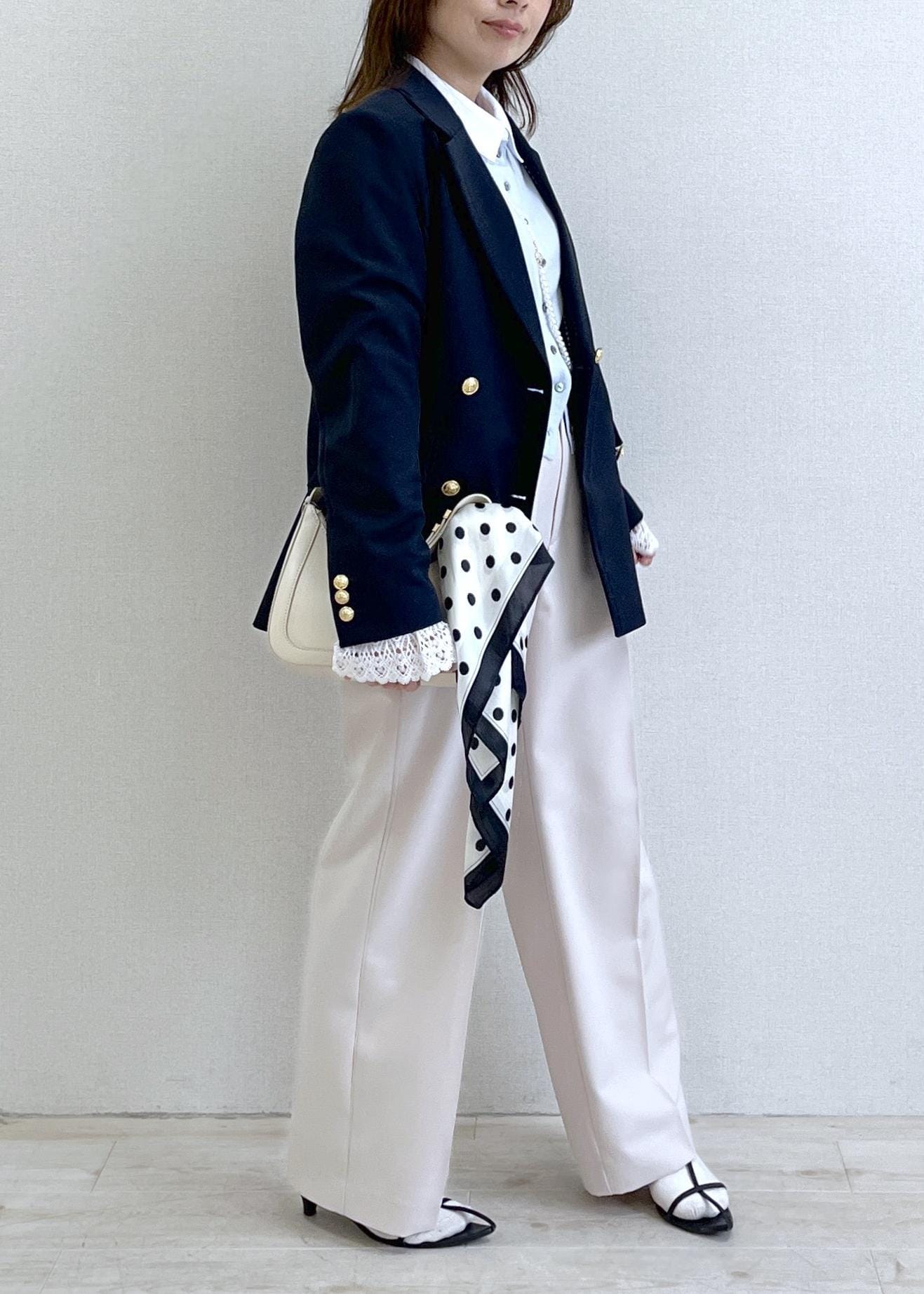 シンプルながらもパールネックレスやドットスカーフで