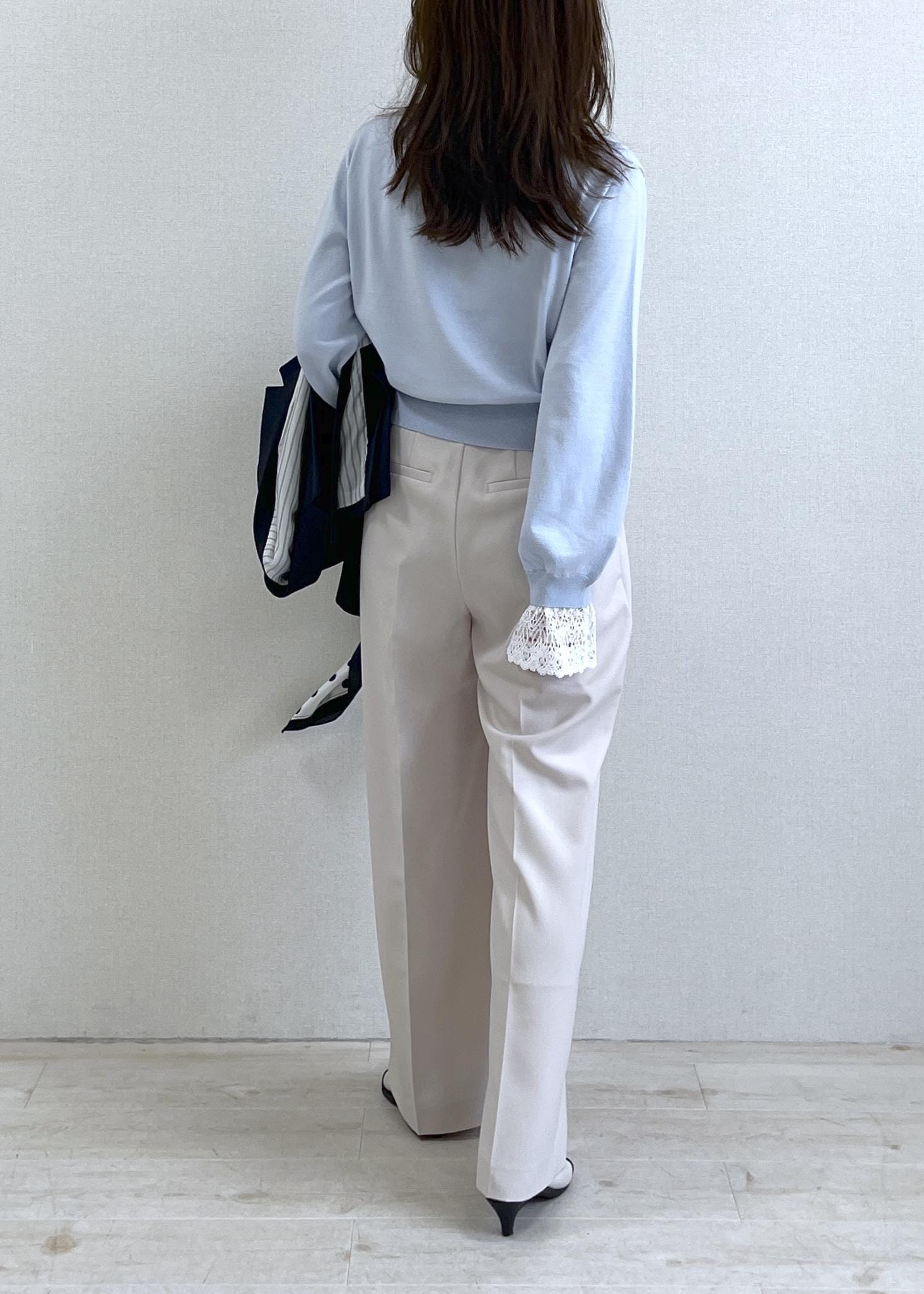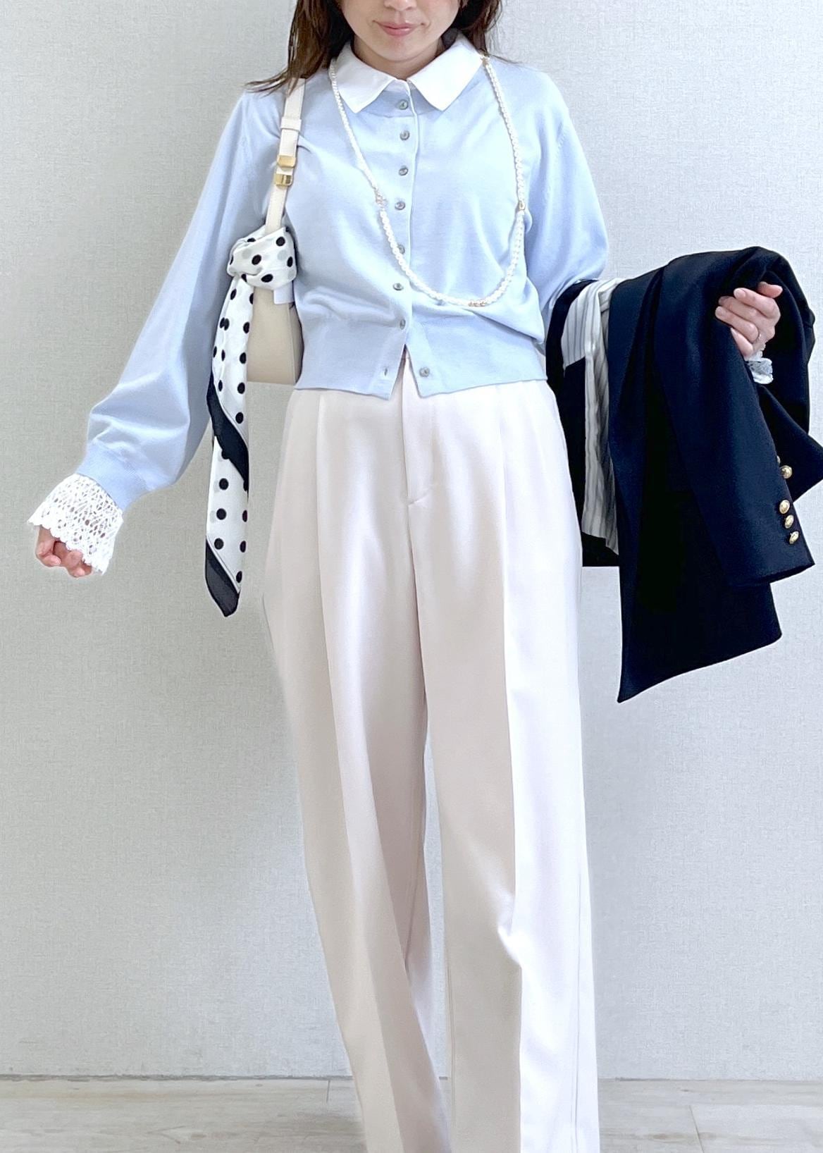 VISレースカフスドッキングニットカーディガンサックス / F¥6,589レビュー襟と袖レースがドッキングした一枚で着映えしてくれるトップスです。着るだけで完成!152cmでFサイズ着用し、着丈は腰に少しかかるくらいのコンパクトな丈。キュッとくびれたウエストが細見えしてくれ、ボタンを開ければ抜け感もプラスできる優秀アイテム。今年はレースをレイヤーするのがお勧めなので、ドッキングしてくれてるのは本当に楽ちんで嬉しい!迷わず手に取れるトップスです。