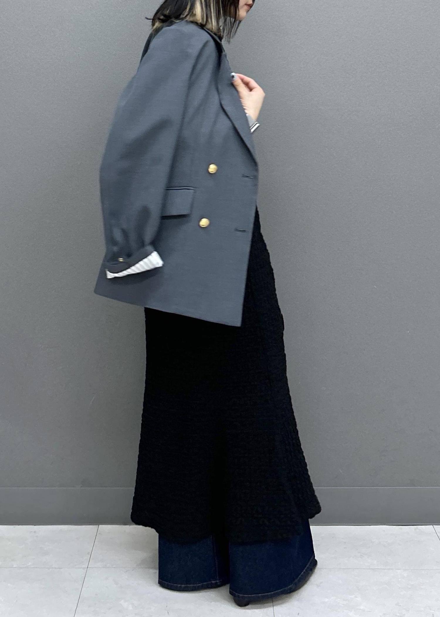 袖丈は親指の第一関節にかかるくらいで、2回捲るとストライプの裏地がチラッと見えてカワイイです♡!