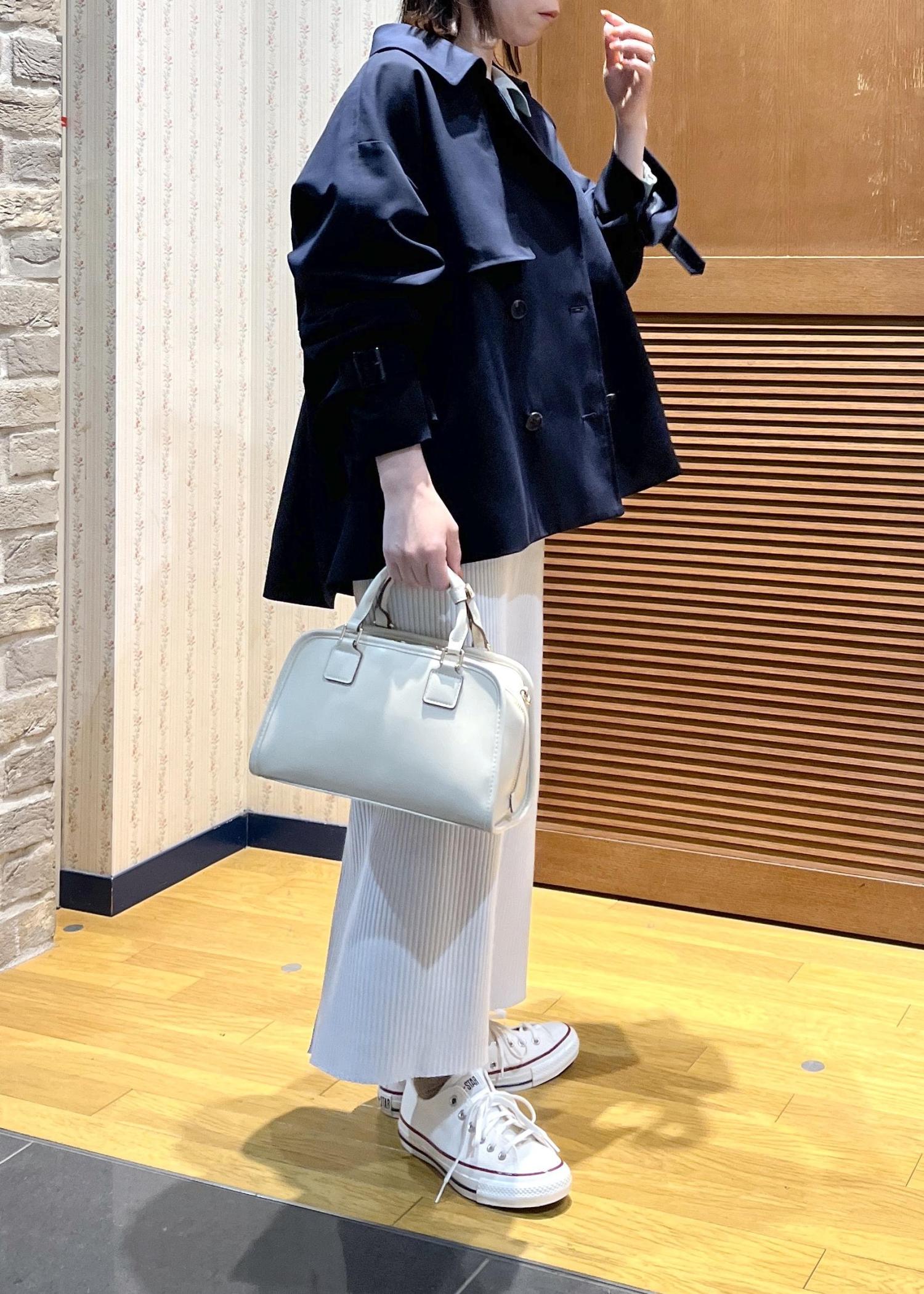 グリーン×ホワイトのきれいめカジュアルなスタイリングにショートトレンチを合わせた春コーデです。