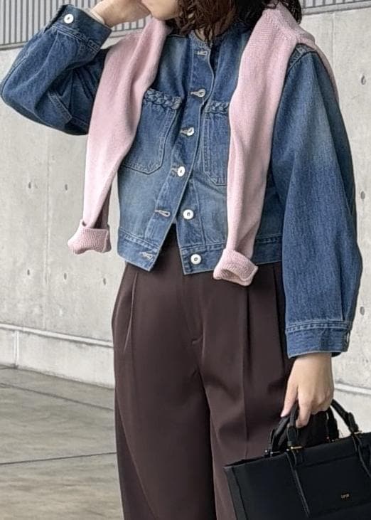 ノーカラーとコクーンシルエットが女性らしく、さりげないポケット部分の編みがアクセントの春に大活躍するデニムジャケットです。ゆったりしたクロップド丈で重ね着もしやすいです。
