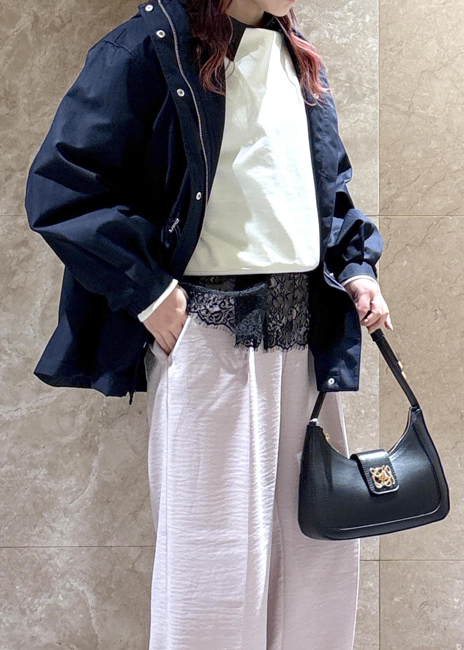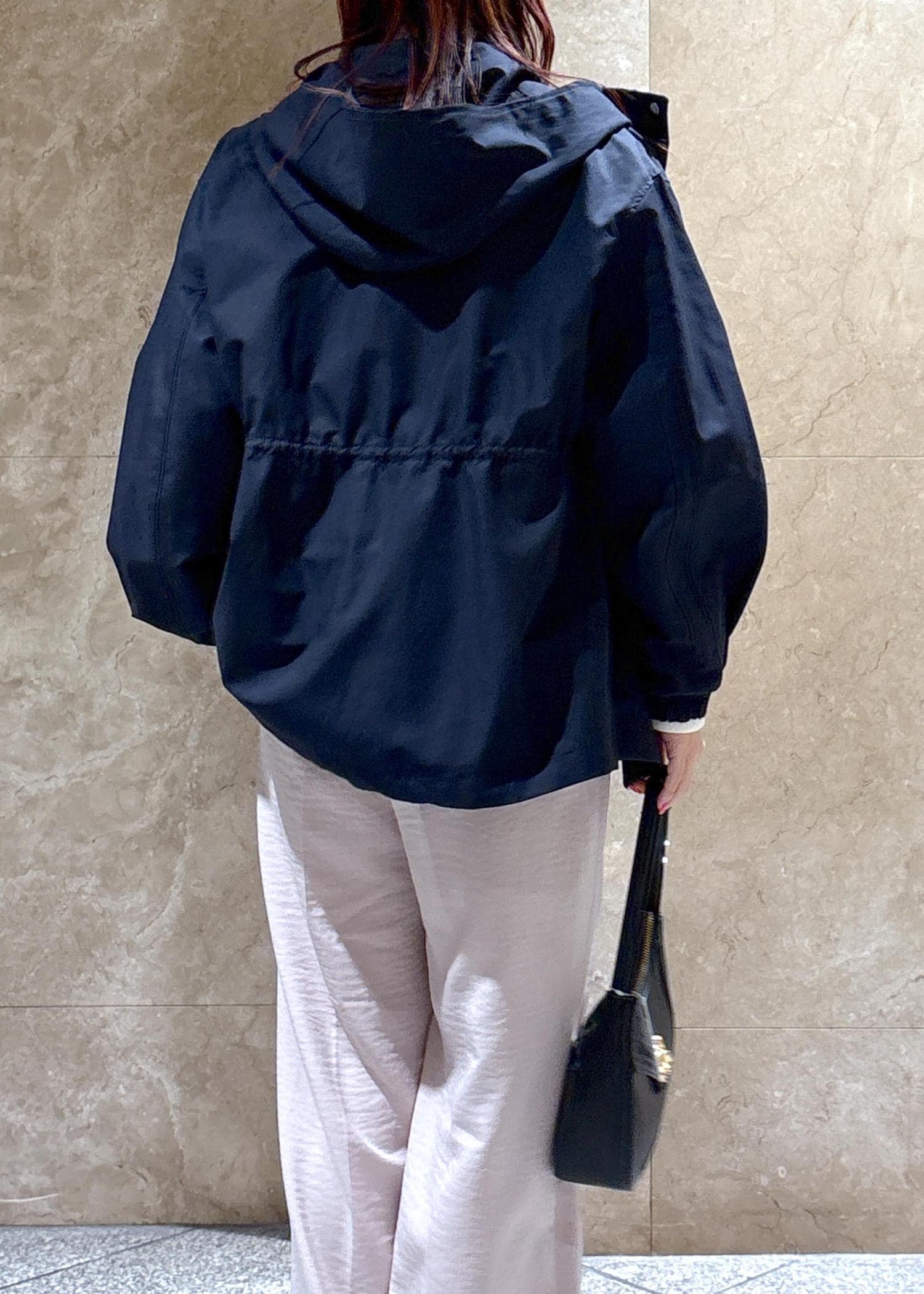 ネイビーのマウンテンパーカーにピンクのパンツで、全体が暗くならないように春らしさをプラス♪