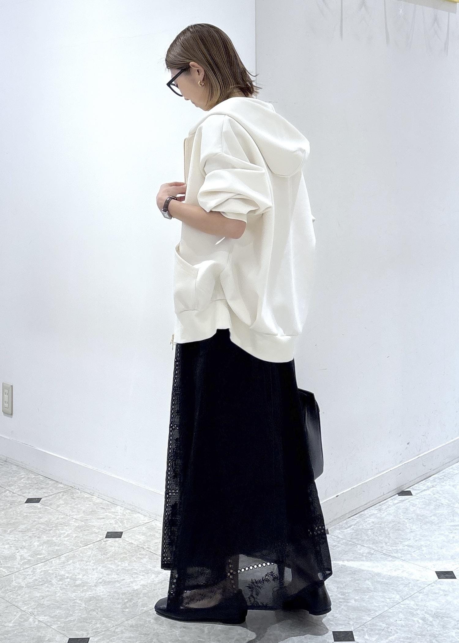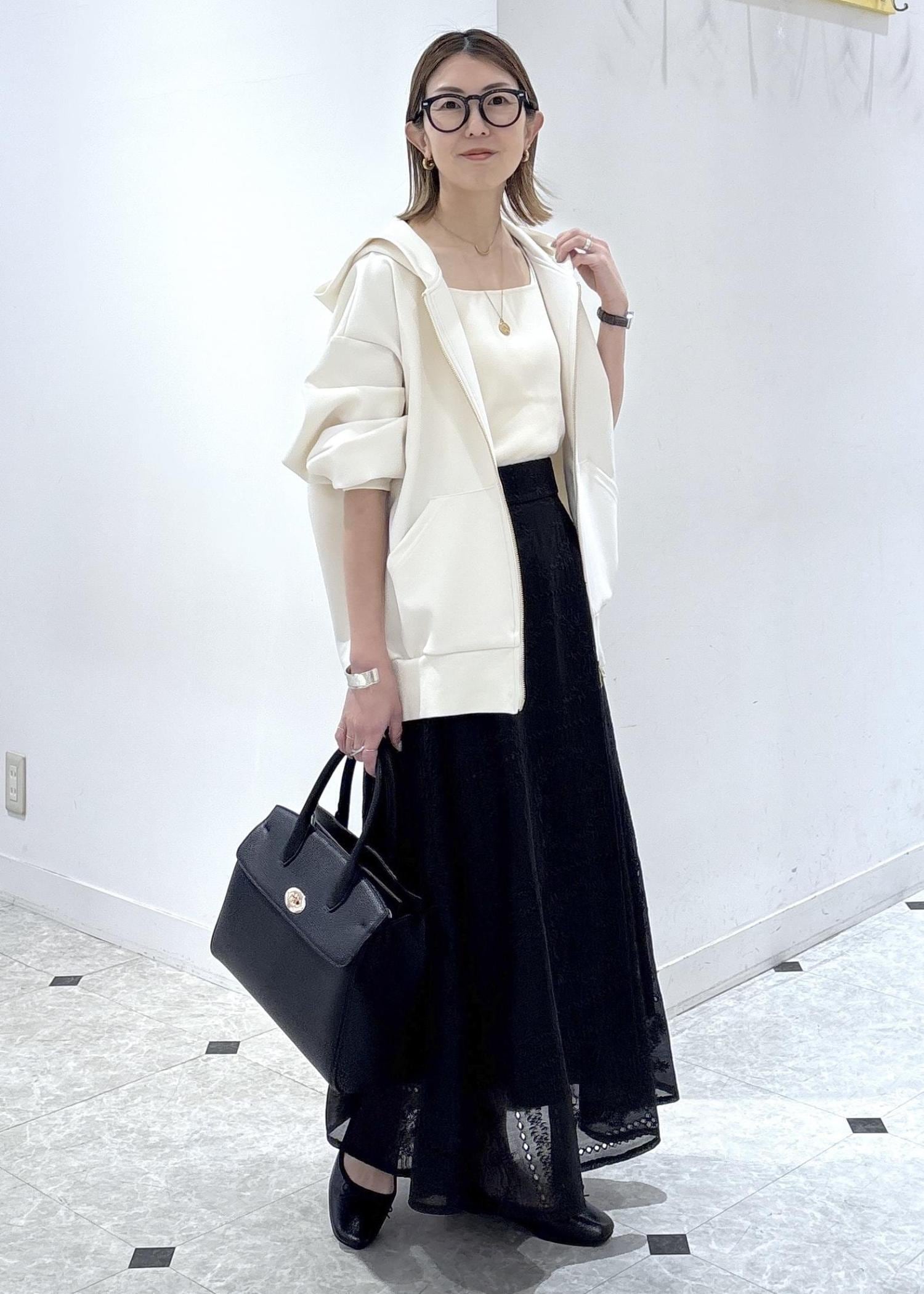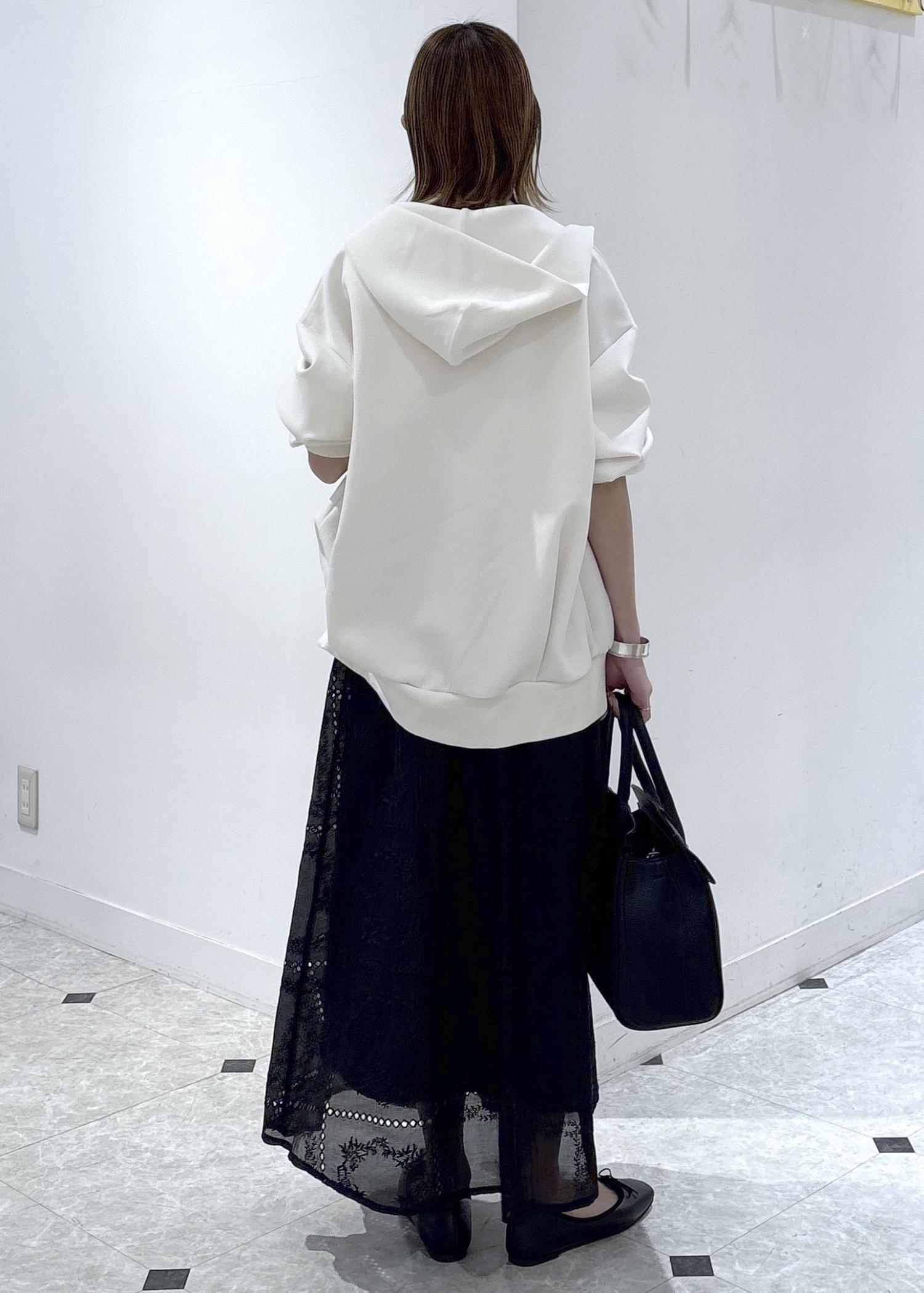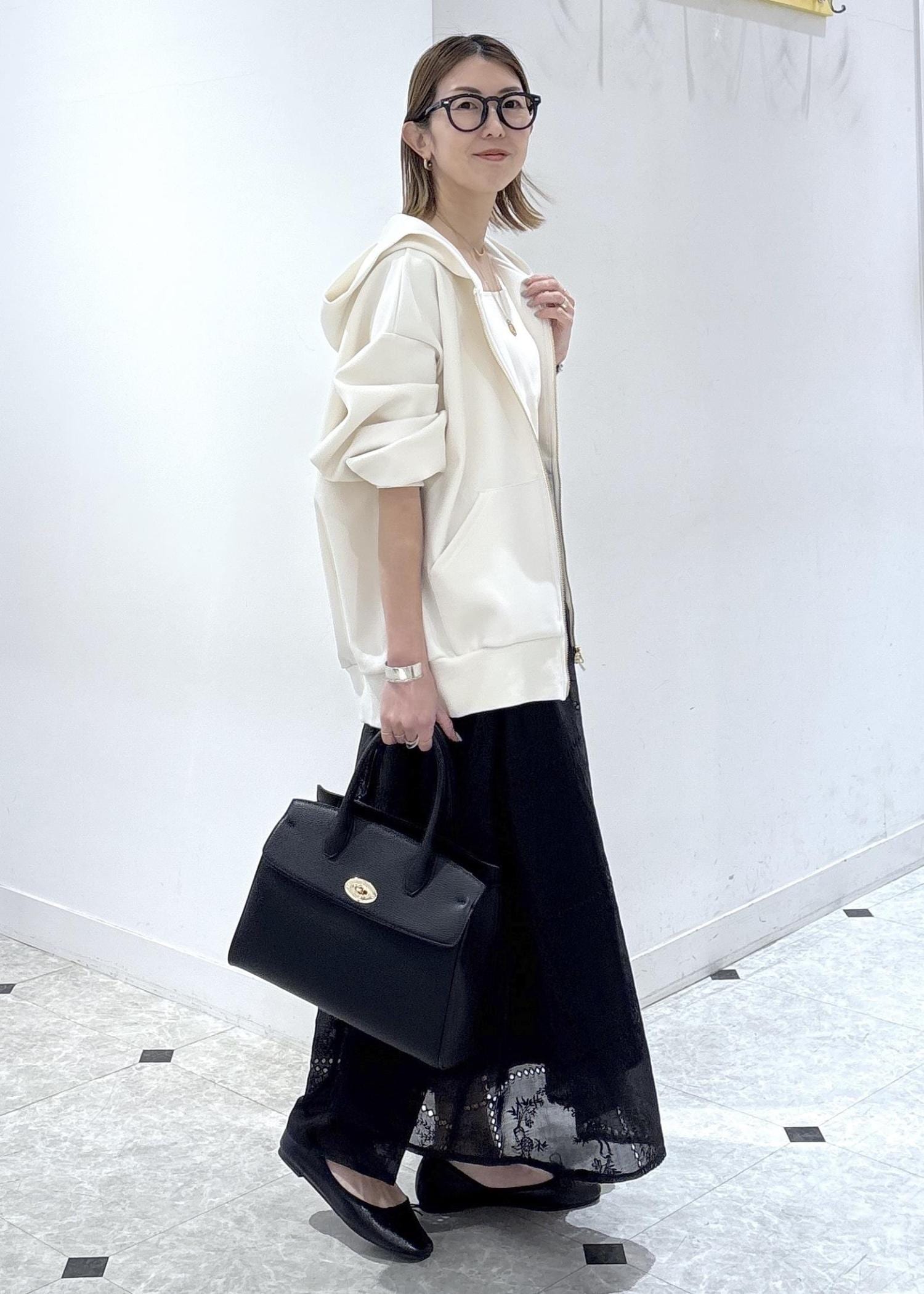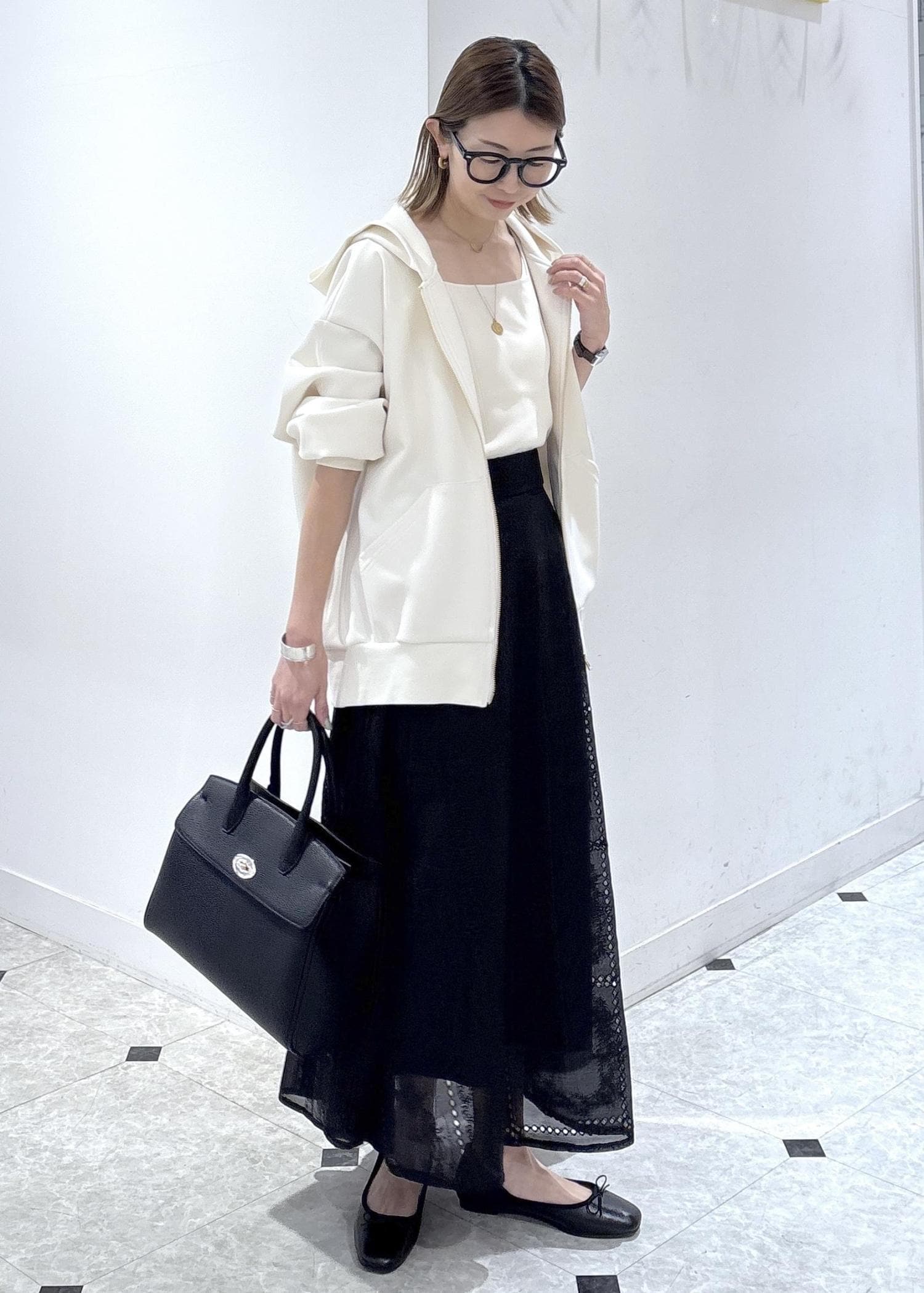 カジュアル見えしやすいフーディはモノトーンで合わせると大人な印象に…