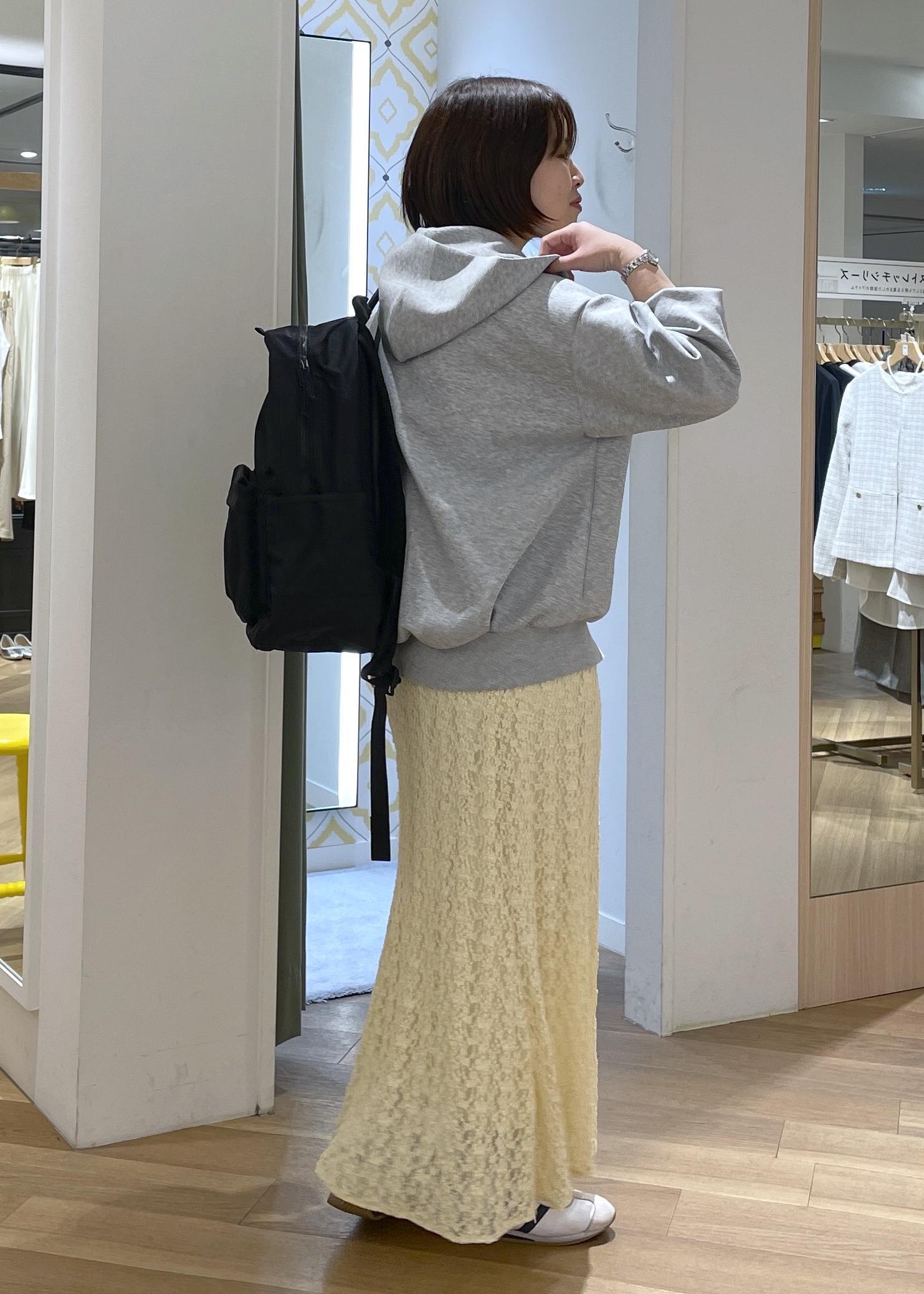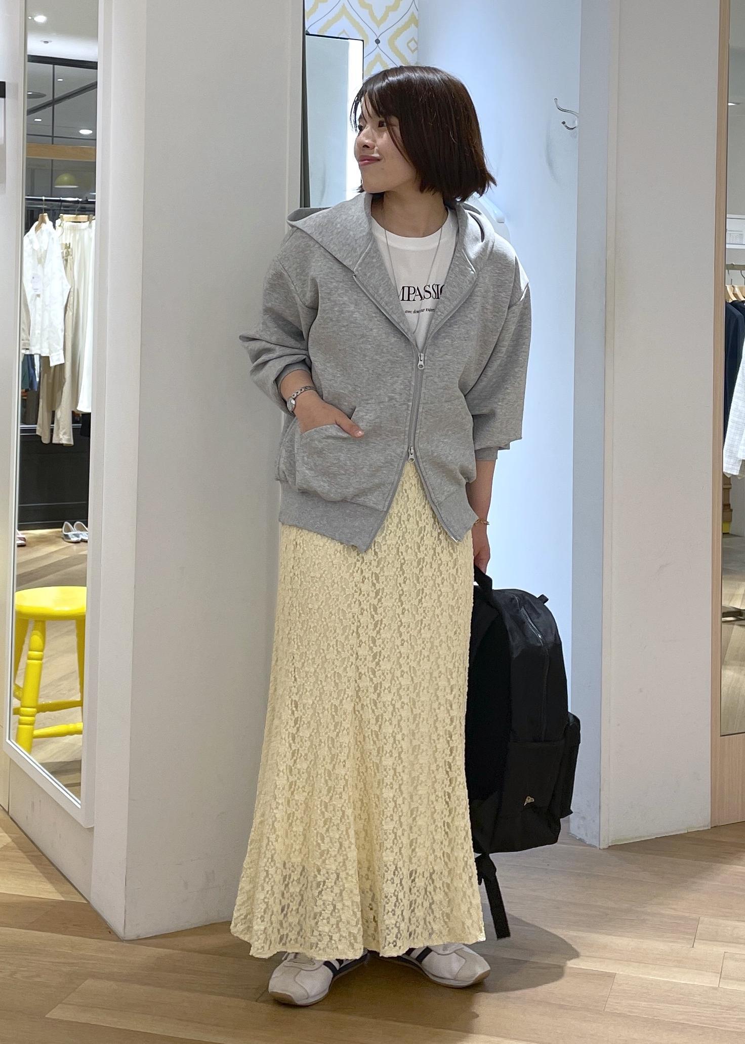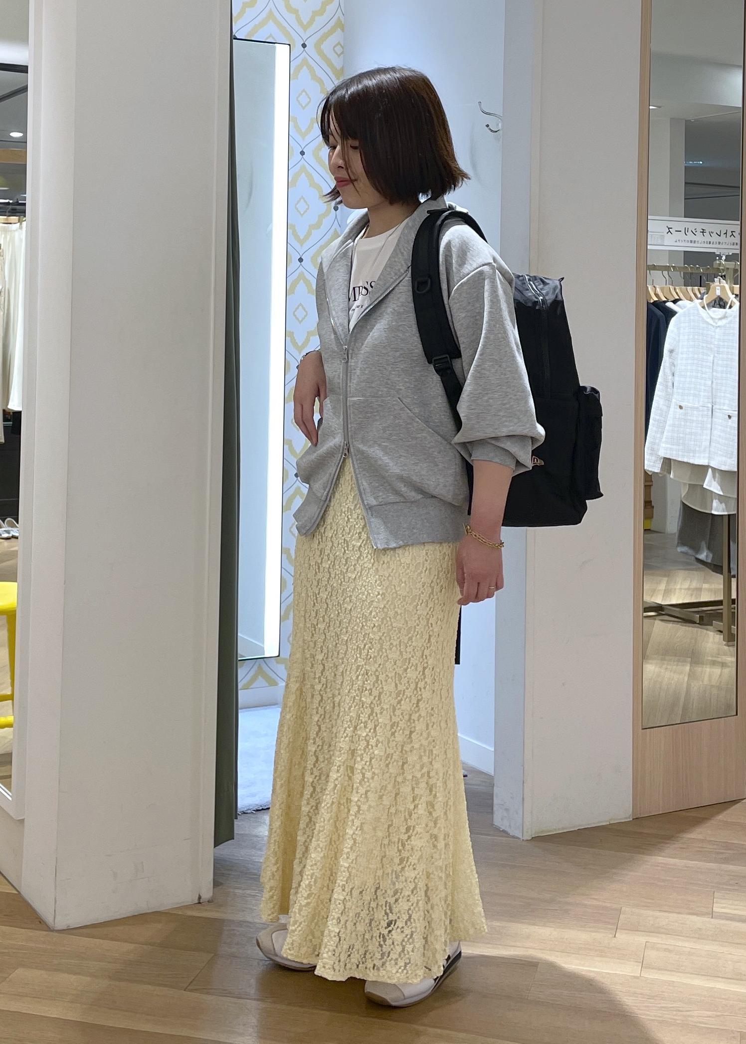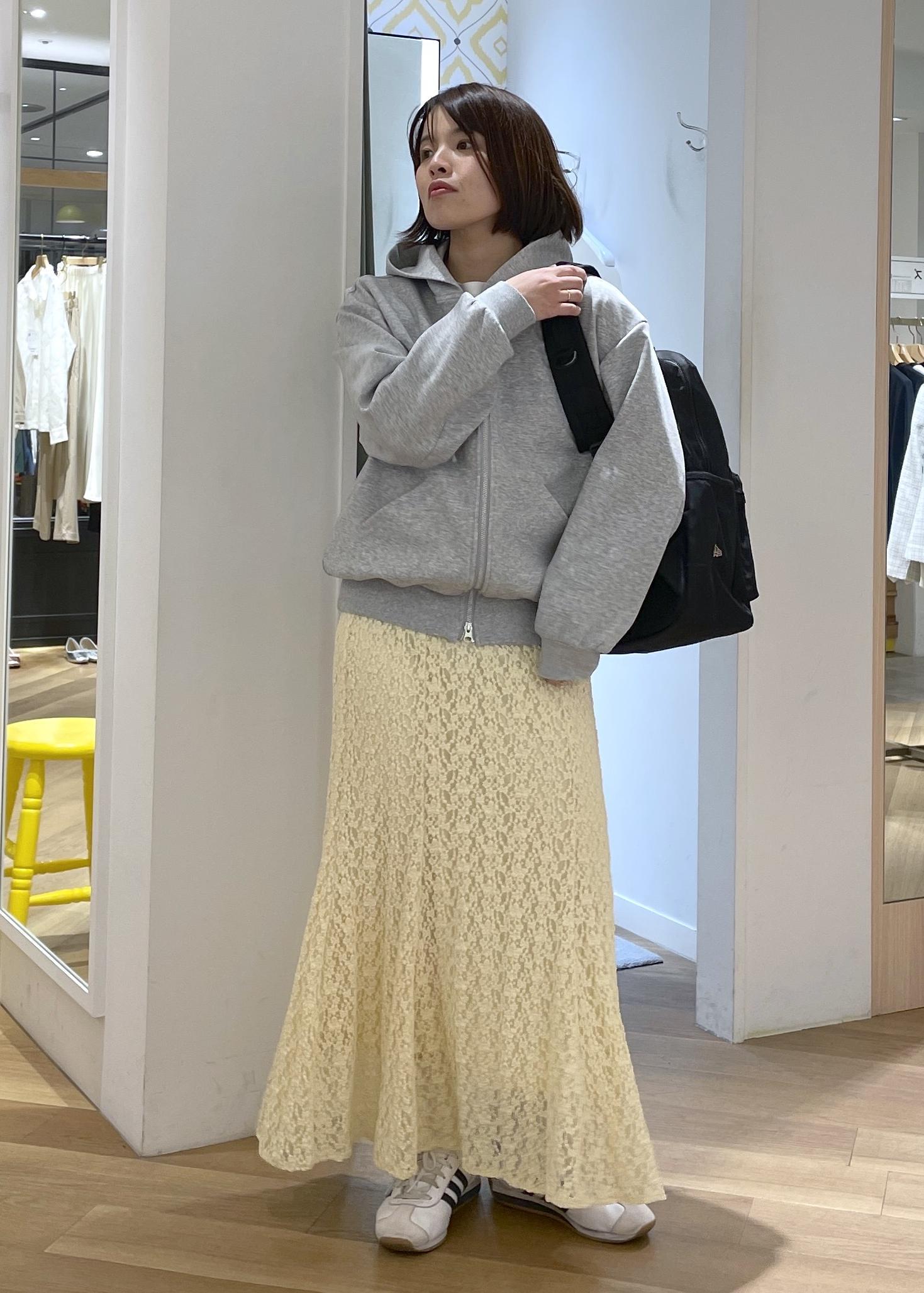 グレーのパーカーに春らしいイエローのレーススカートを合わせたスポーツミックスコーデです!