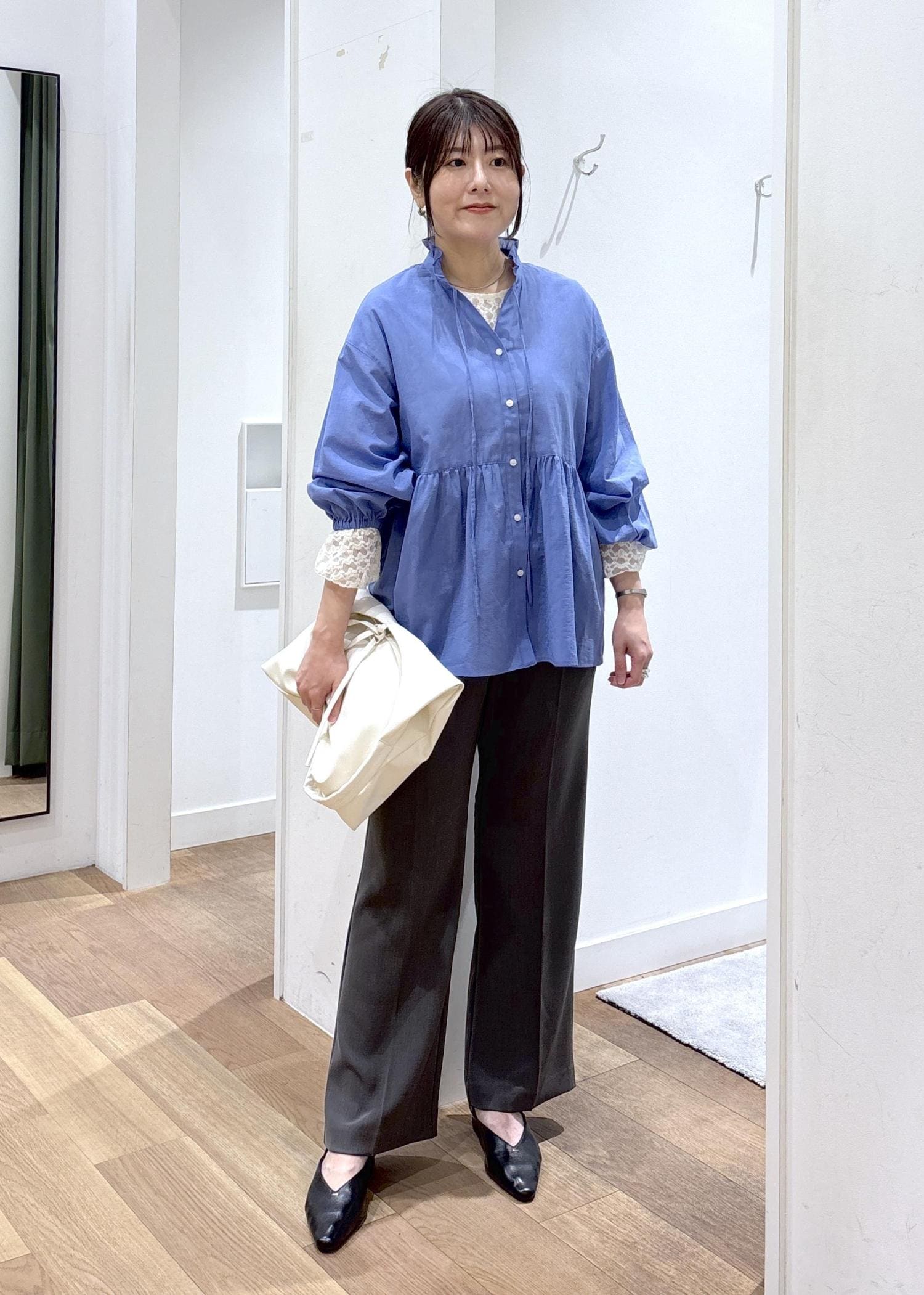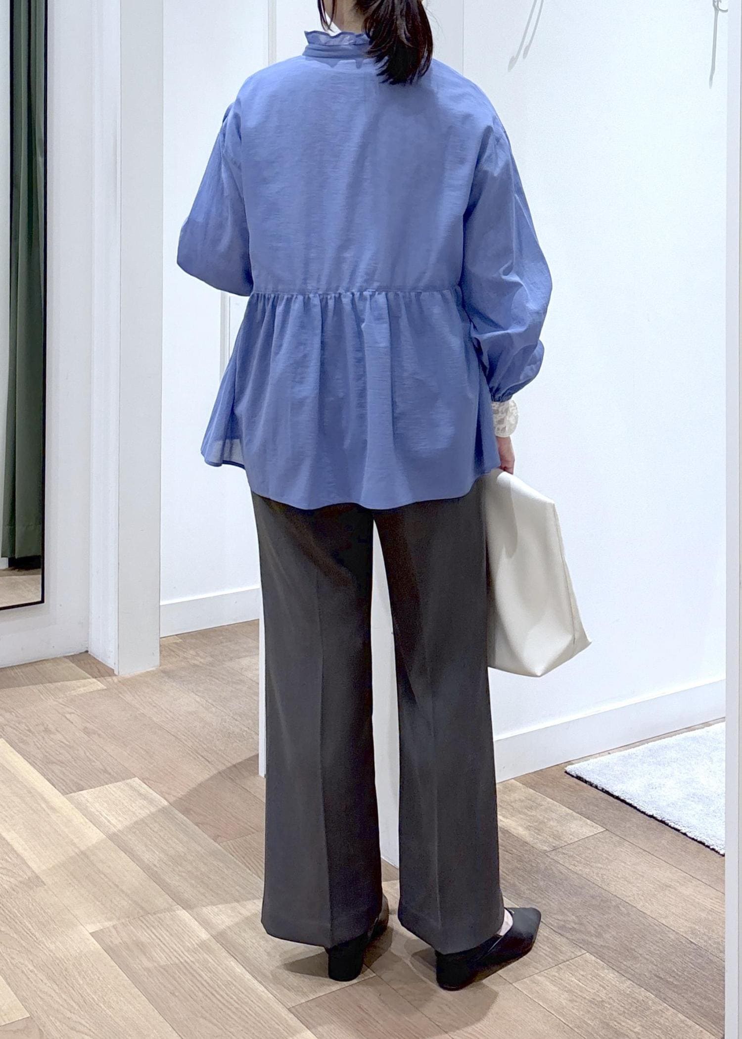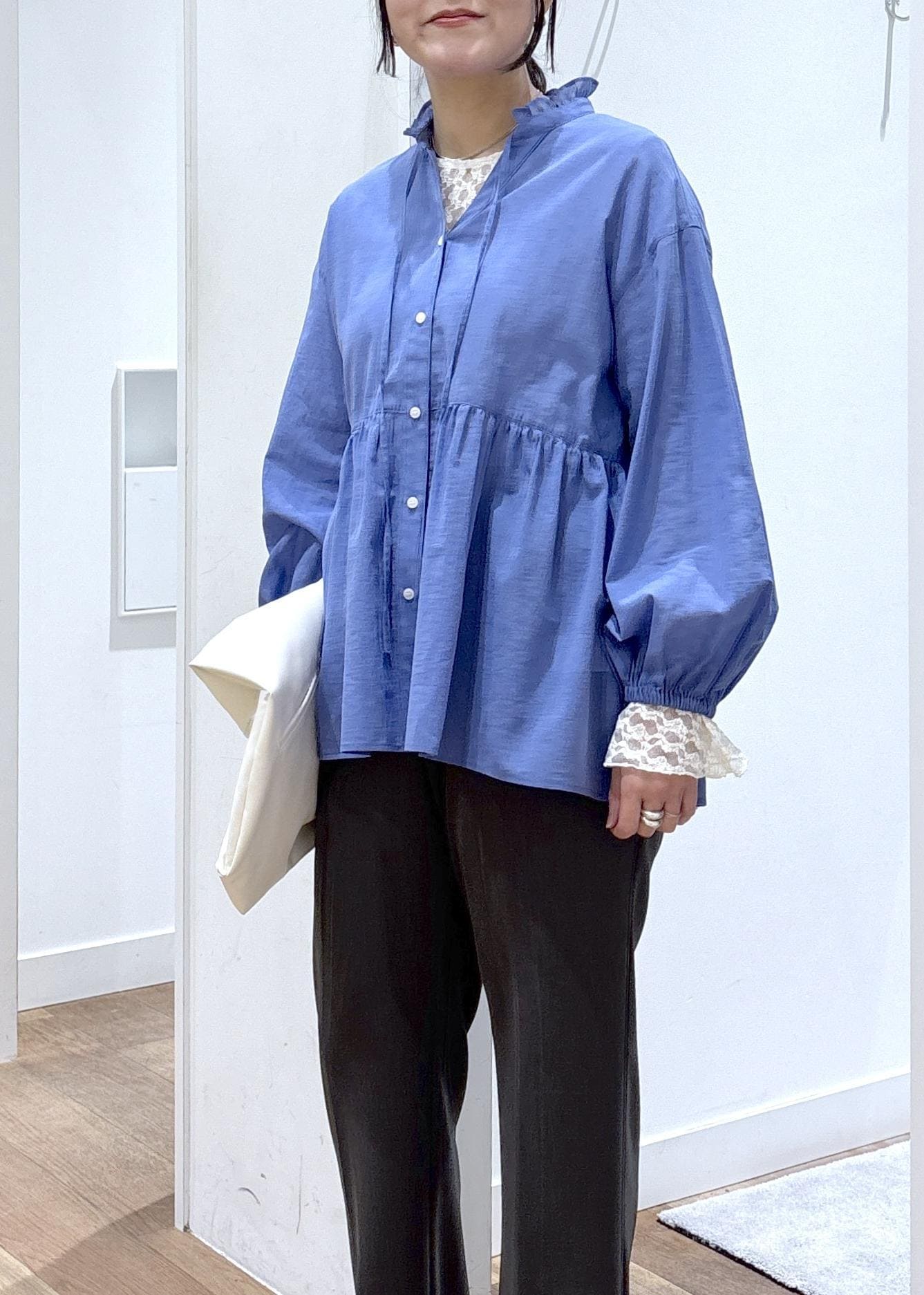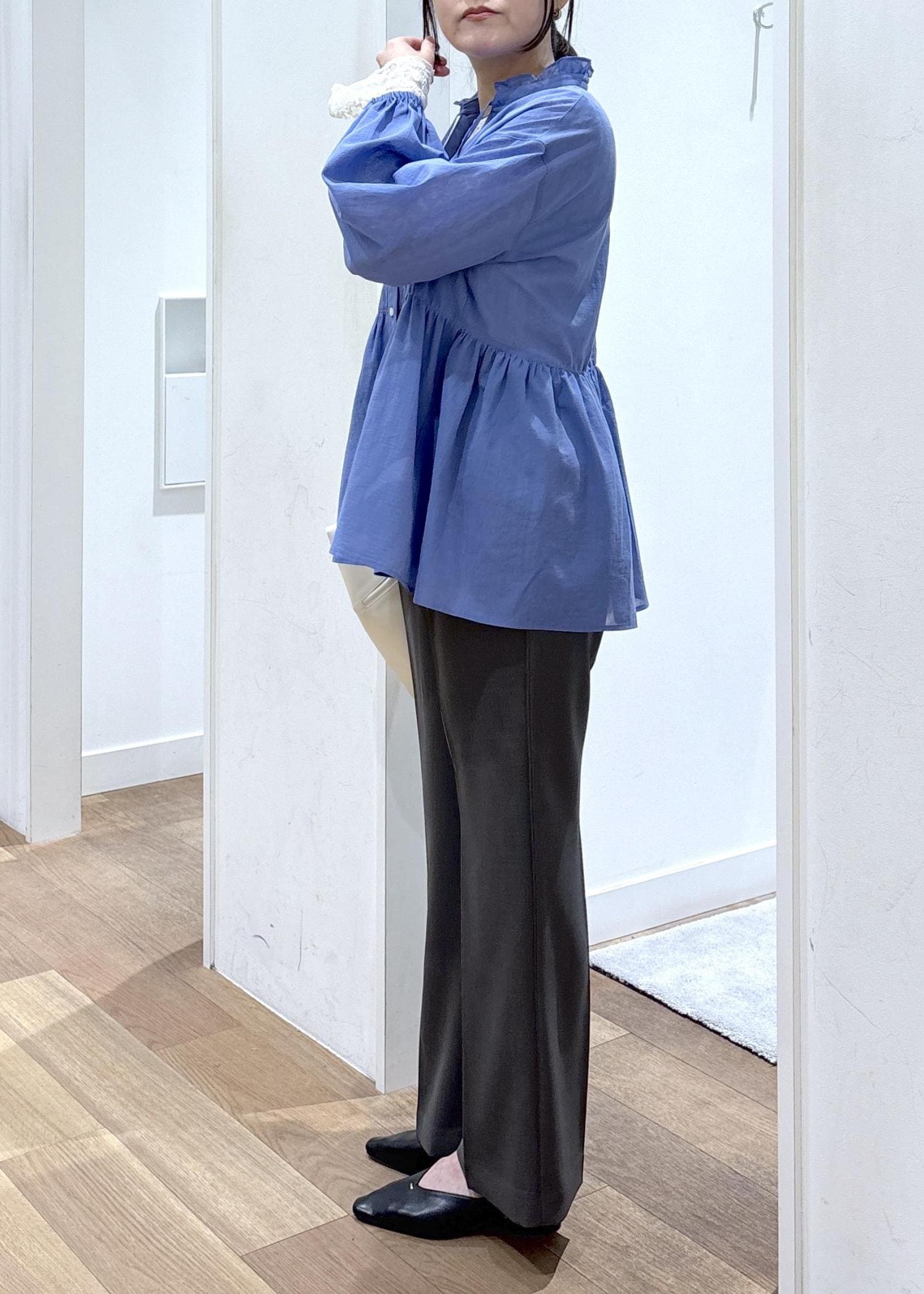 首周りのフリルやペプラムがポイントのシャツに、