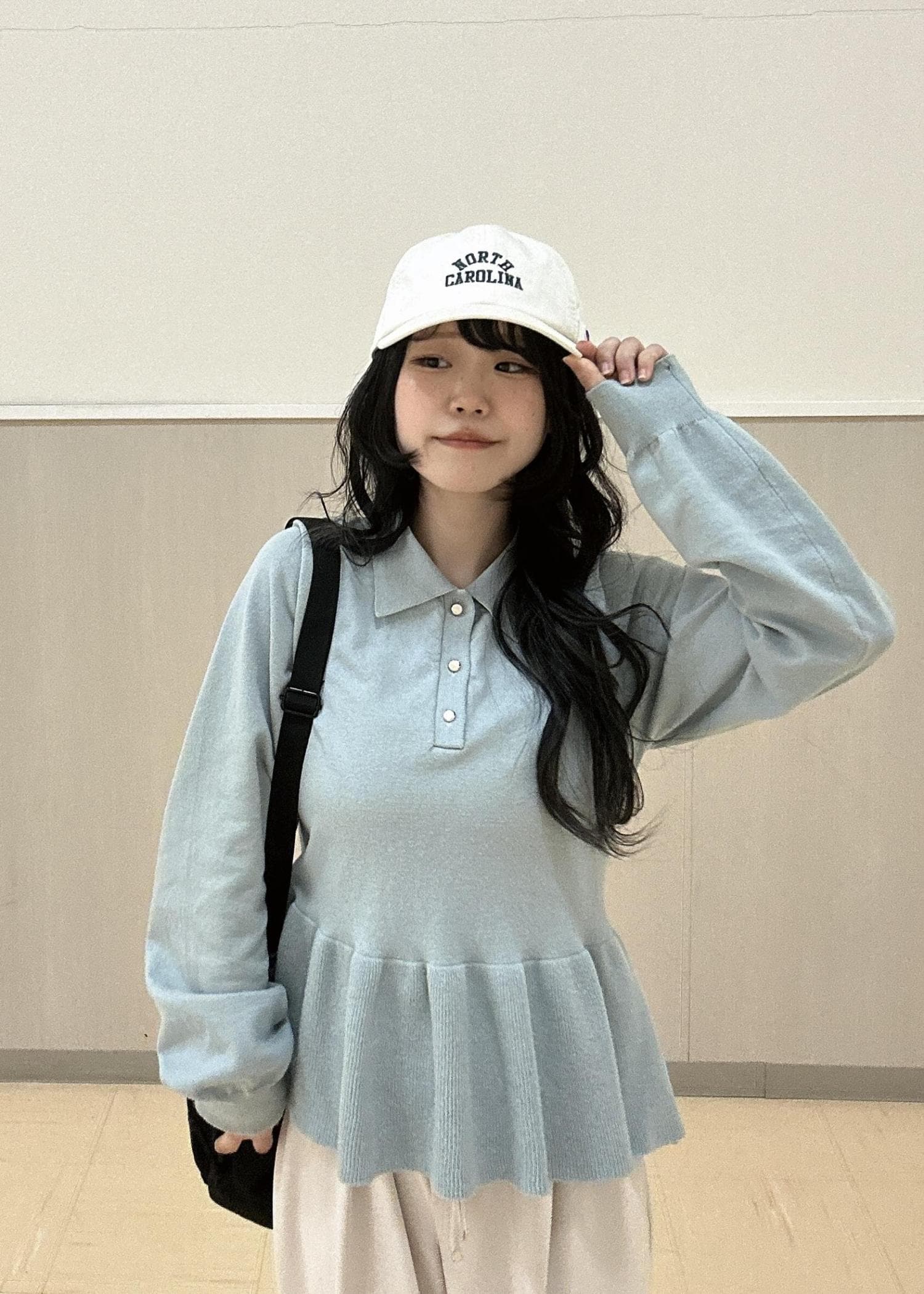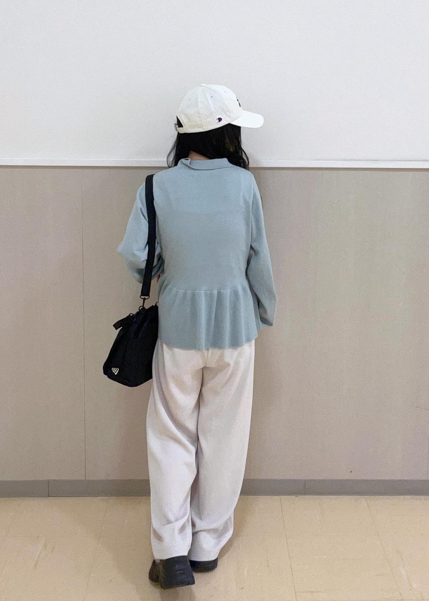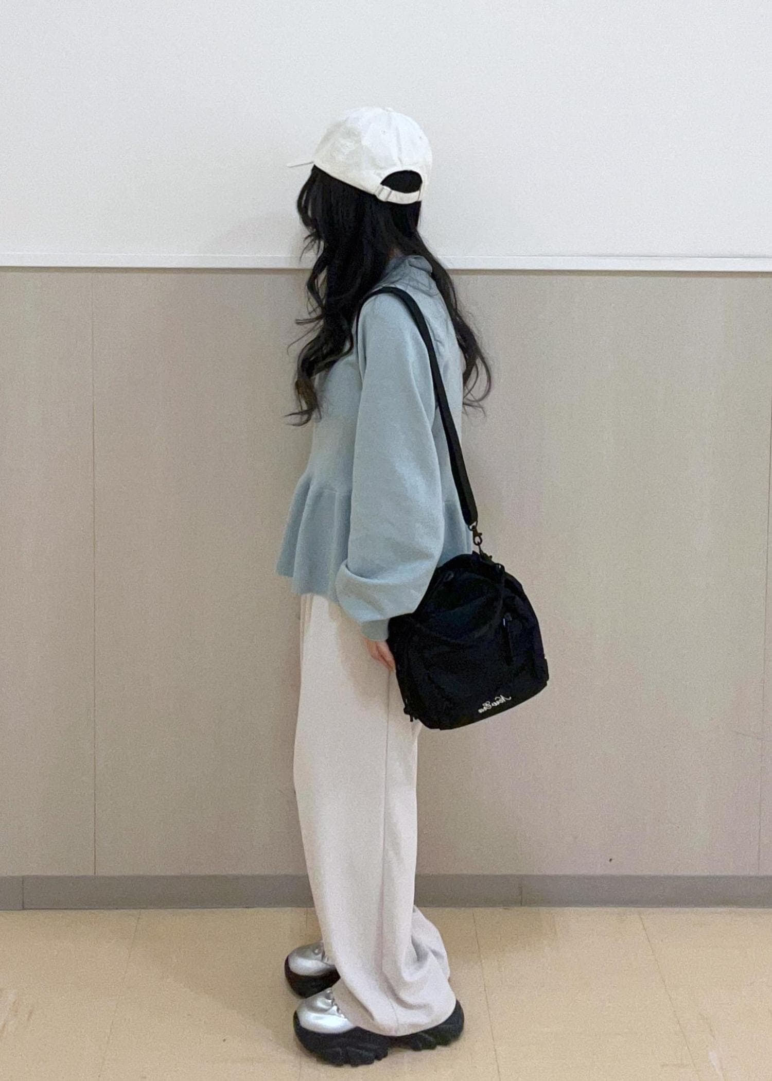 ペプラムニットのキレイめなシルエットとゆるっと履けるパンツを合わせて、キャップとバッグでスポーティさも加えたコーデにしました