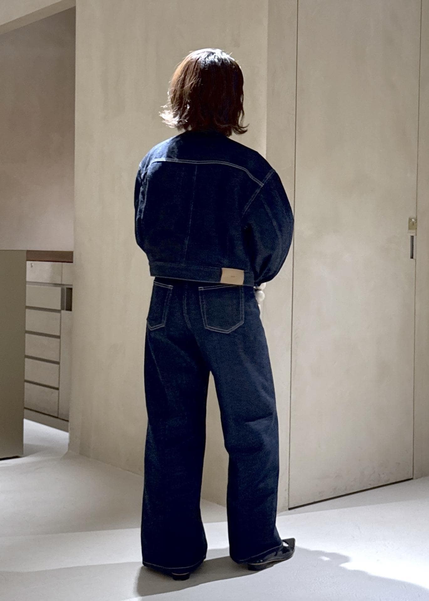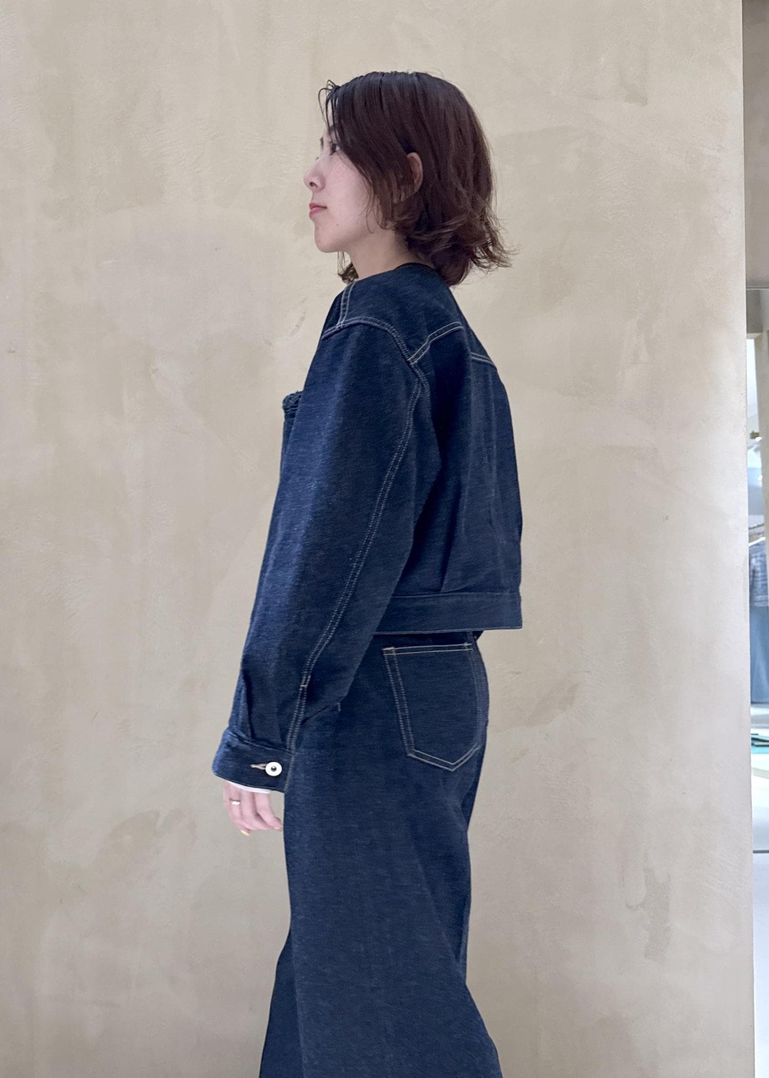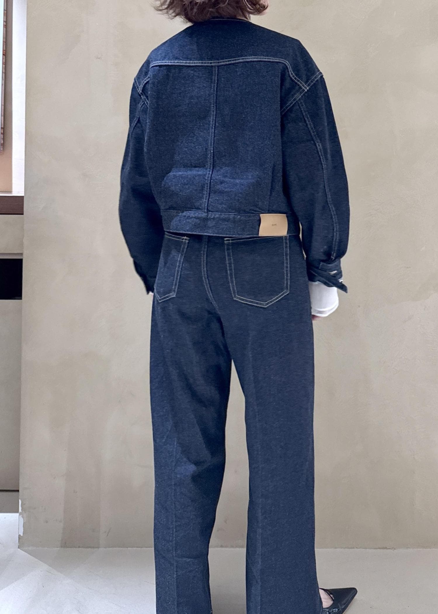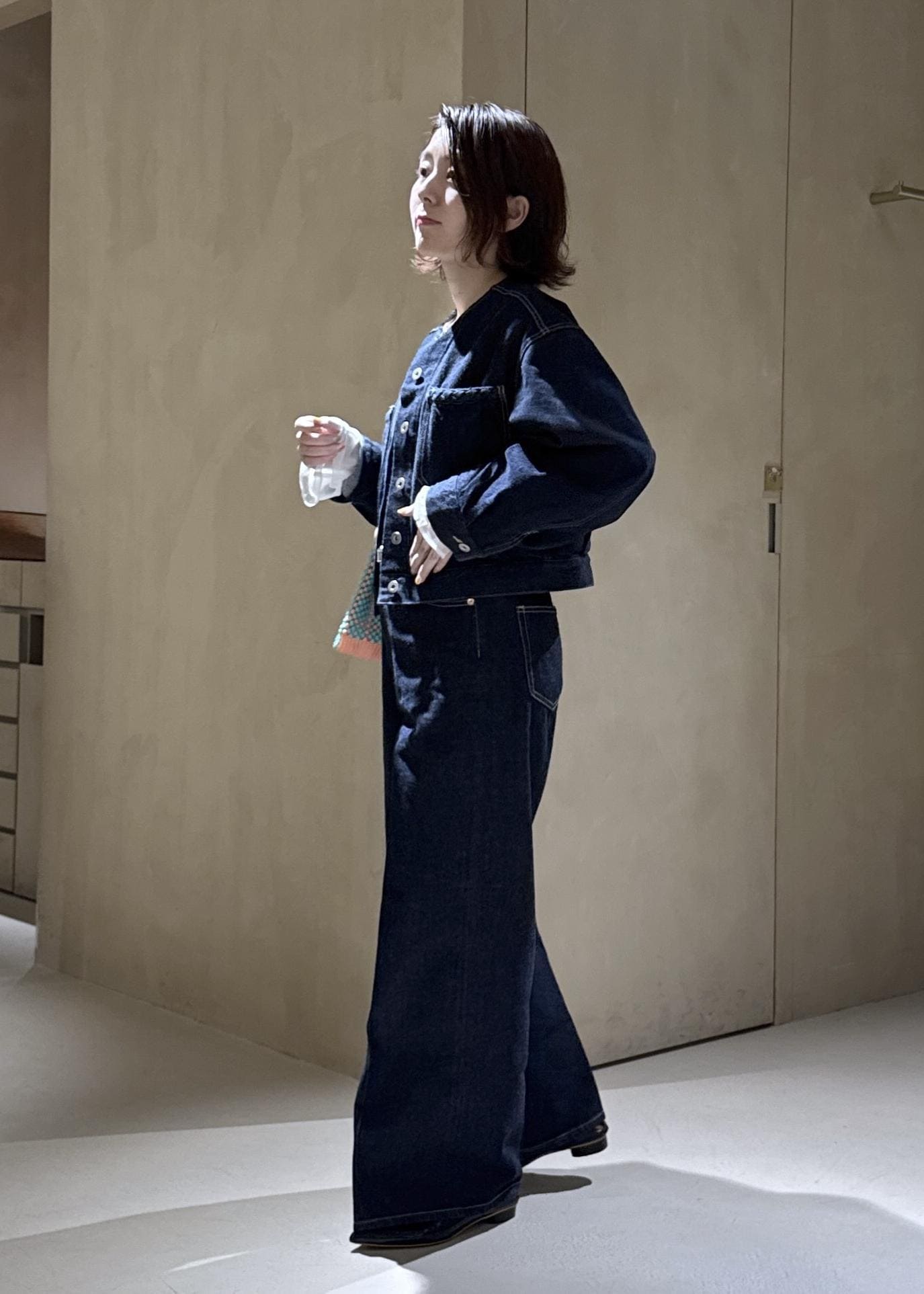 ノーカラーブルゾン、ウエストは細みのパンツで上品見えするデニムのセットアップです。