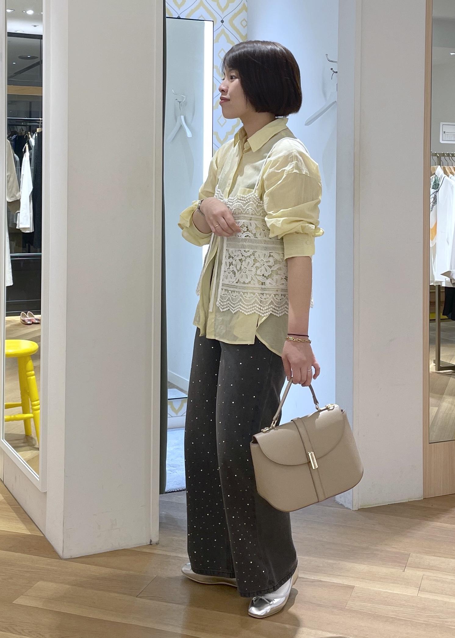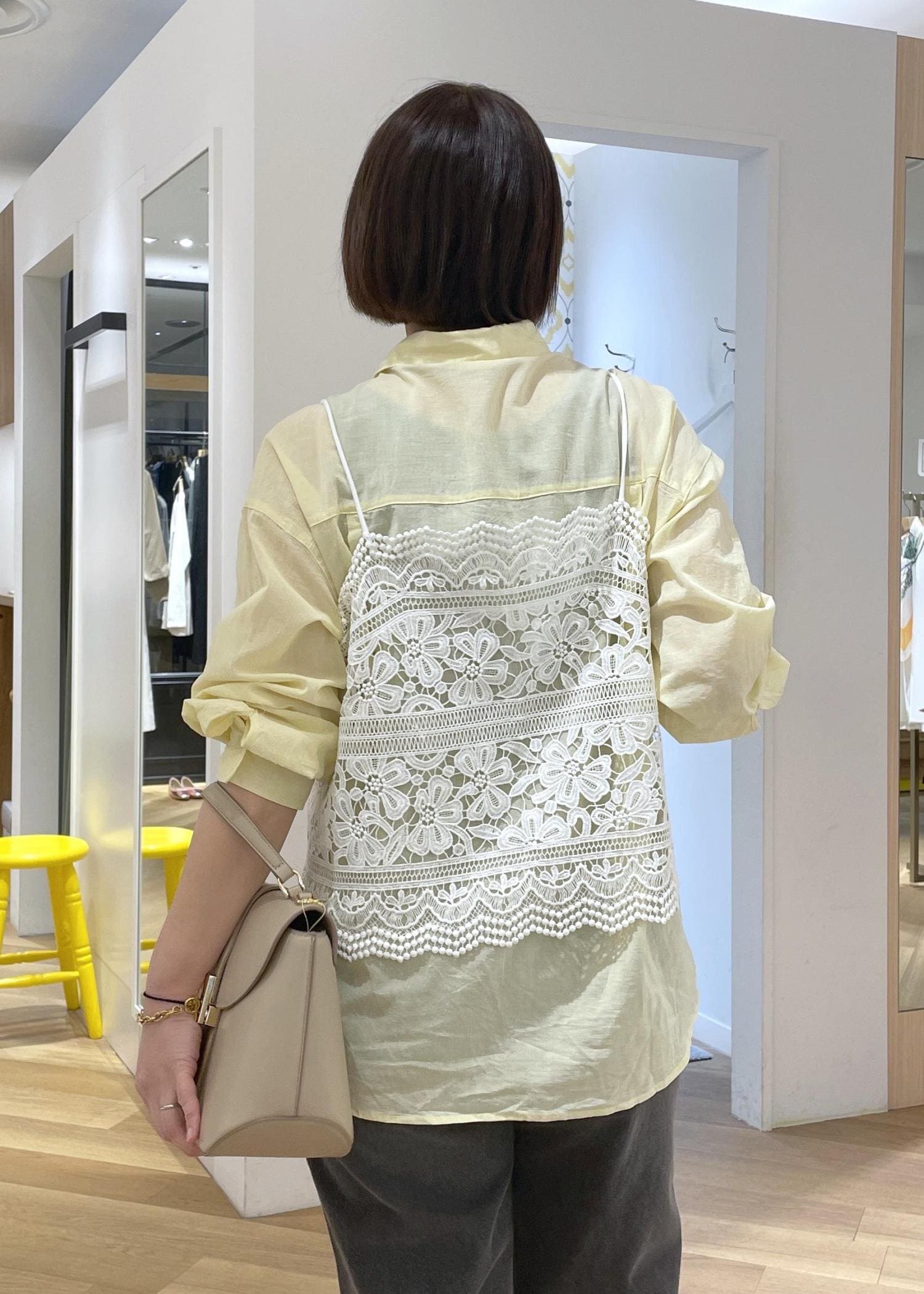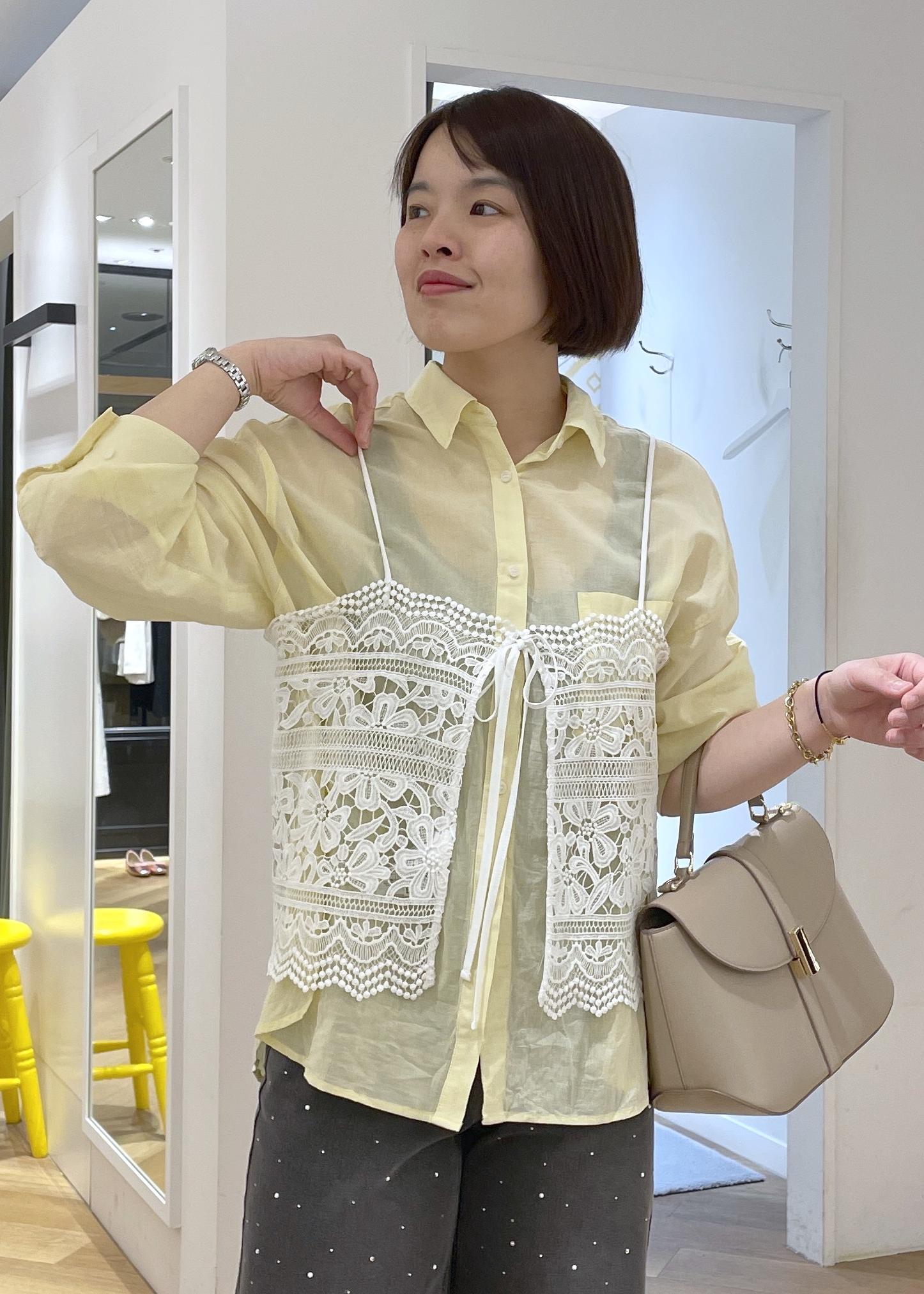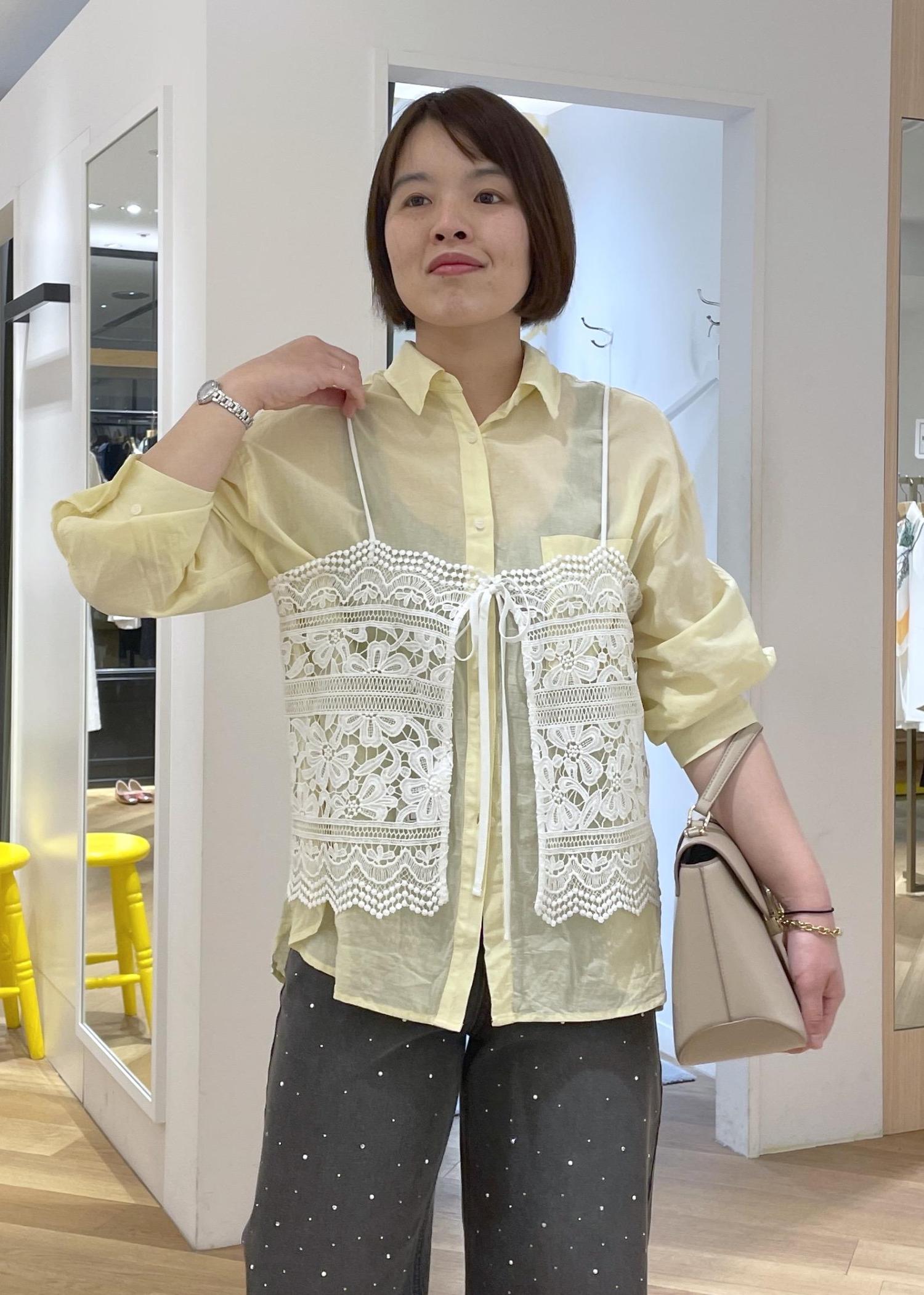 爽やかなイエローのシャツにレースのビスチェをレイヤードした、春にぴったりのトレンドコーデです!