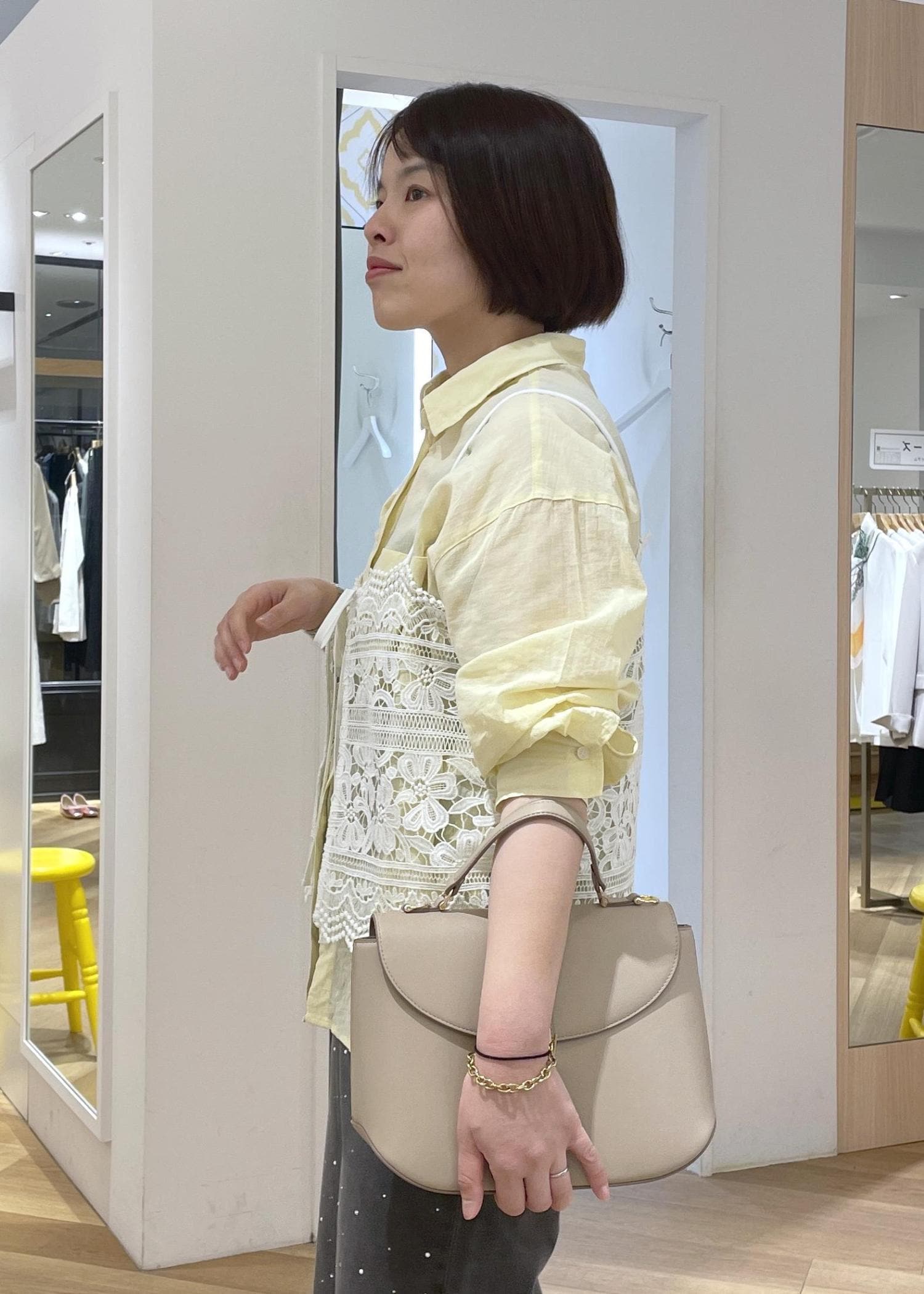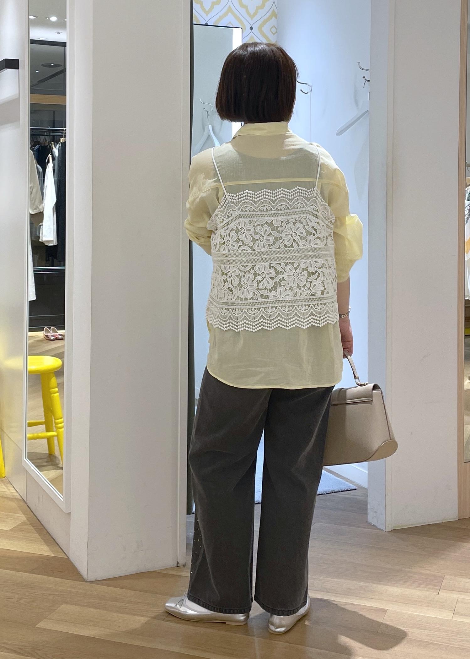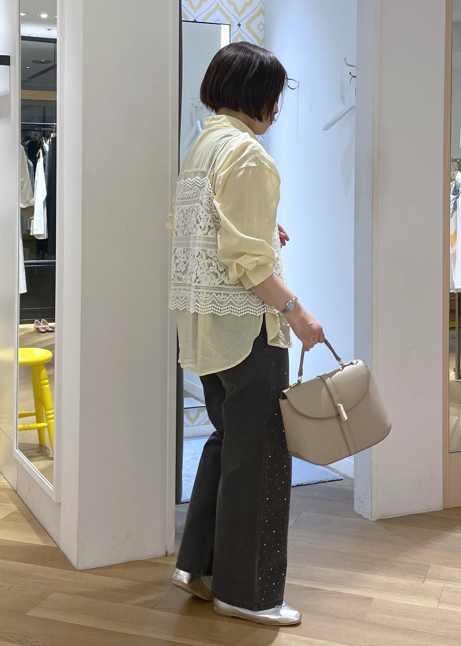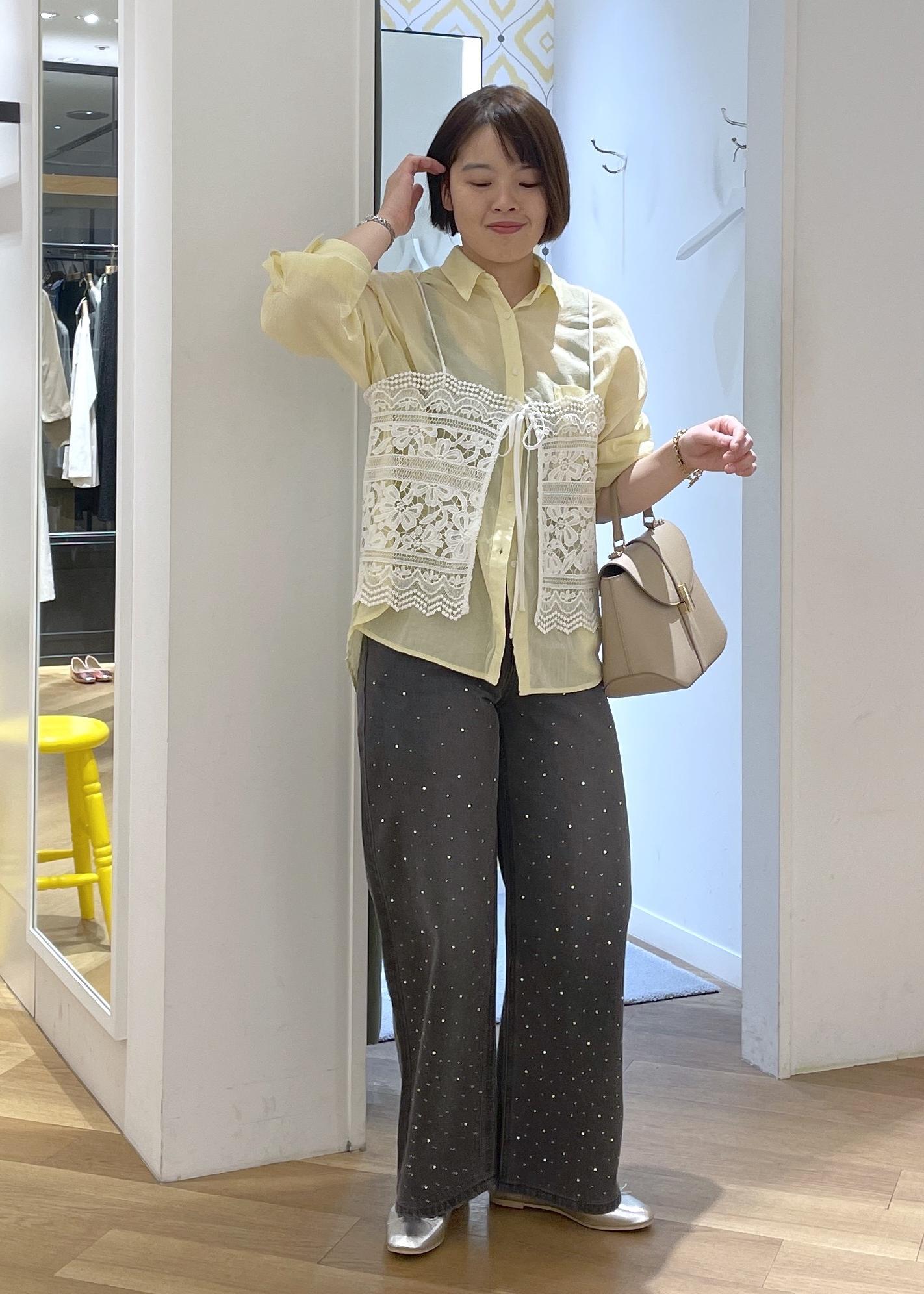 爽やかなイエローのシャツにレースのビスチェをレイヤードした、春にぴったりのトレンドコーデです!