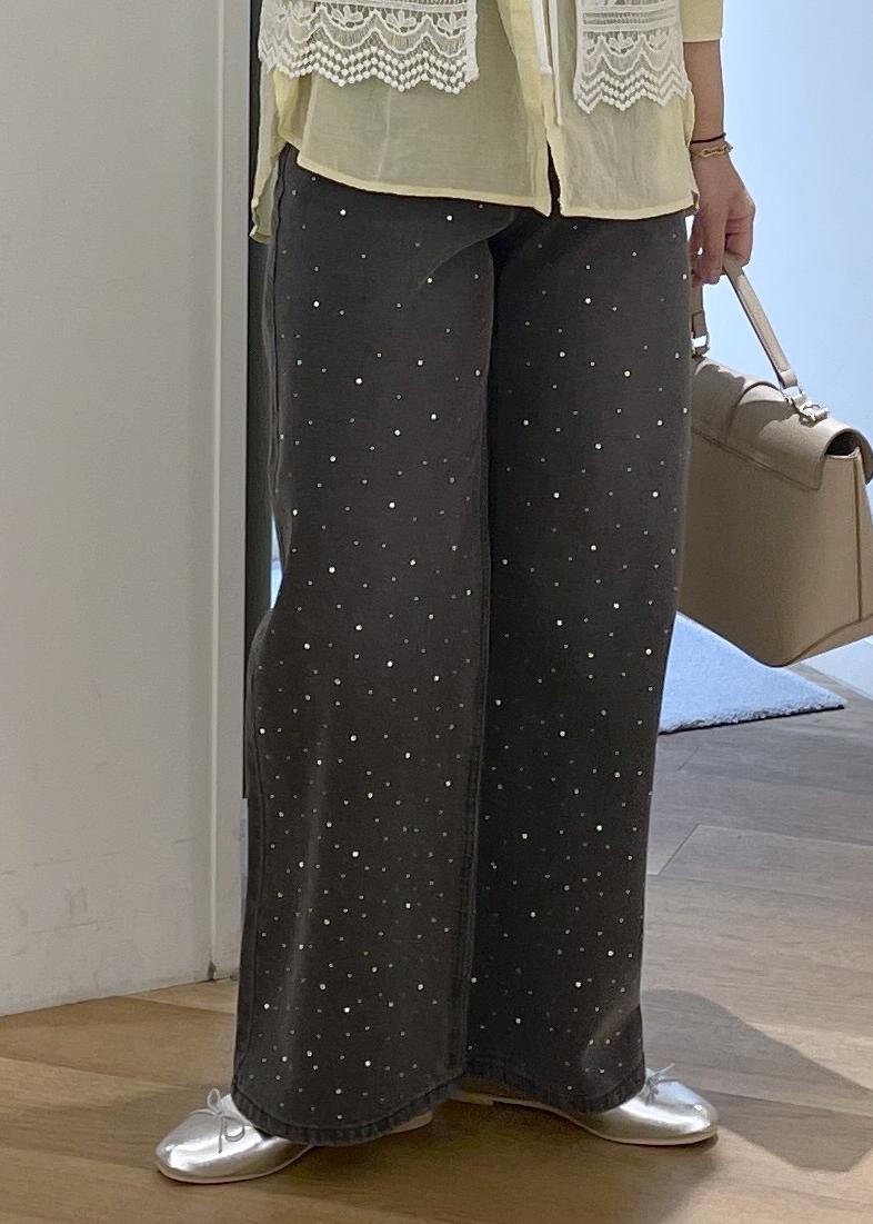 ボトムはブラックのビジューデニムを合わせて、メリハリを付けつつ華やかさもあるコーデに◎