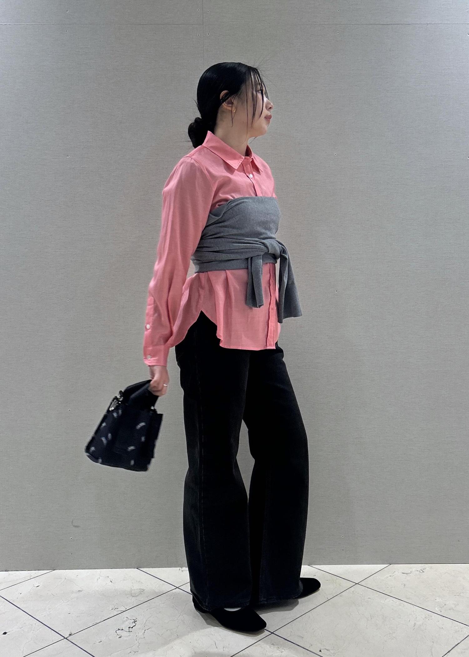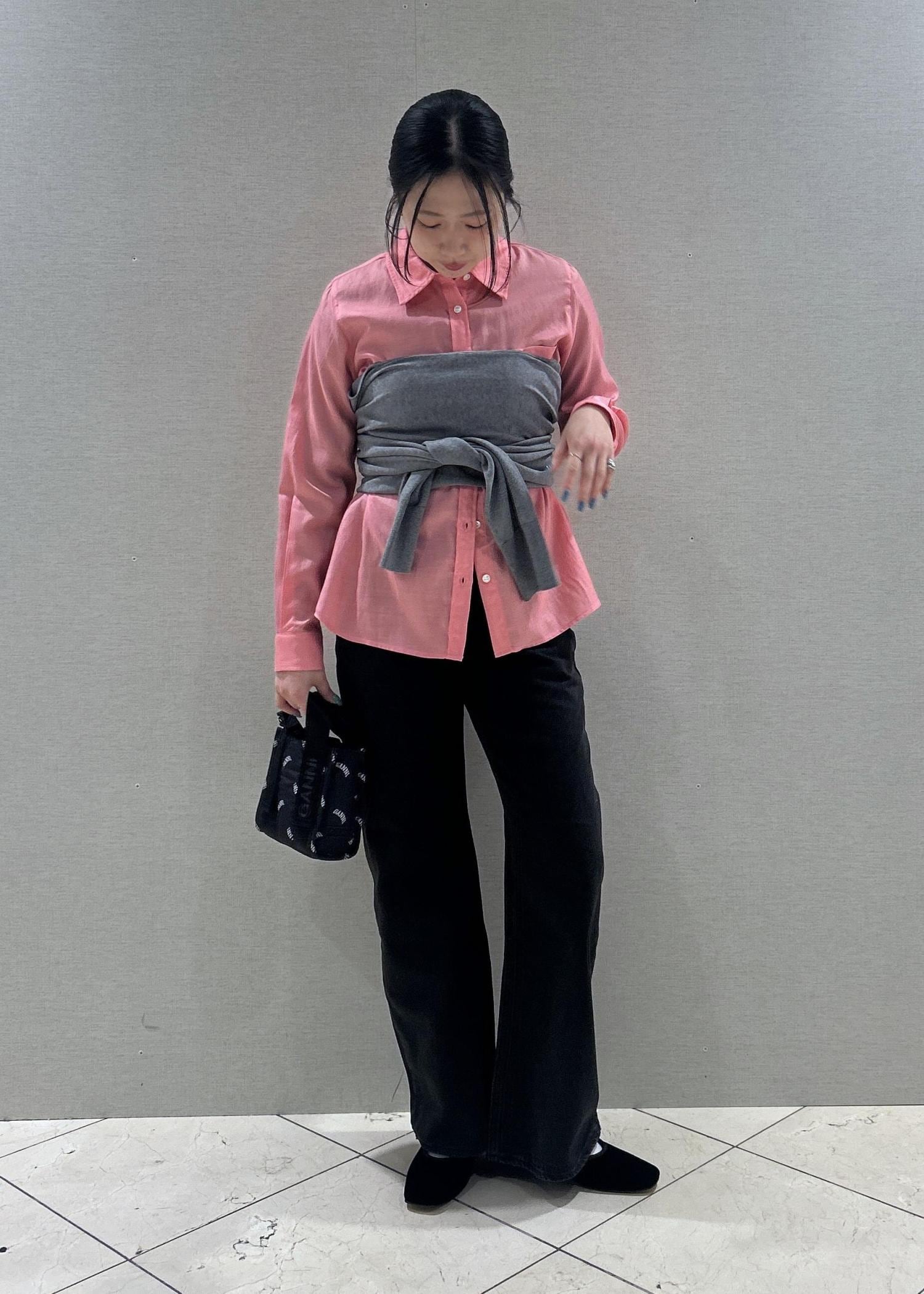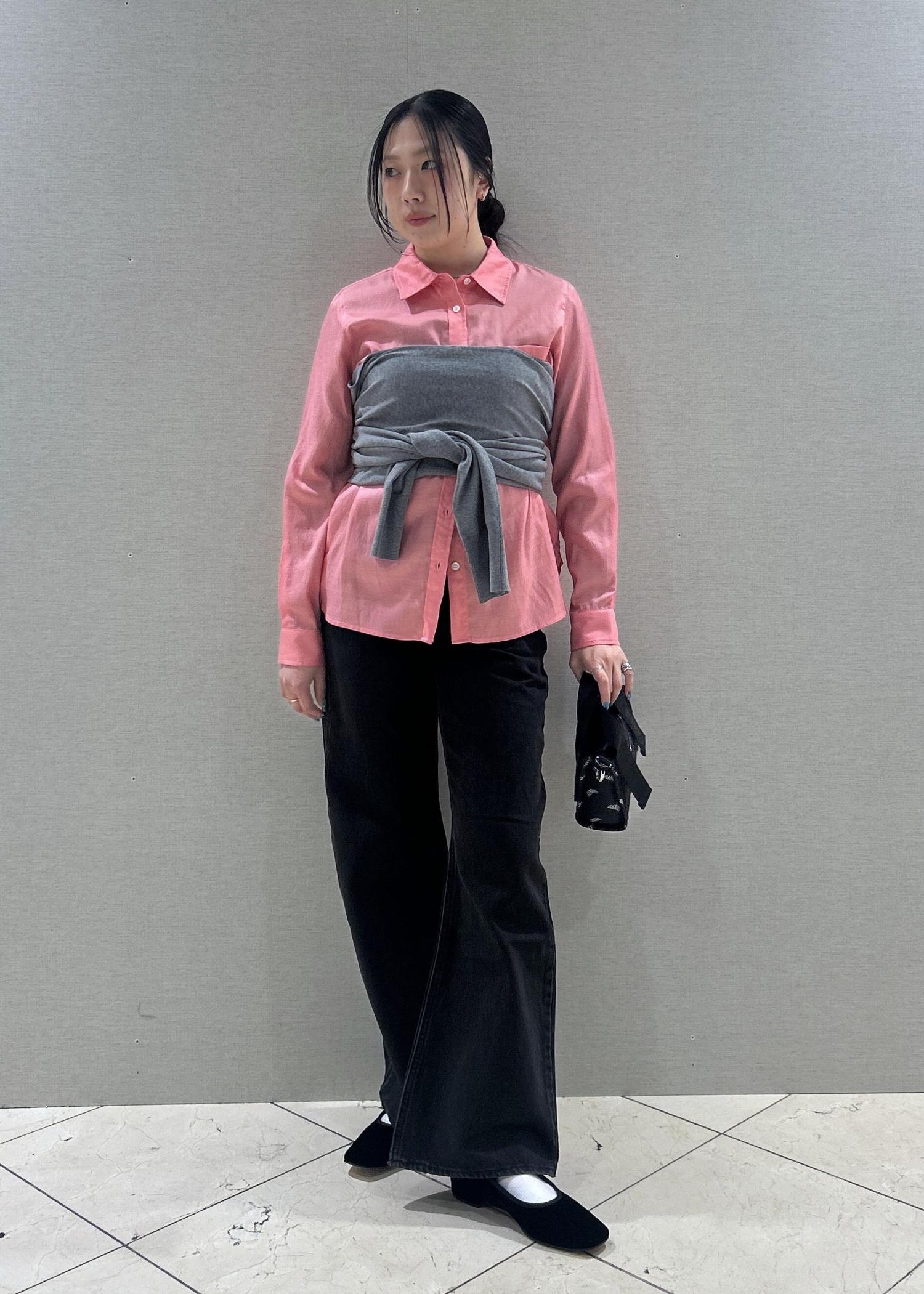 本日はピンクのシャツをメインにスタイリングを組んでみました!グレーのカーディガンをレイヤードして、胸元にビスチェのように巻いてます♡