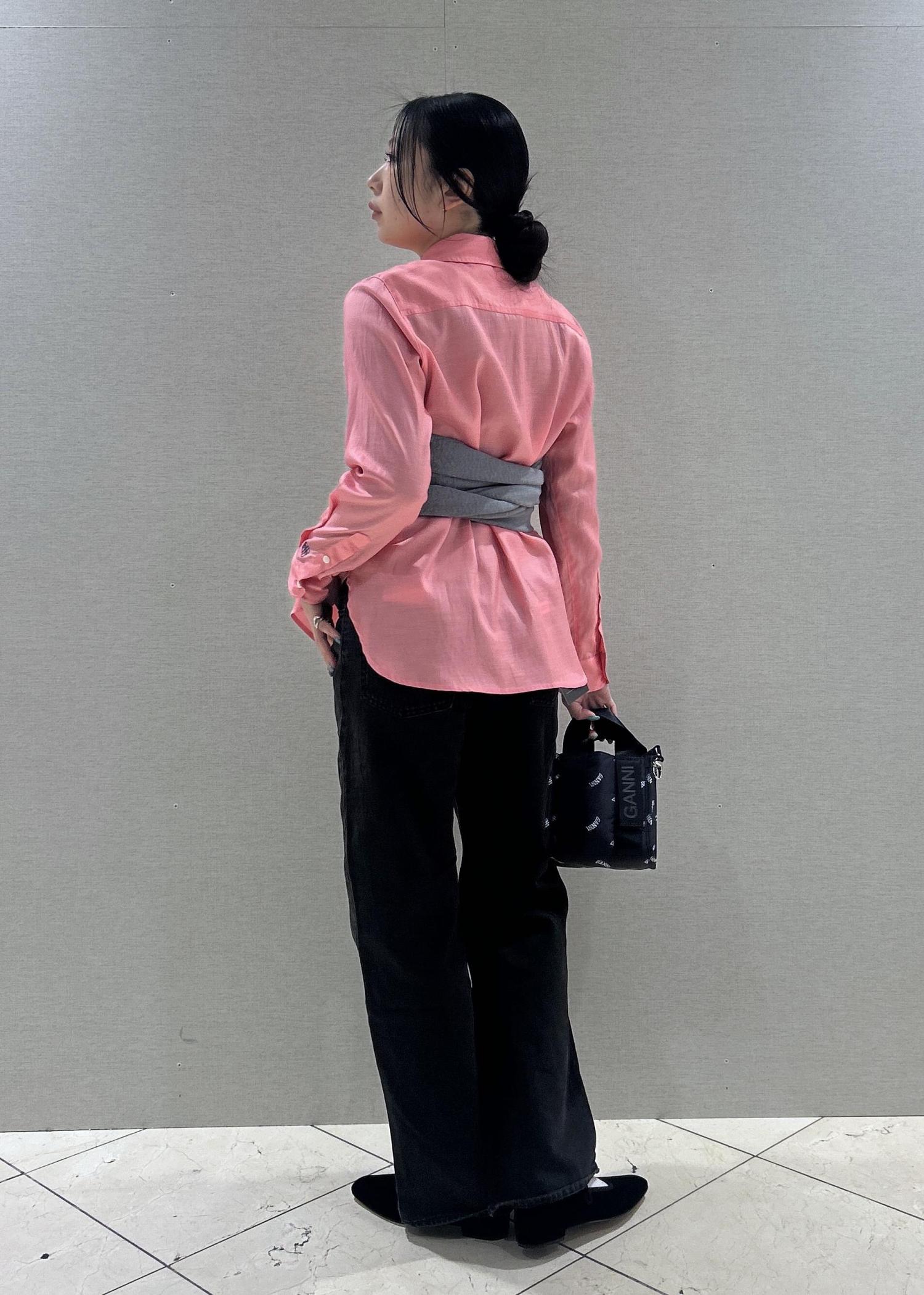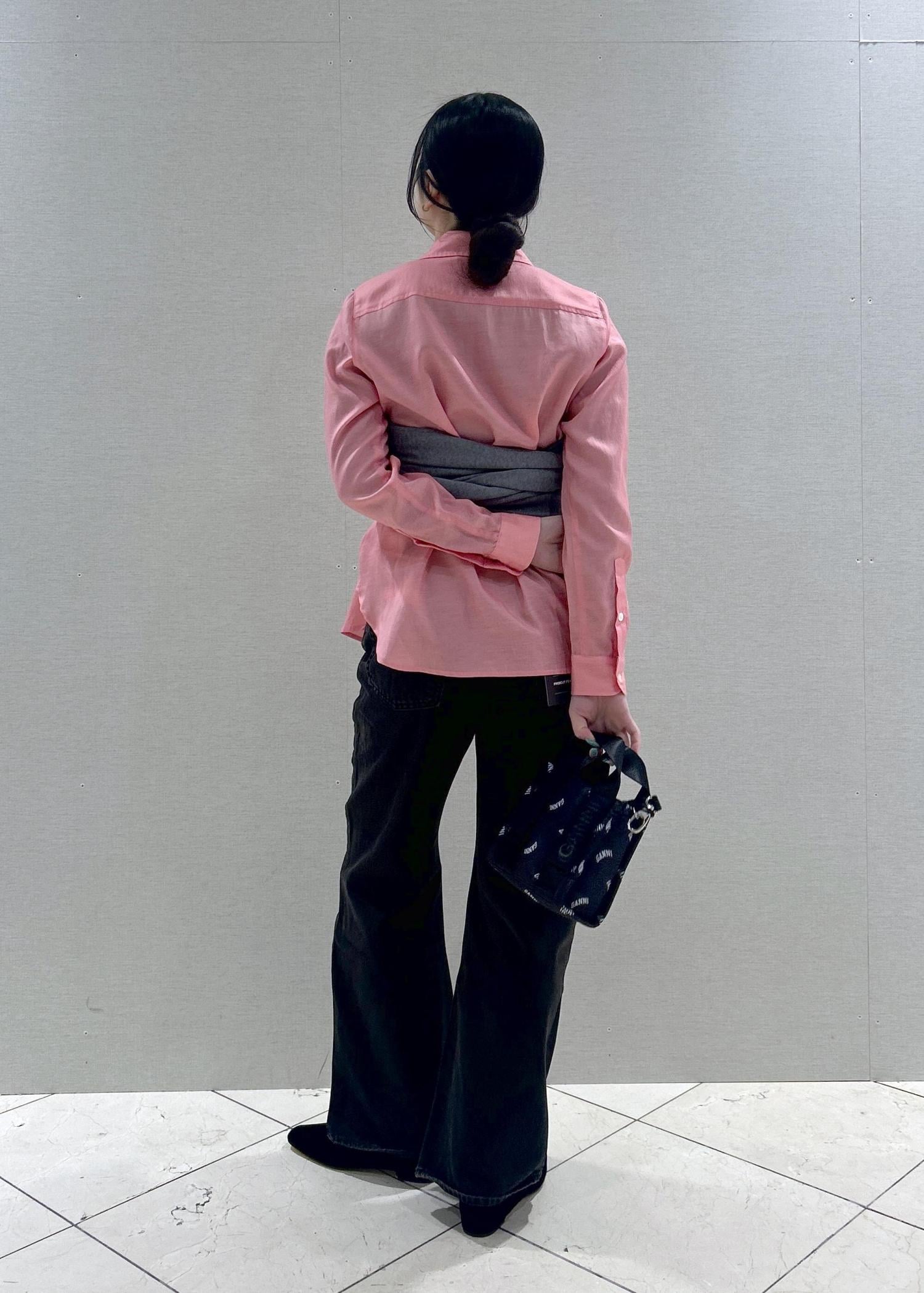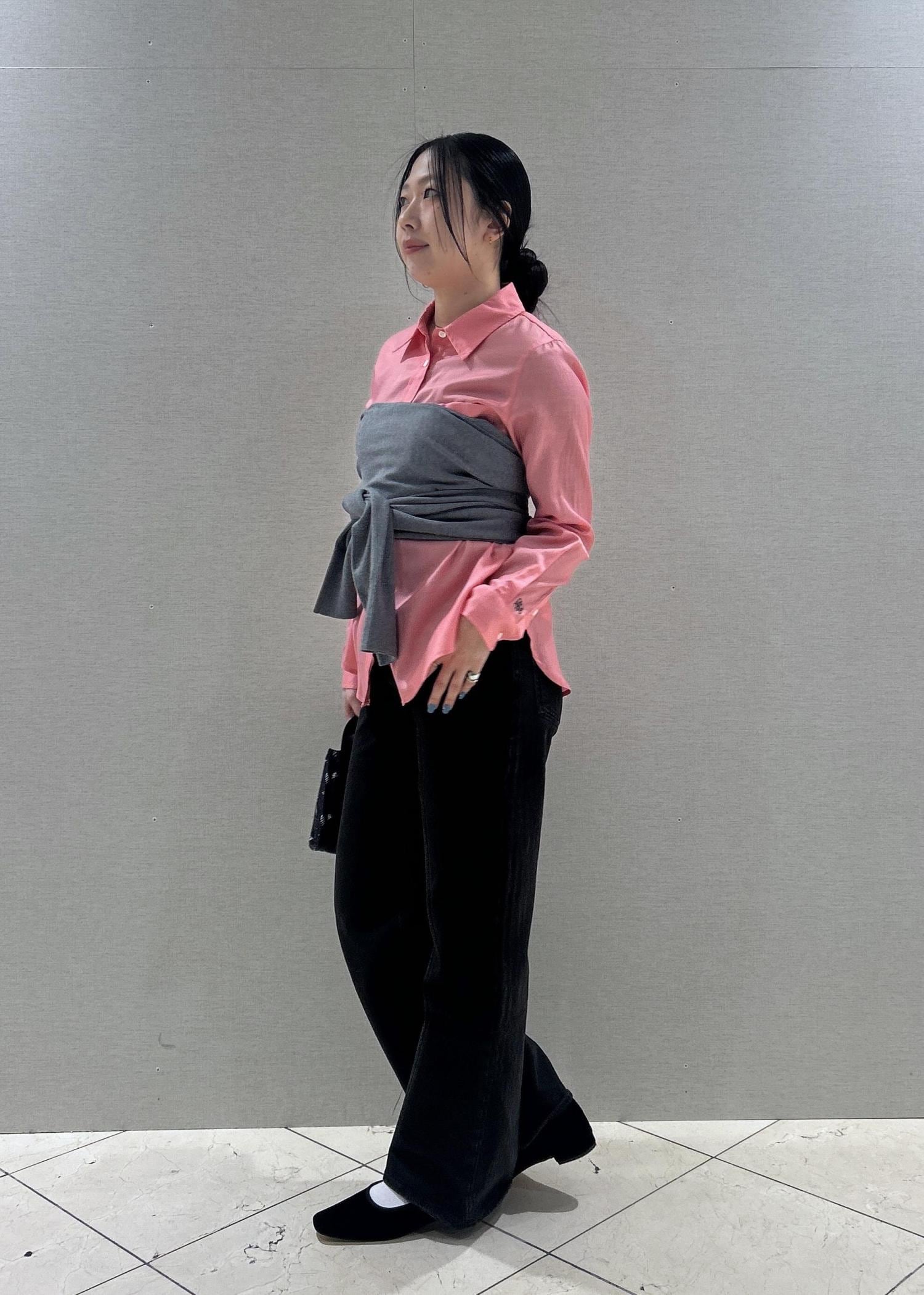 本日はピンクのシャツをメインにスタイリングを組んでみました!グレーのカーディガンをレイヤードして、胸元にビスチェのように巻いてます♡