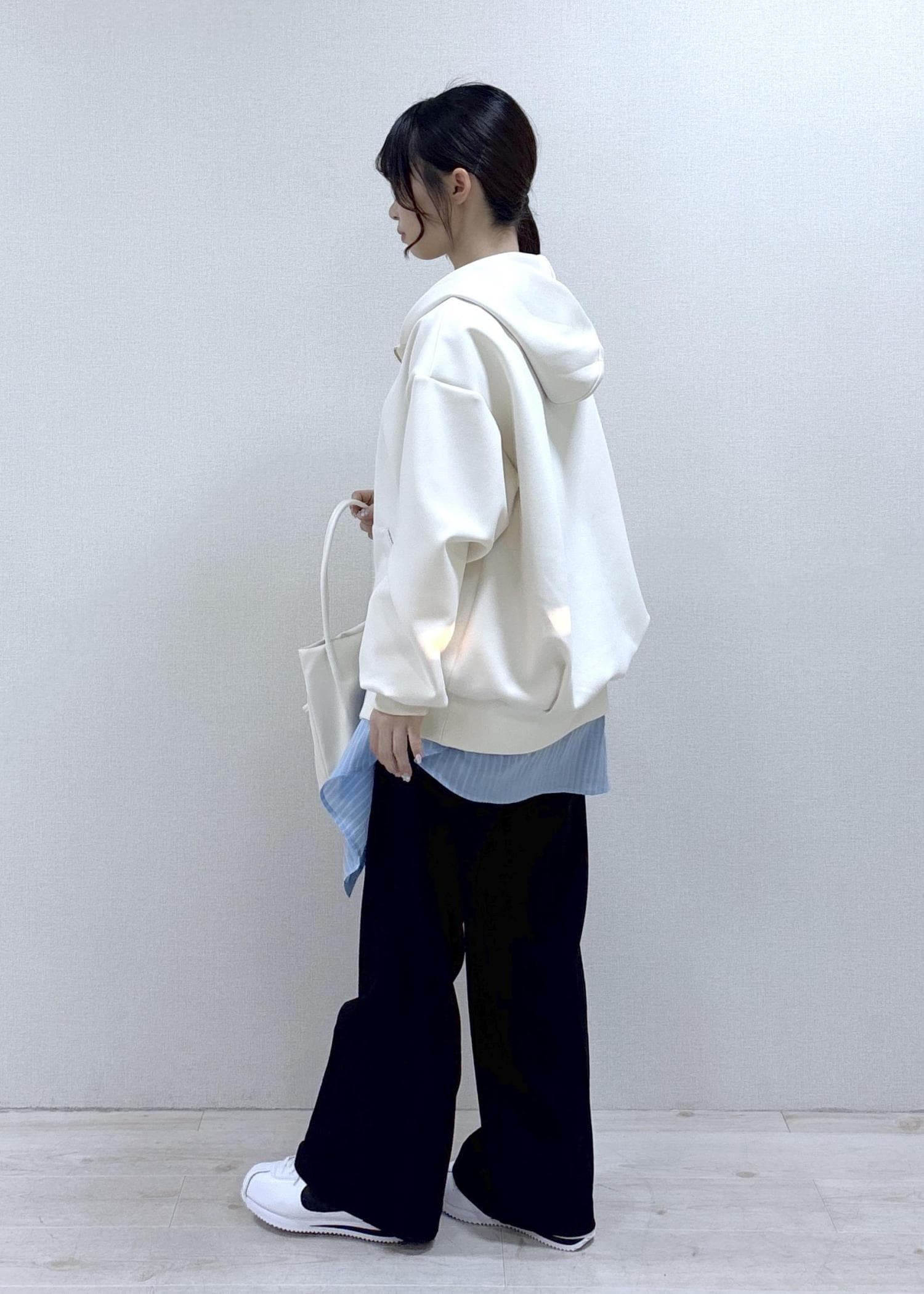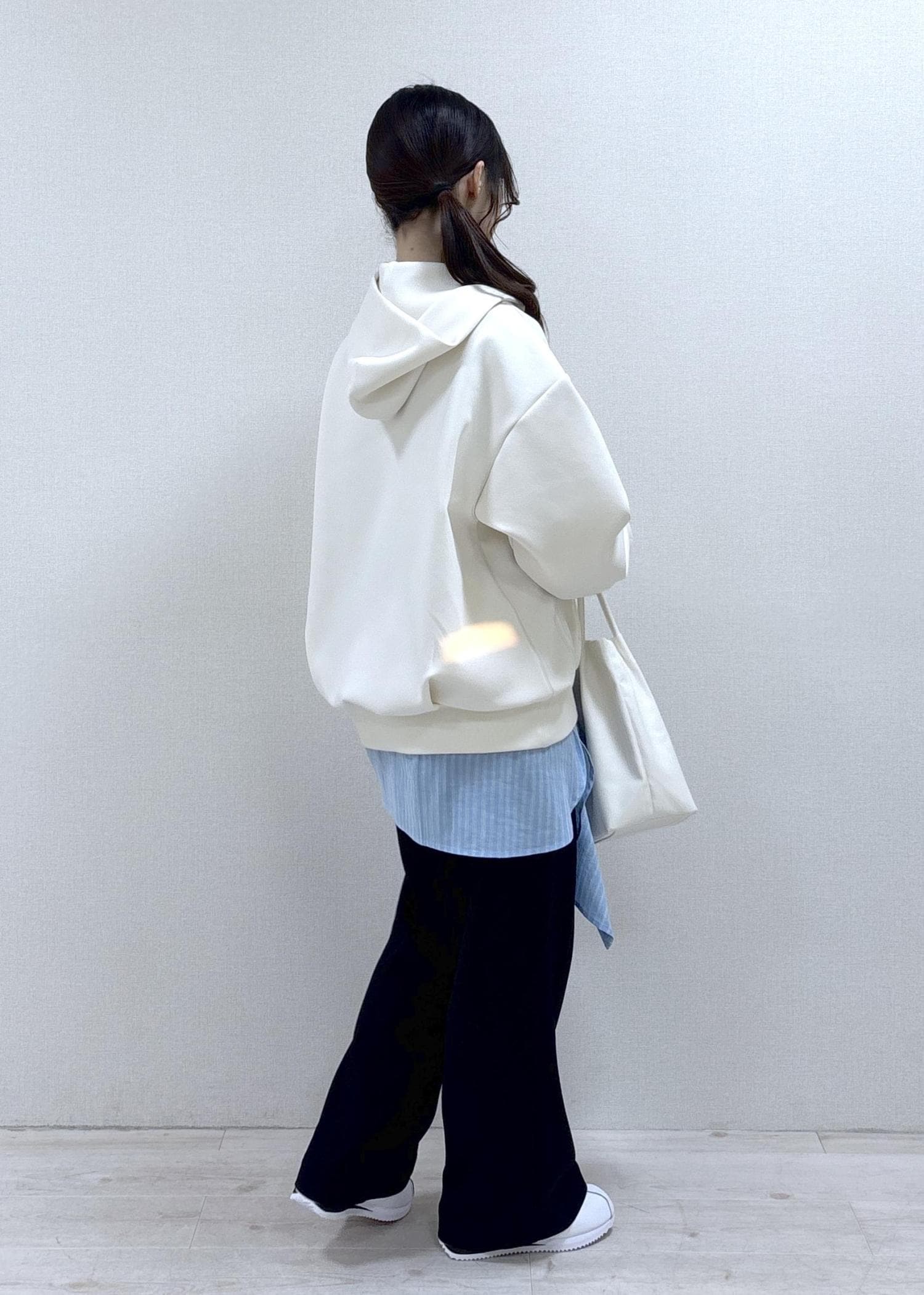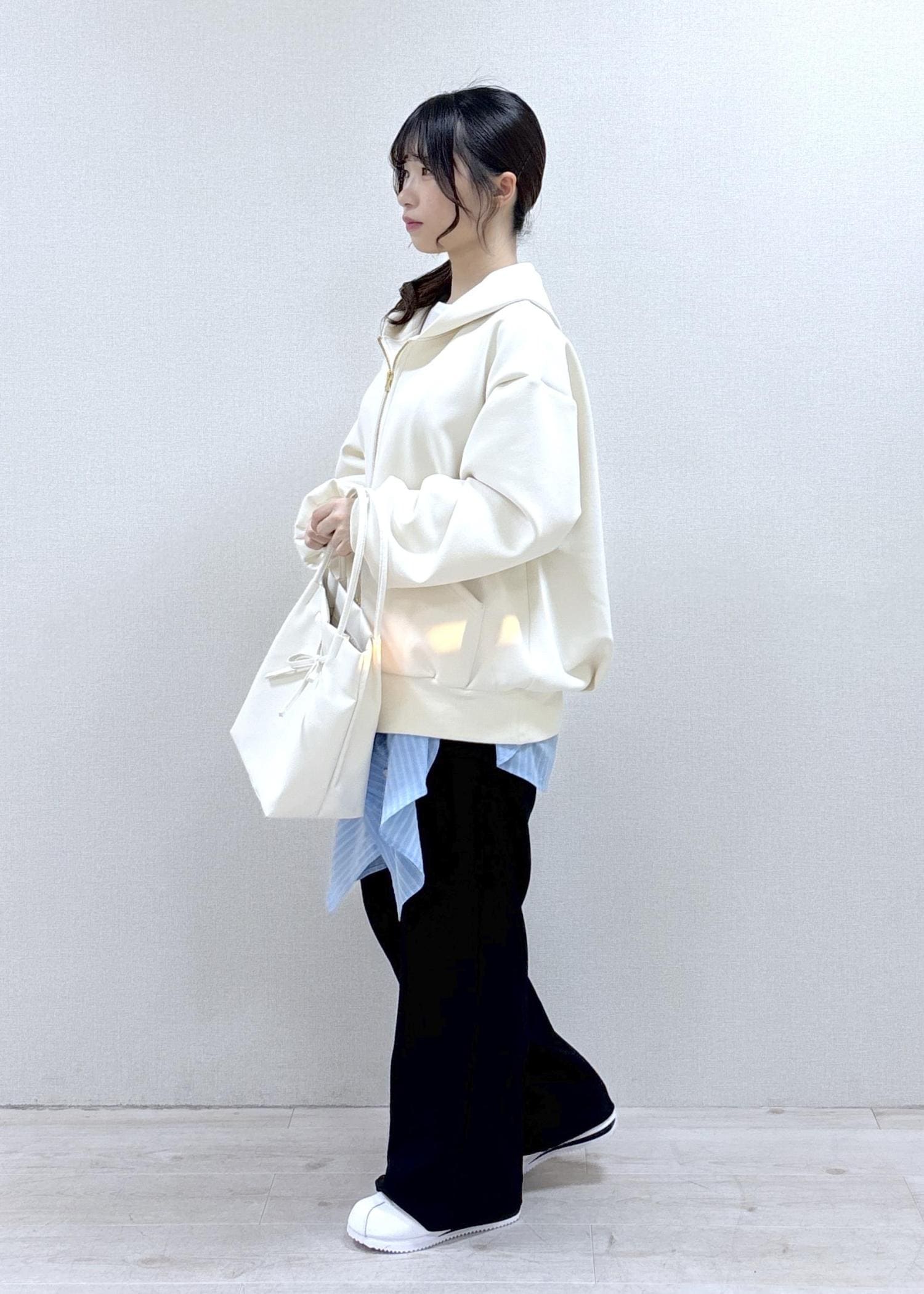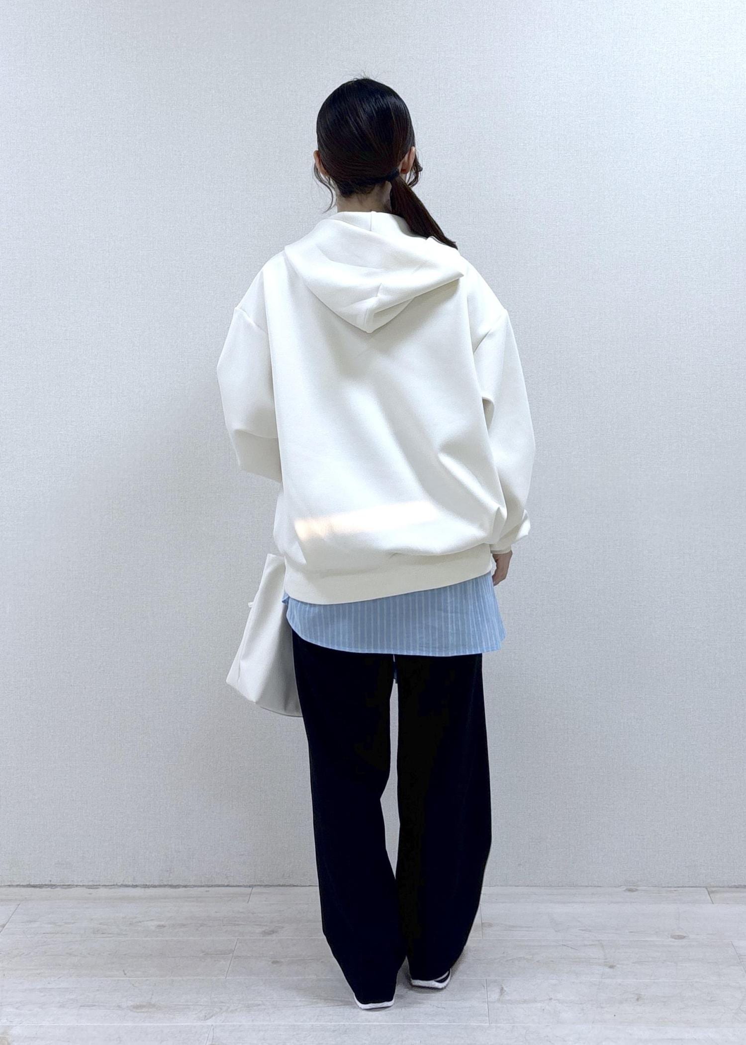 ツヤ感のある素材なので、カジュアルなイメージのあるフーディーですが綺麗めなスタイルにも馴染みやすいです。