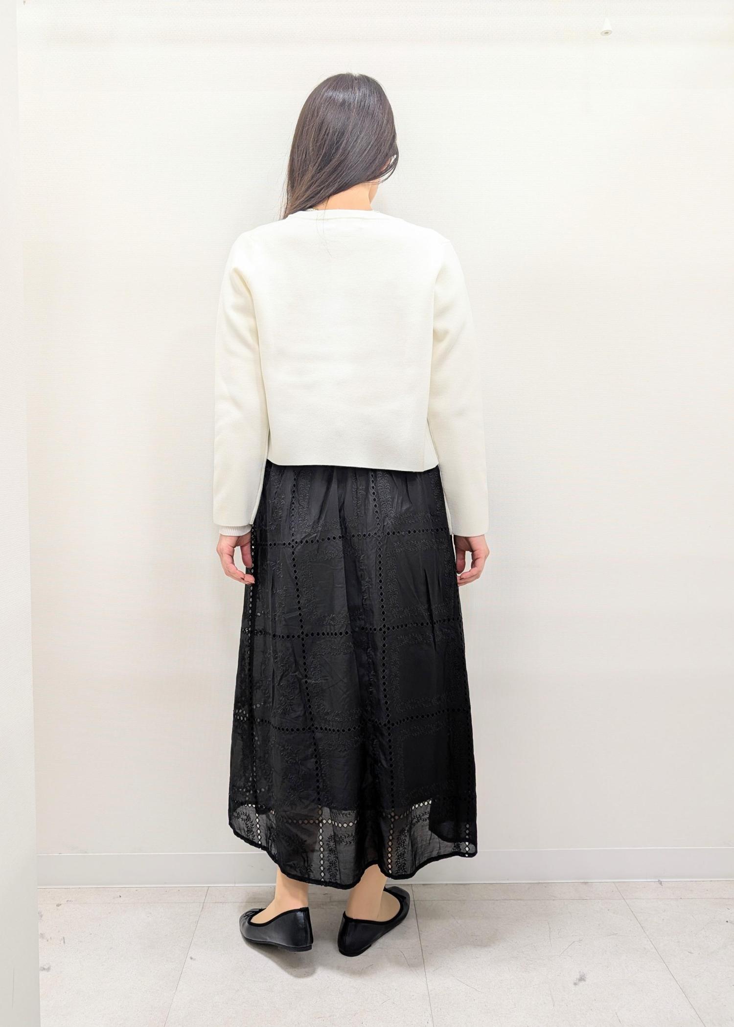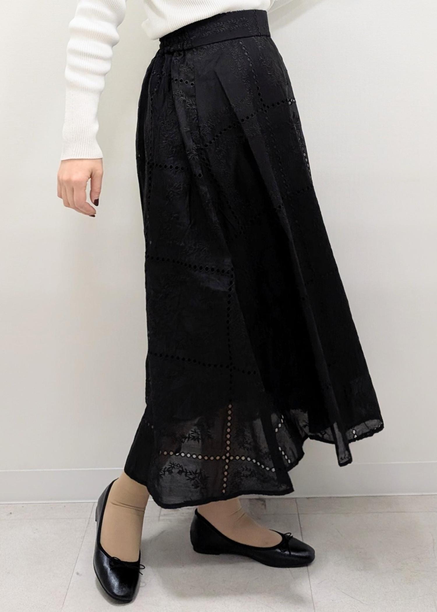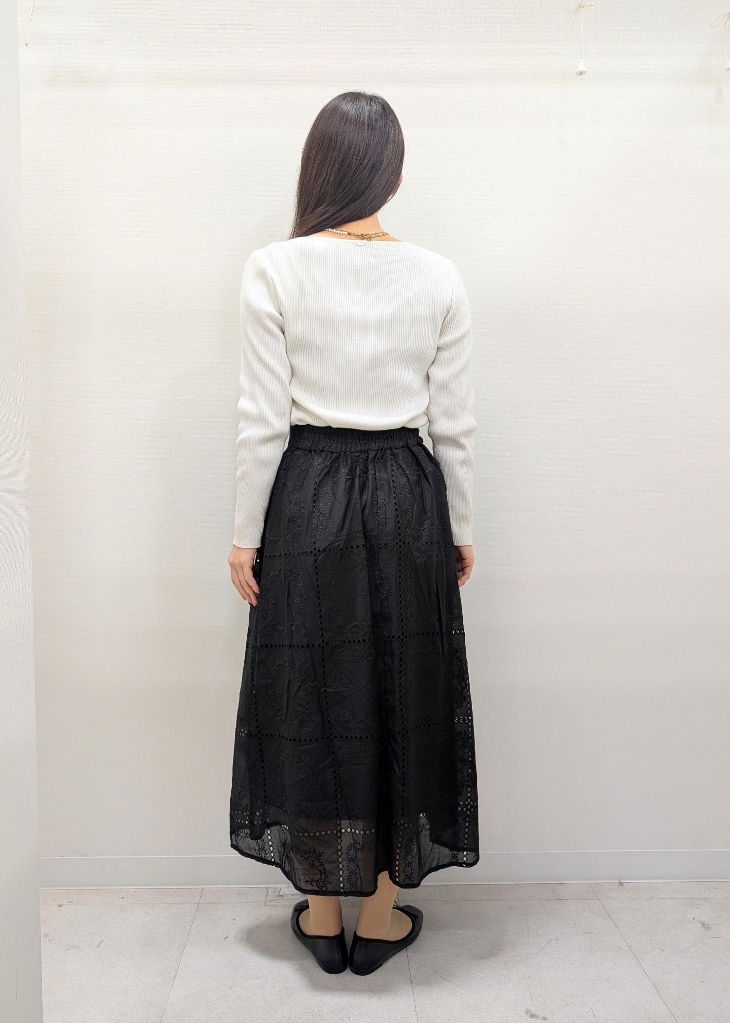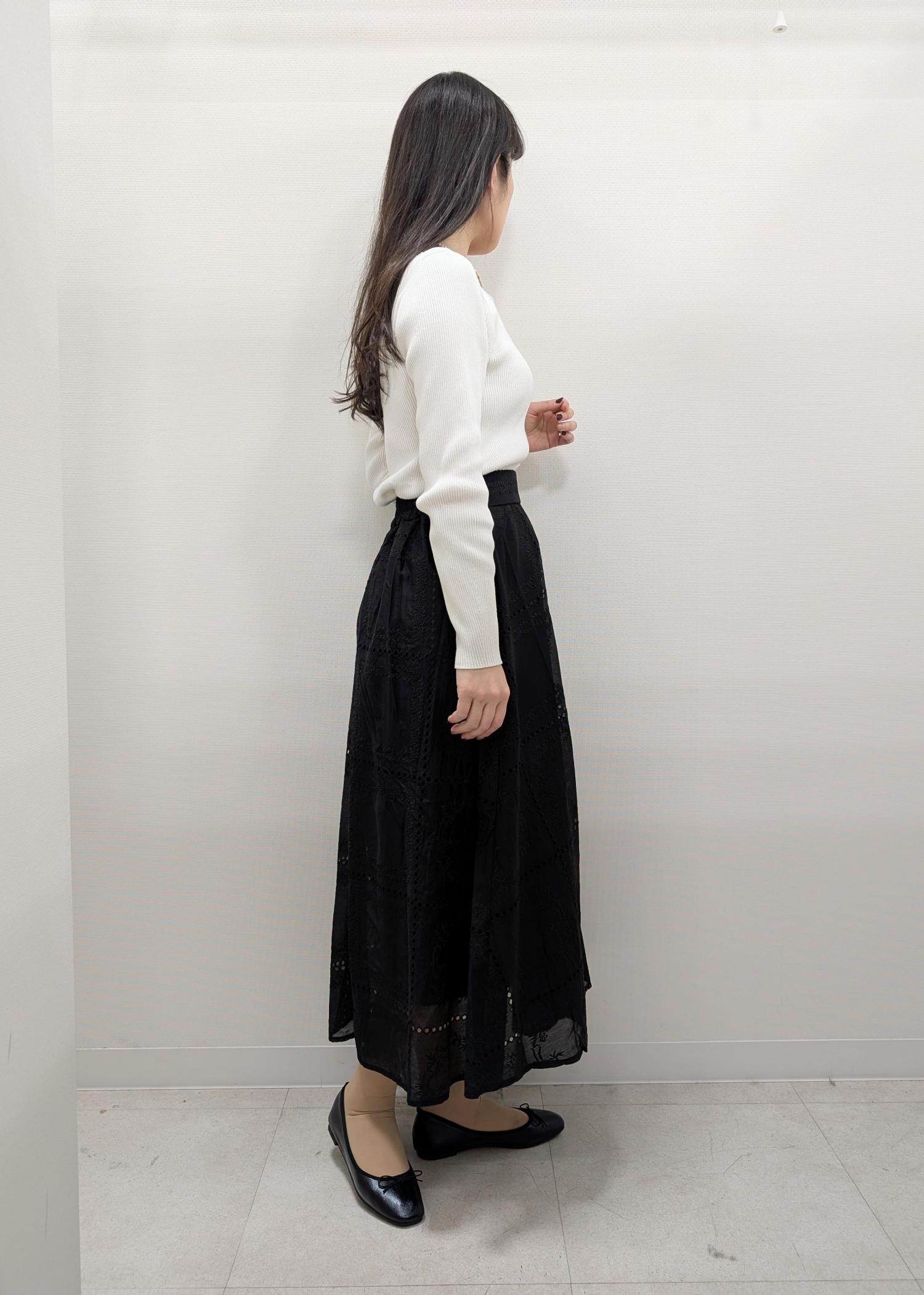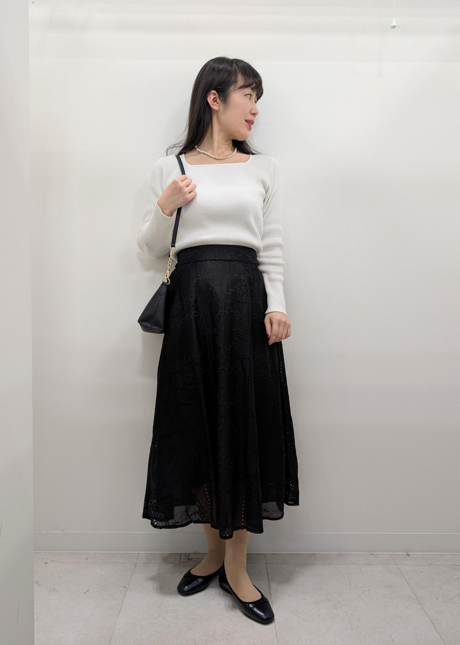 トレンドの刺繍レースのスカートを使ったコーディネート。