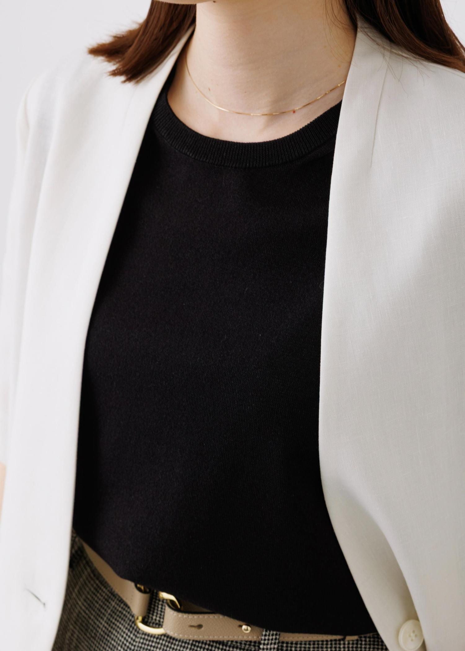 ノーカラーデザインで上品見えしてお顔まわりもすっきりした印象に◎ -