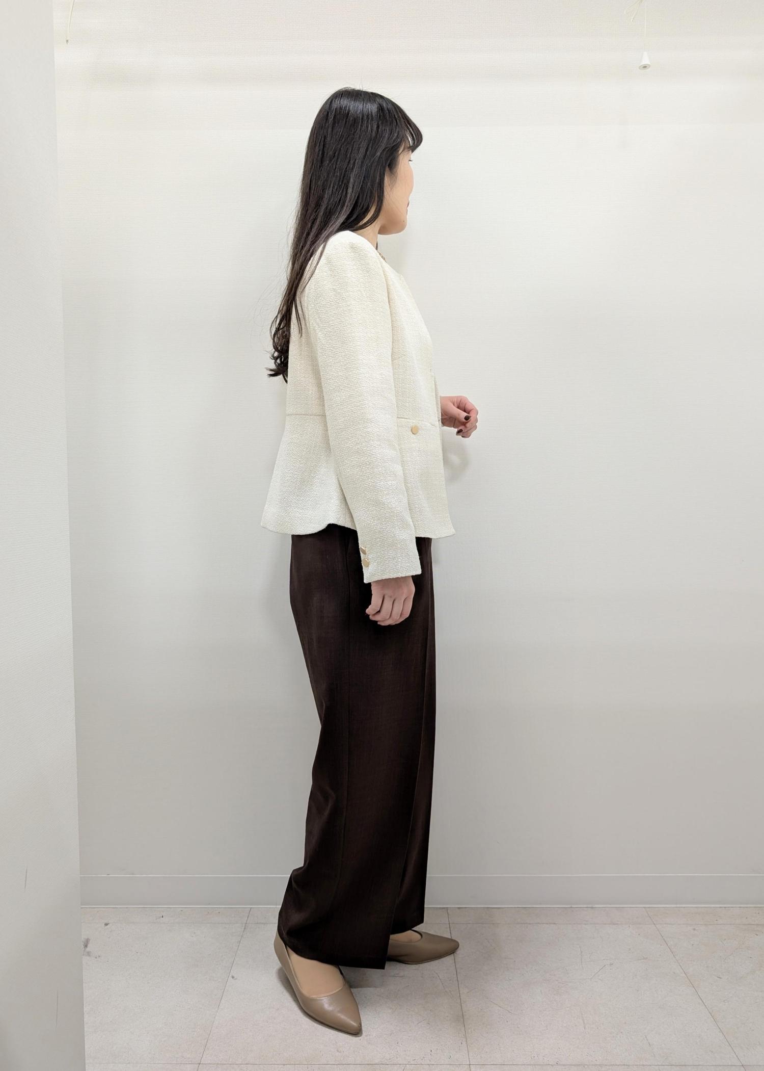 ツイードジャケットにワイドパンツを合わせたお仕事、お出かけ、デートなどにおすすめのコーディネートです(^^)
