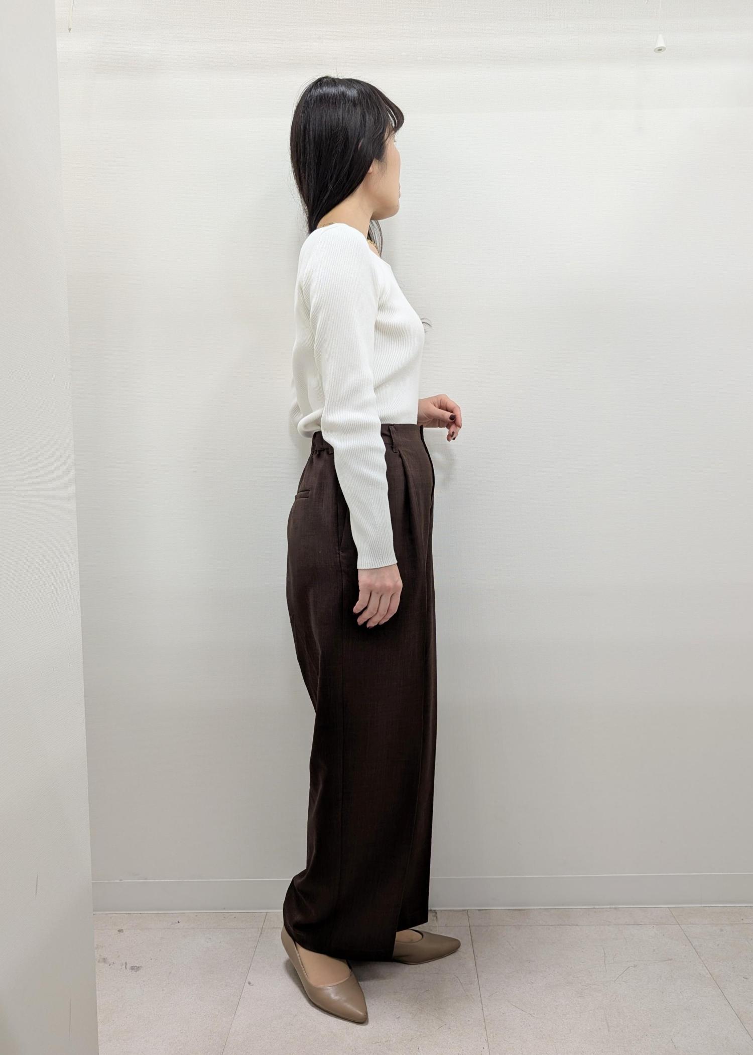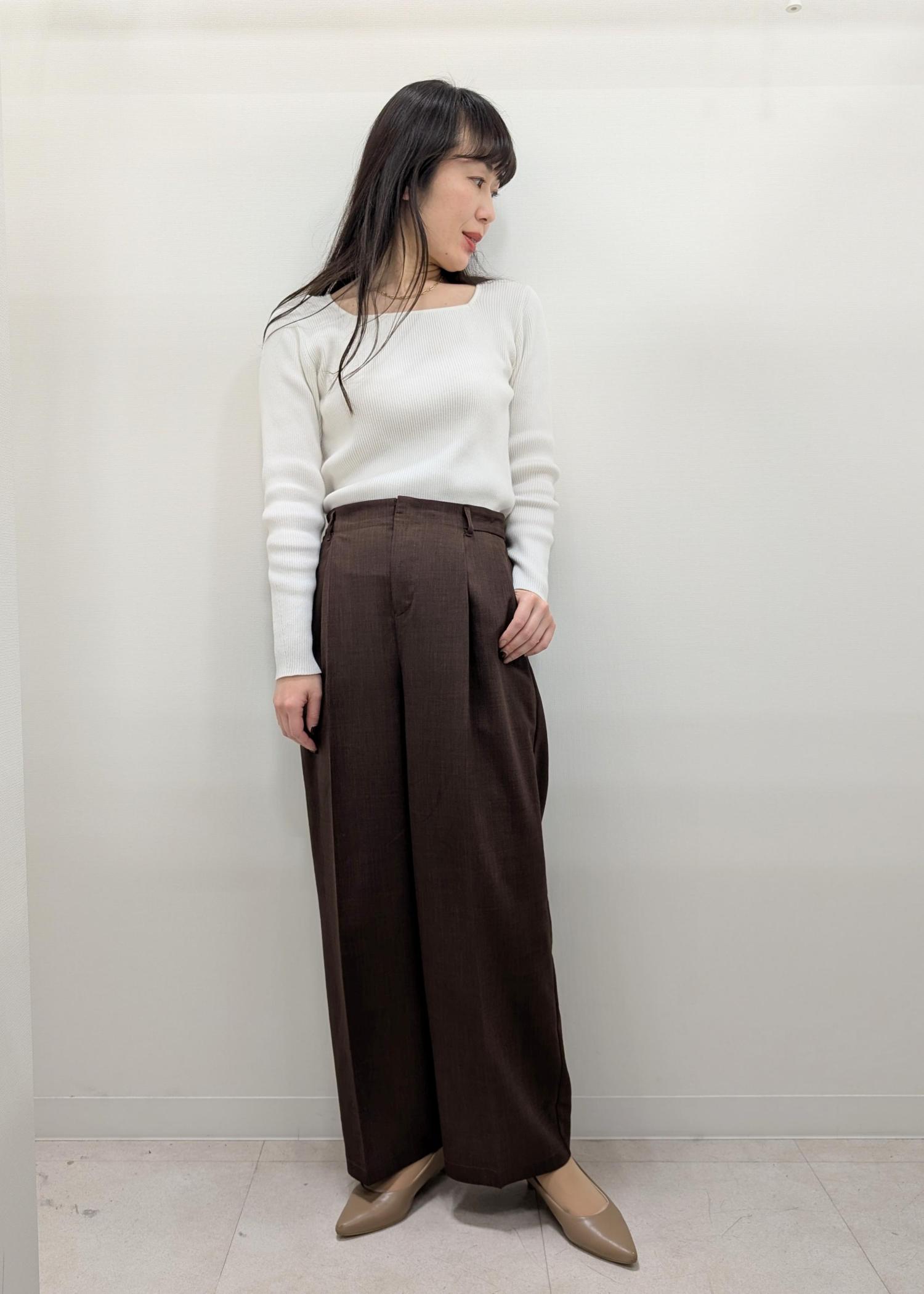 ジャケットがゆったりめ、ボトムもワイドなのでインナーはスッキリ見える鎖骨が見えるニットを選びました!