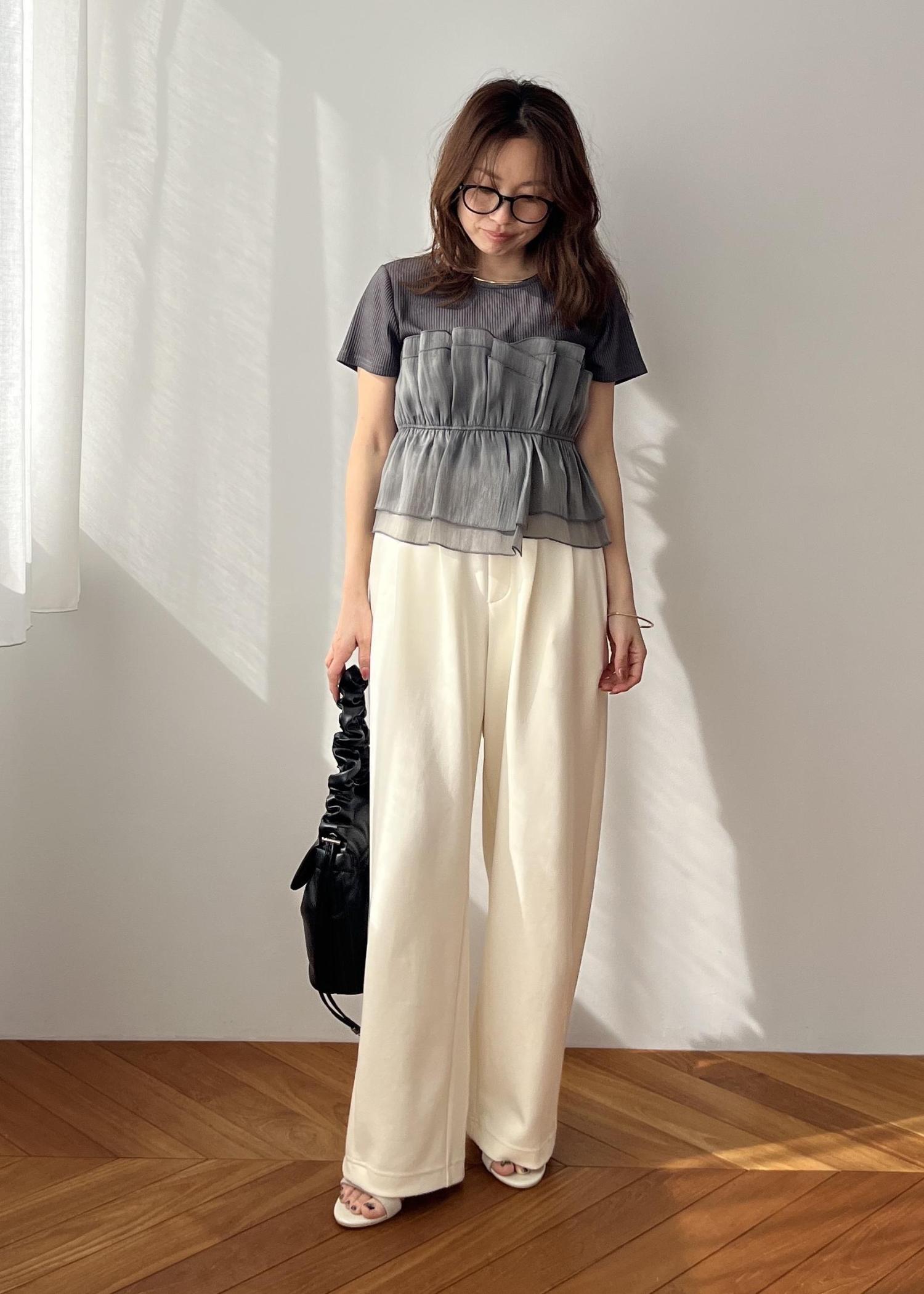 予約VISチェック&無地ビスチェドッキング半袖プルオーバー/イージーケアスミクロ / F¥5,489レビュー152cmでFサイズ着用し、着丈は腰に少しかかるくらいの丈。IN・OUTどちらのスタイリングにも◎サラッとしたカットソー素材なので肌に張り付くことなく涼しくお召しいただけます。毎回大人気のビスチェドッキングニット。腰回りカバーしてくれながら着映えしてくれる優秀トップスです。
