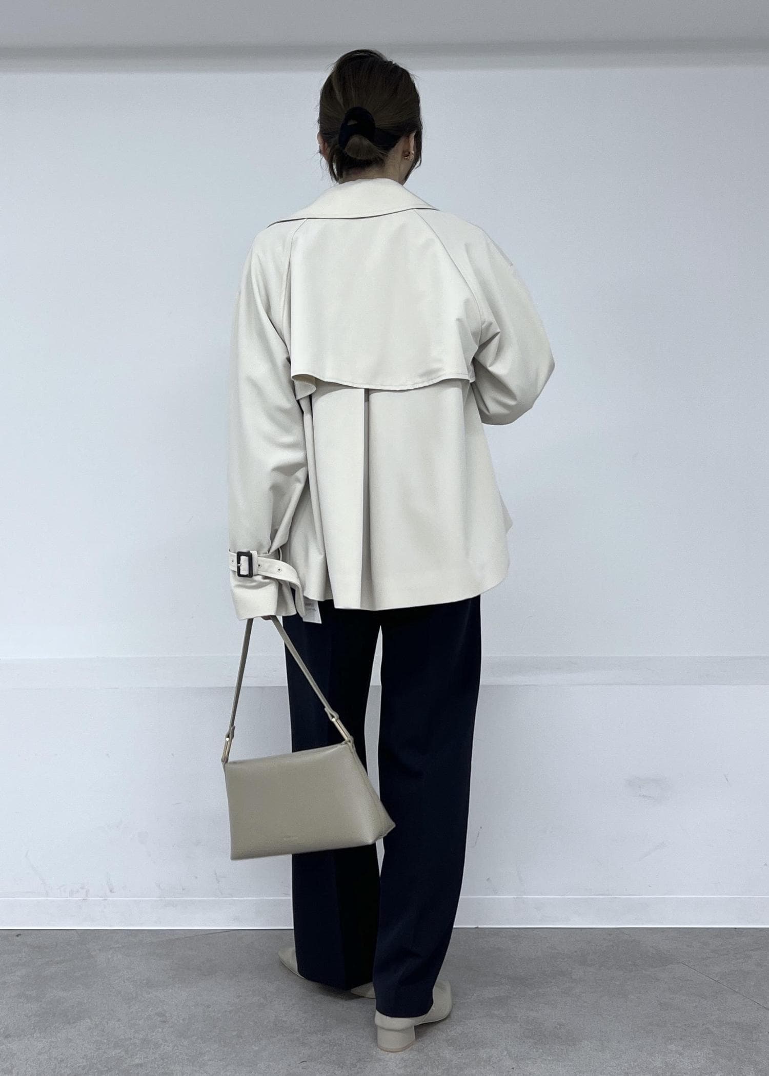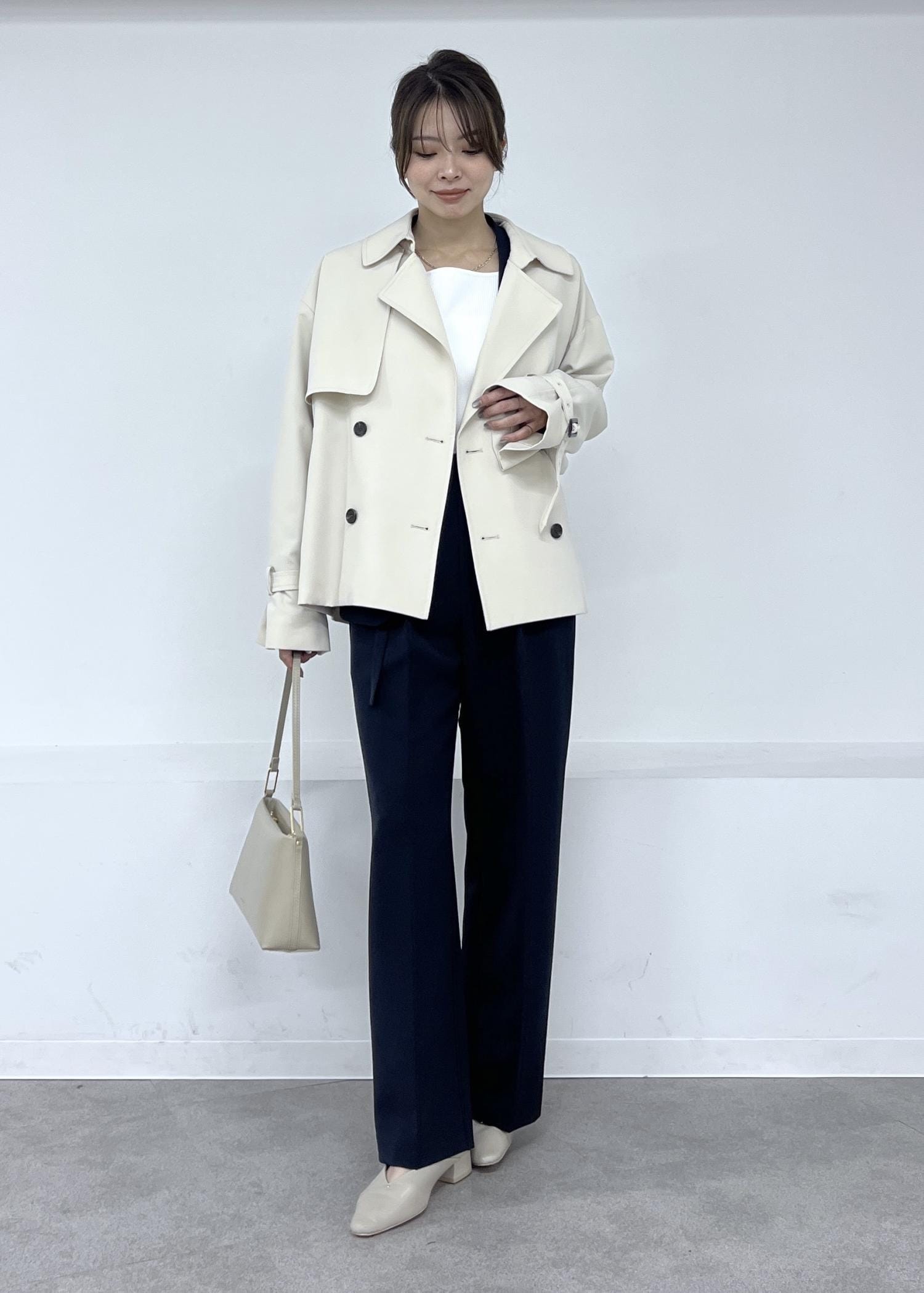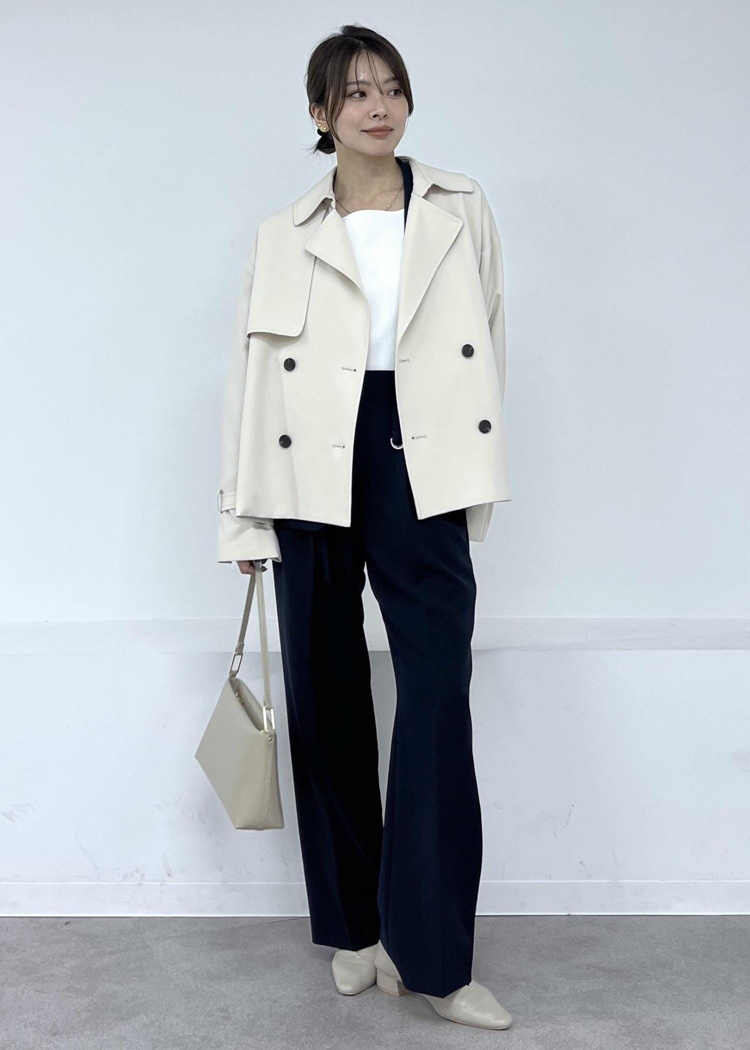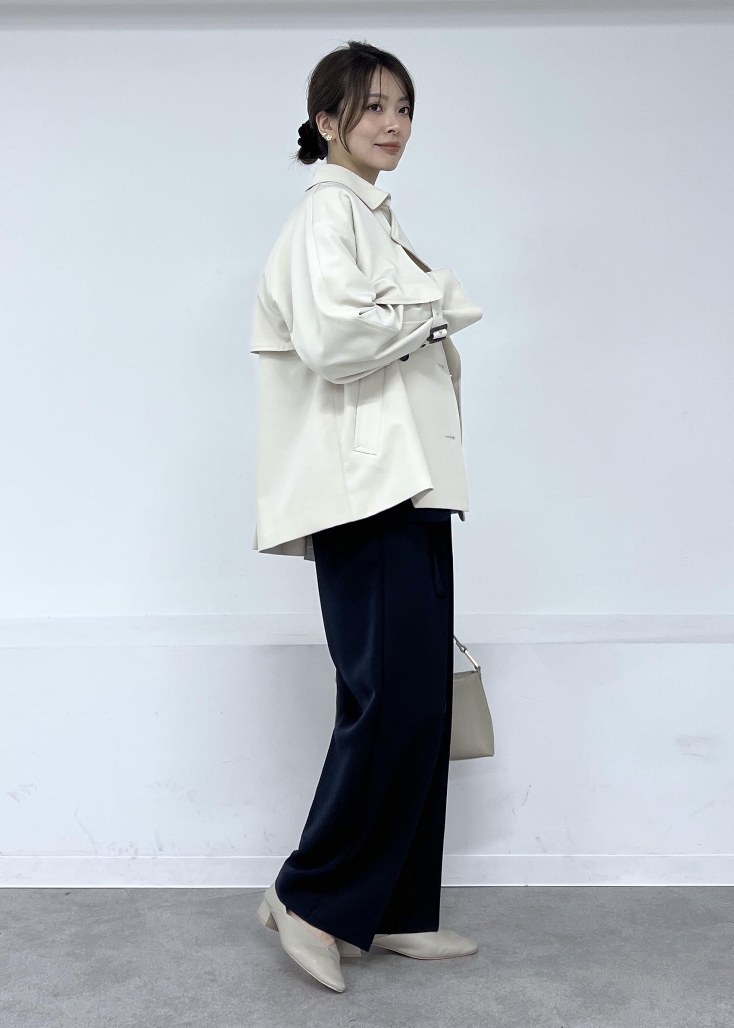 春アウターの定番トレンチコートは、通勤スタイルにもおすすめ。